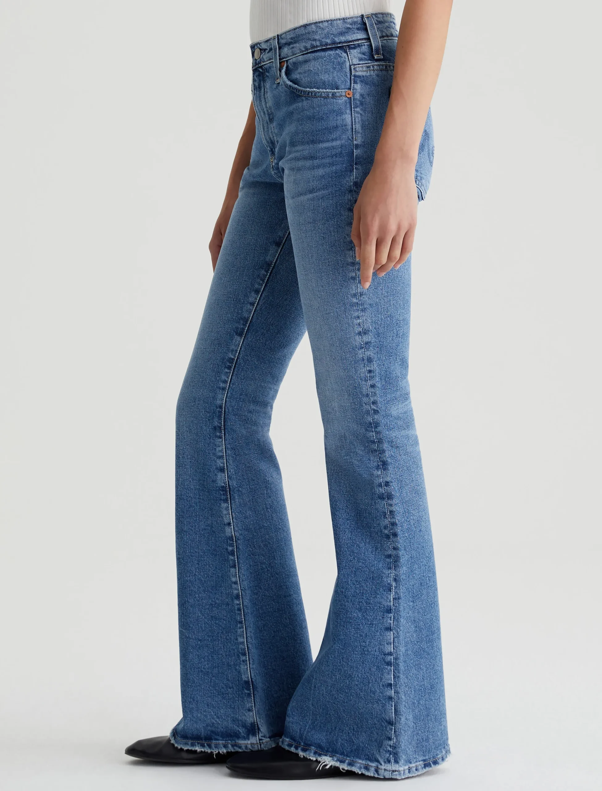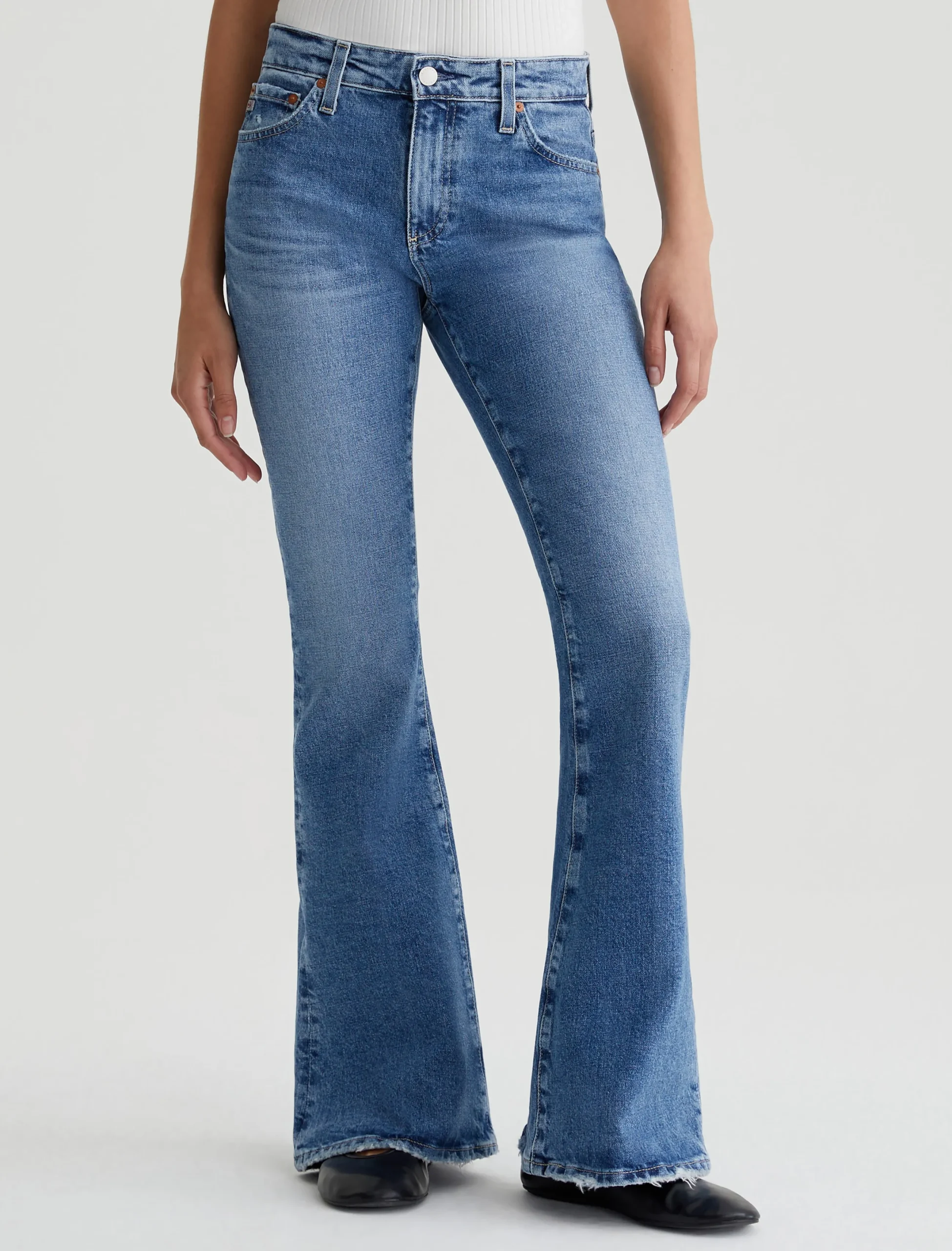 Angeline is a mid-rise jean with a dramatic flared silhouette. It’s featured here in a faded light blue wash featuring slightly frayed hems and subtle distressing at the pockets. These mid-rise flare jeans come in 11 oz. 360° Denim with vintage bi-stretch construction for a flattering, comfortable fit.