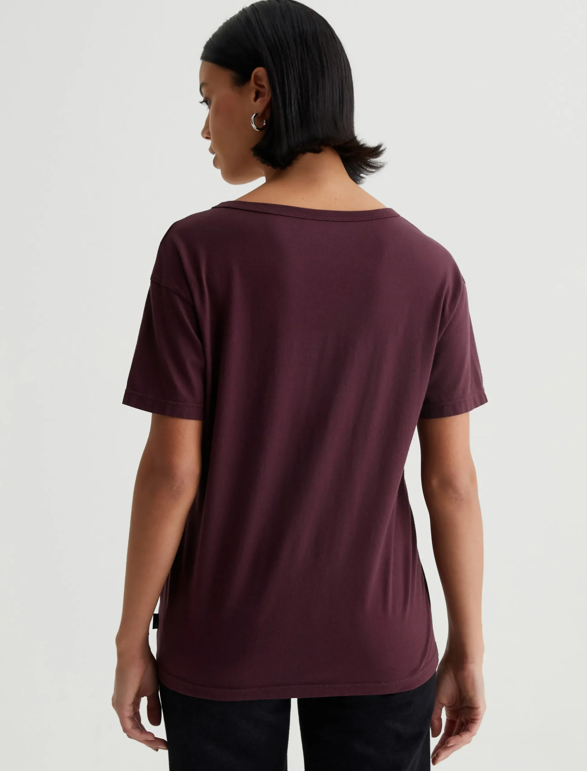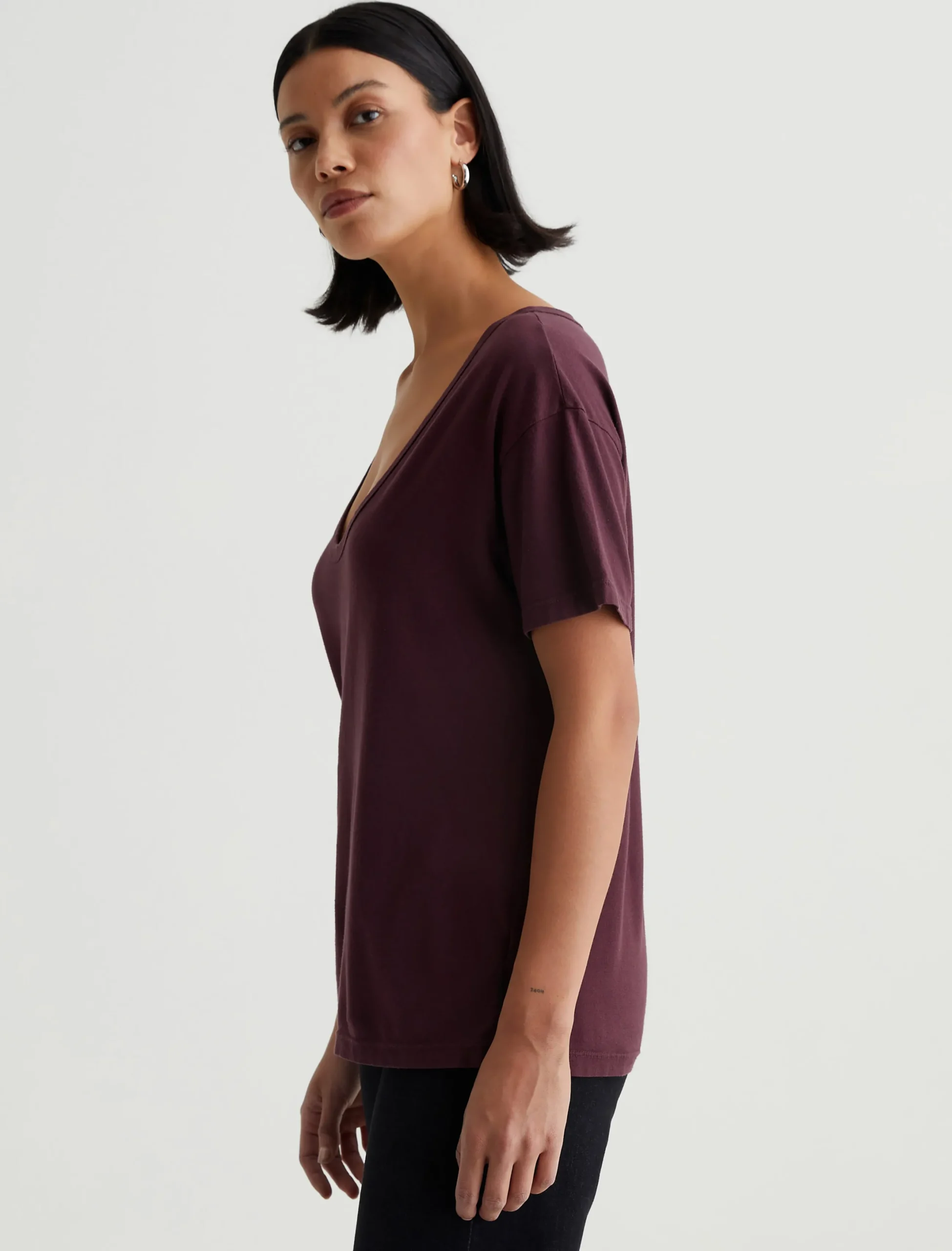 The Aspen tee has a relaxed fit with short sleeves and a flattering U-shaped neckline. Done in a dark purple shade, it’s made from 100% cotton Essential Light Jersey that combines S&Z twist yarns to prevent unnecessary twisting and torquing. The result is a softer, more durable fabric and a long-lasting shape.