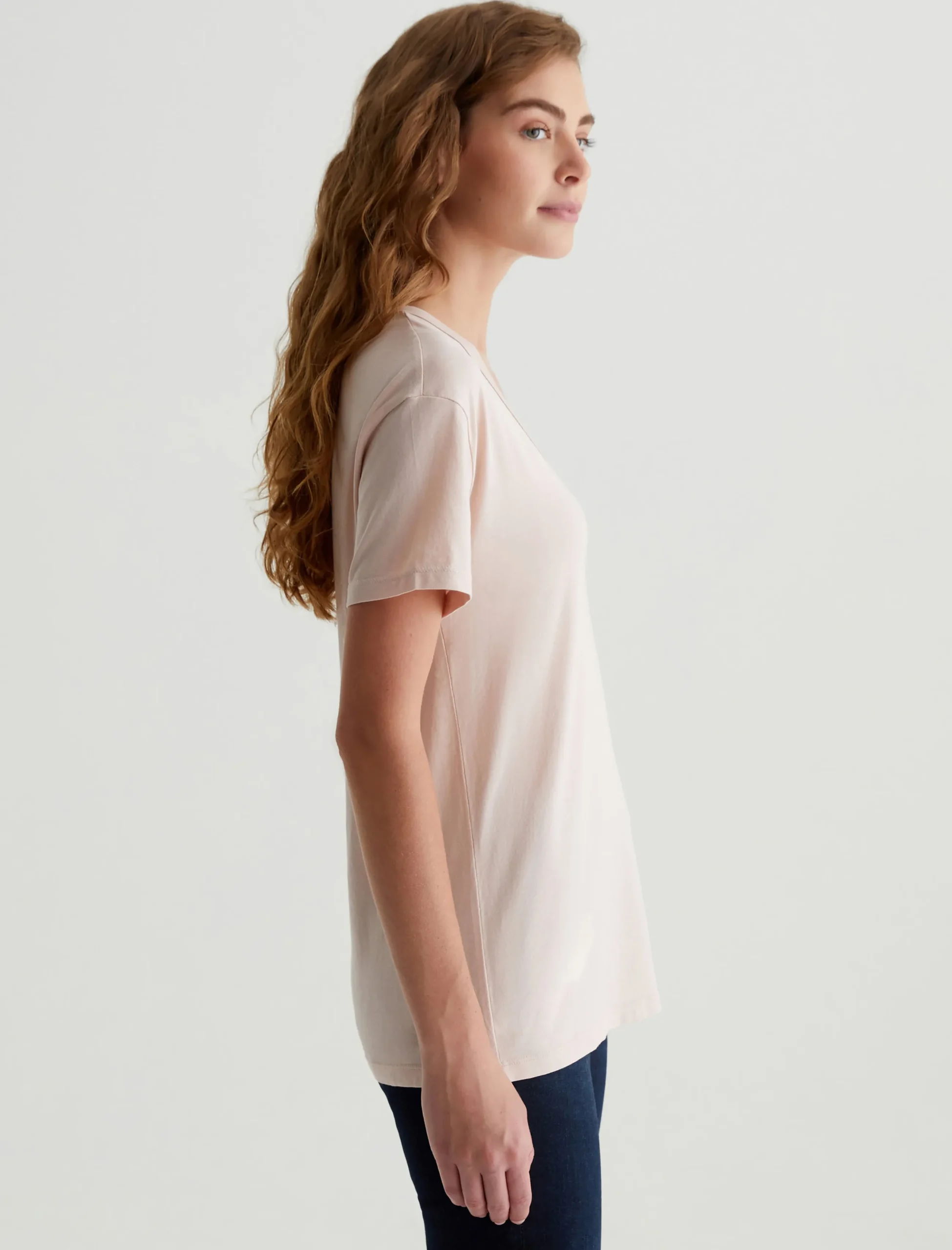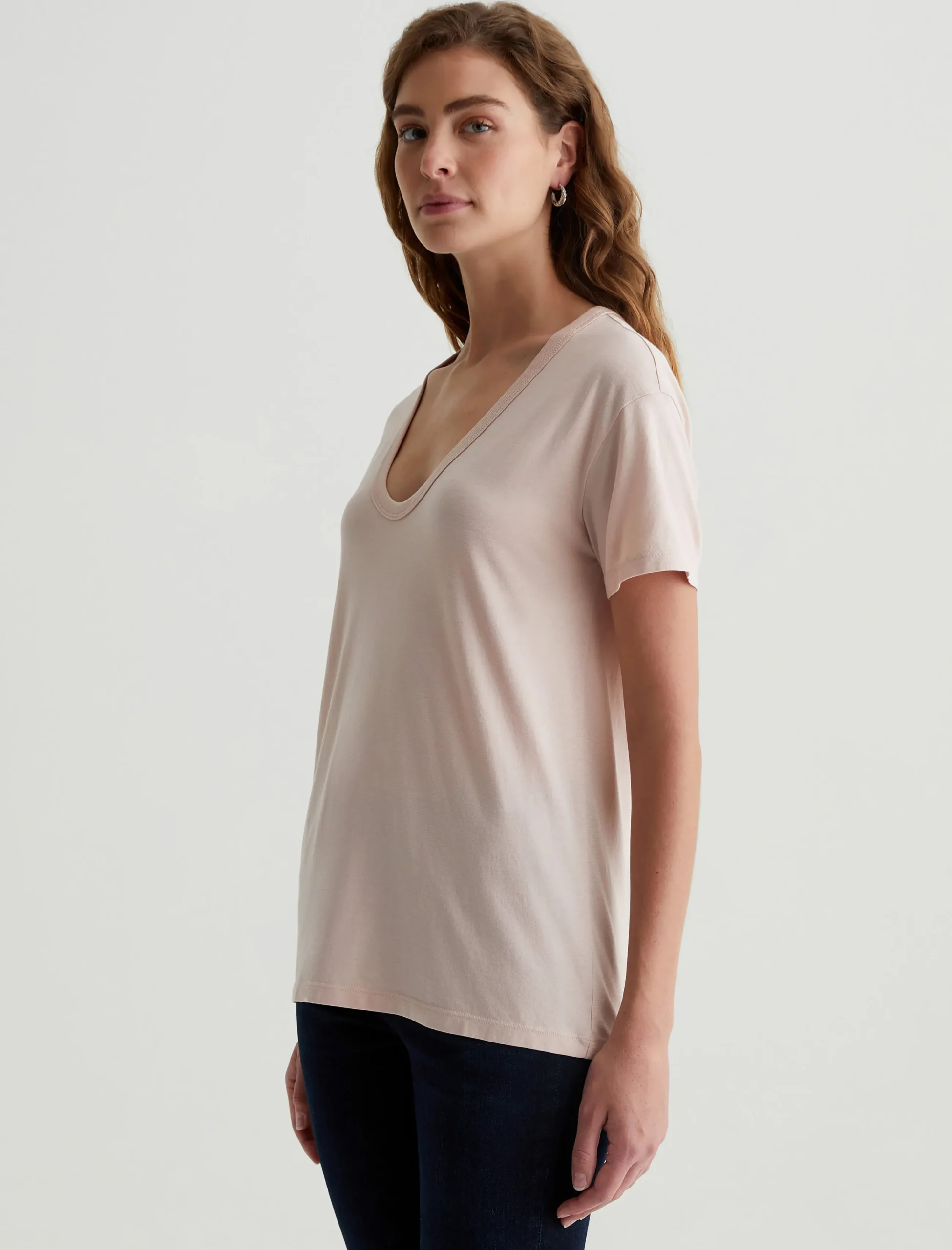 Aspen U-Neck is our classic U-neck tee that has a very easy neckline with a touch of femininity. The vintage pink tee offers a relaxed fit with a slightly dropped shoulder. An easy styling piece to dress up or down with a vintage style jean. Our Jersey Knit offers a luxurious comfort that is unrivaled—knitted with both S-twist and Z-twist yarn to sustain longevity and stability, preventing unnecessary twisting and torquing. During the production process, the S-twist yarn is spun counter-clockwise creating a right-handed twill. The Z-twist yarn works in opposition, spinning clockwise for a left-handed twill. This opposition—when working together—yields a softer, more durable fabrication and gives strength to the yarn making it more difficult to pull apart. Designed in 100% Cotton.