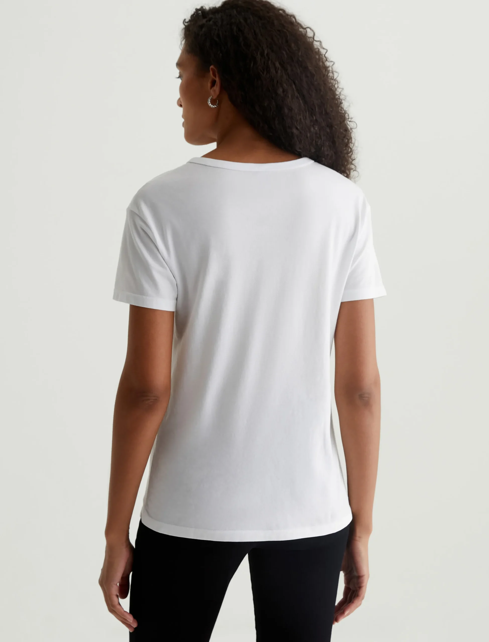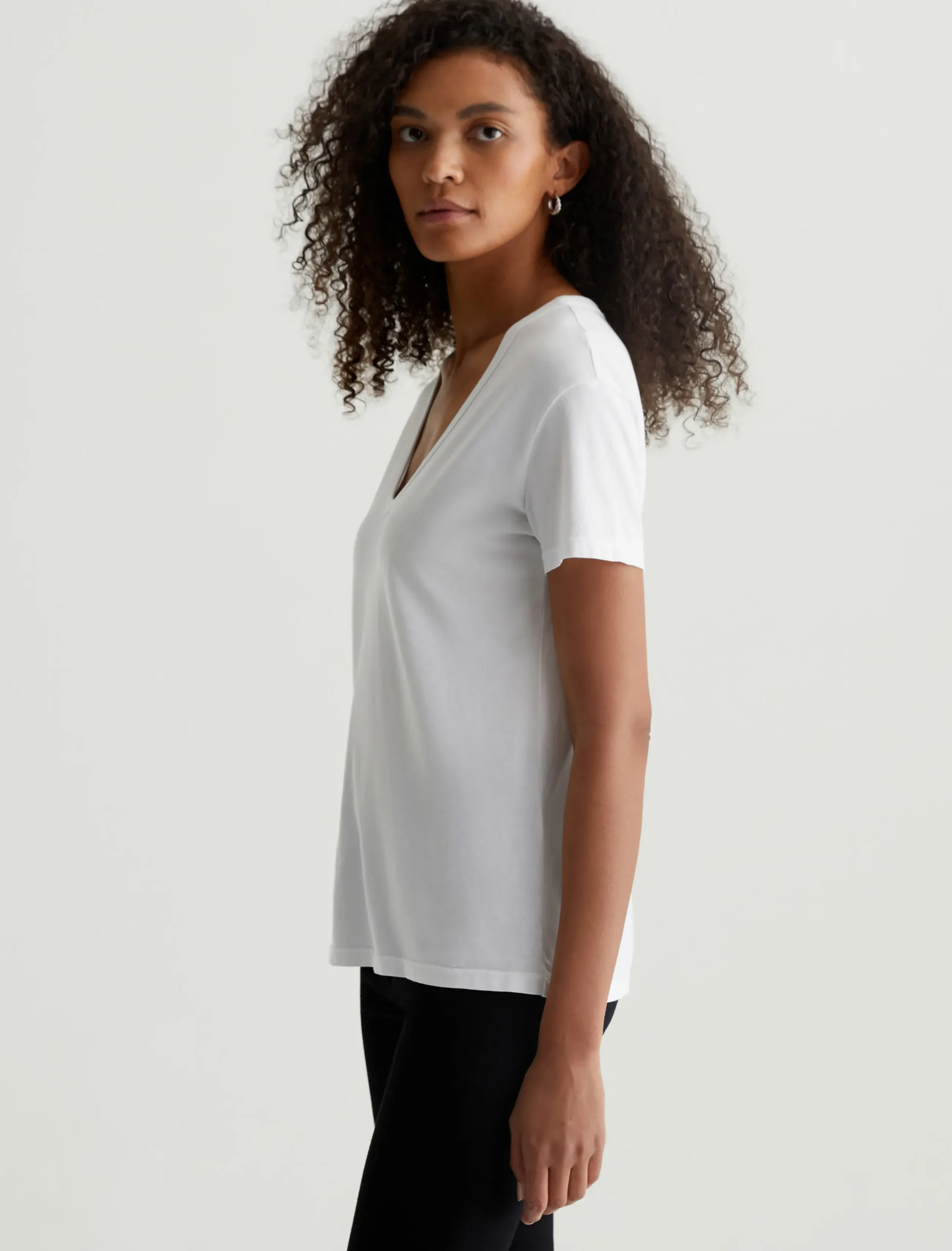 Aspen U-Neck is our classic U-neck tee that has a very easy neckline with a touch of femininity. The white tee offers a relaxed fit with a slightly dropped shoulder. An easy styling piece to dress up or down with a vintage style jean. Our Jersey Knit offers a luxurious comfort that is unrivaled—knitted with both S-twist and Z-twist yarn to sustain longevity and stability, preventing unnecessary twisting and torquing. During the production process, the S-twist yarn is spun counter-clockwise creating a right-handed twill. The Z-twist yarn works in opposition, spinning clockwise for a left-handed twill. This opposition—when working together—yields a softer, more durable fabrication and gives strength to the yarn making it more difficult to pull apart. Designed in 100% Cotton.