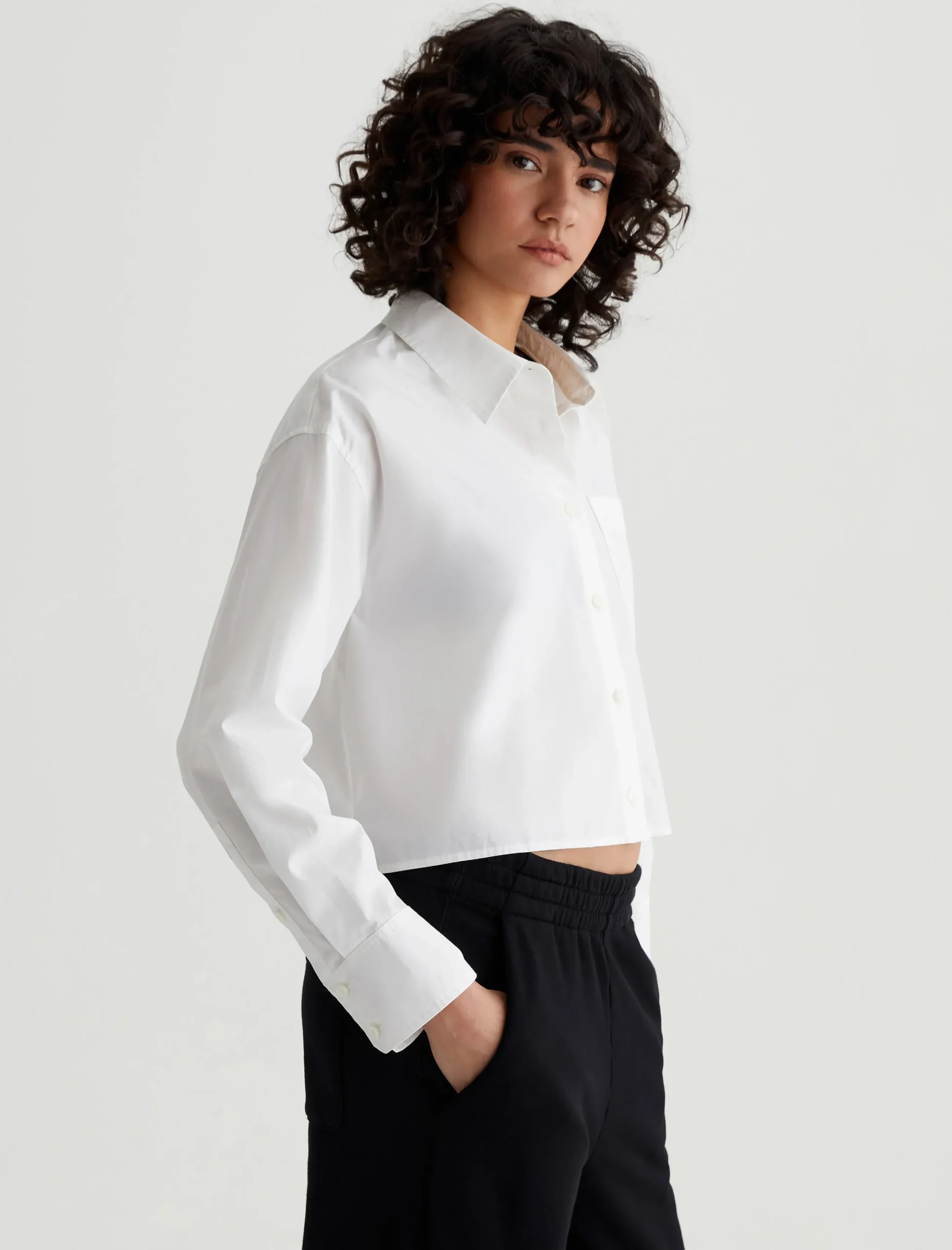 The Aubrey Shirt reimagines a wardrobe essential in modern proportions. Inspired by classic menswear shirting, this long-sleeve button-up shirt has a cropped, boxy fit featuring a chest pocket, side slits, and a back yoke with pleat detailing. It’s relaxed yet refined in white cotton poplin with a cool, crisp feel. Throw it on with jeans, style it against tailored pants, or just about anything in your wardrobe. Tonal embroidered logo at hem.