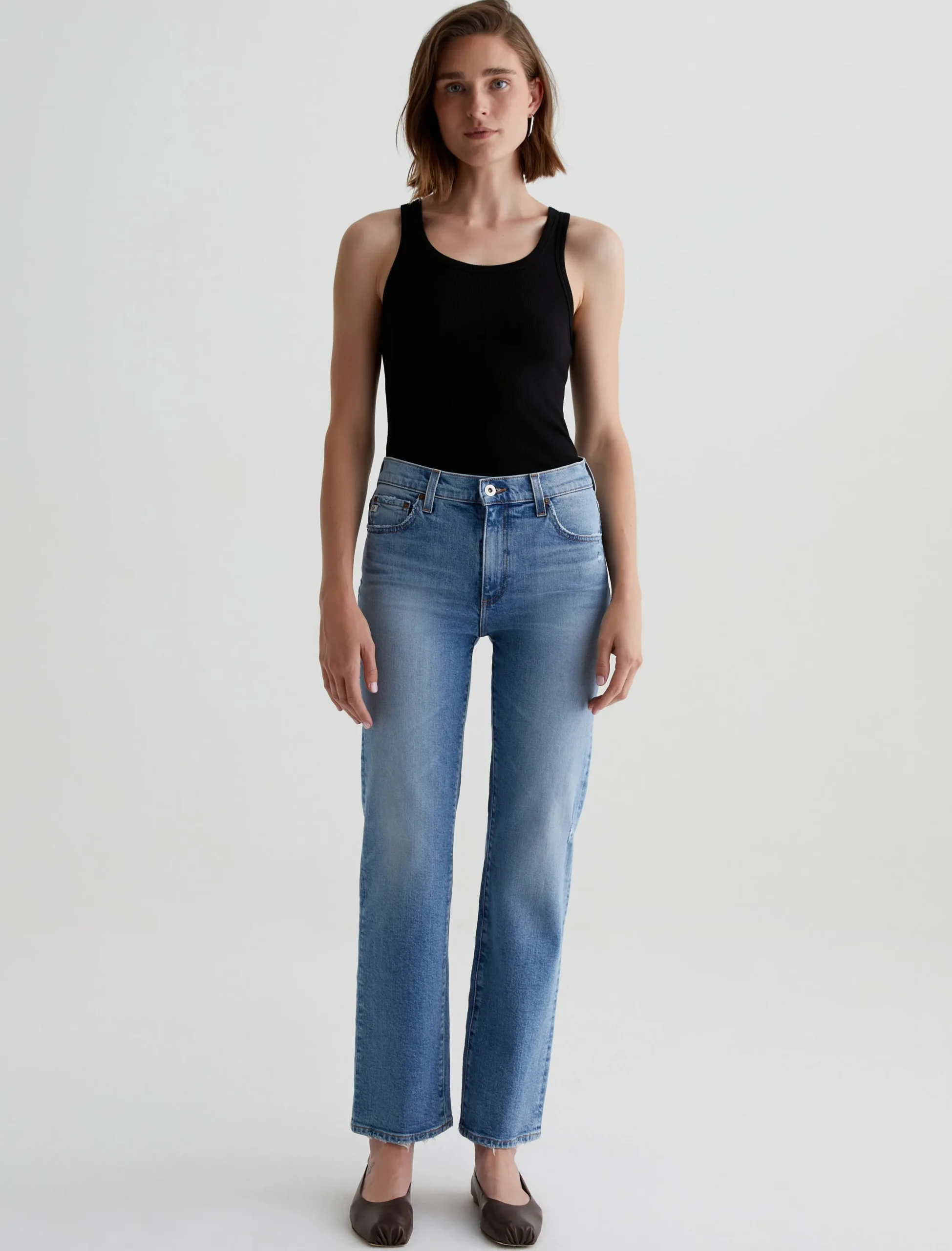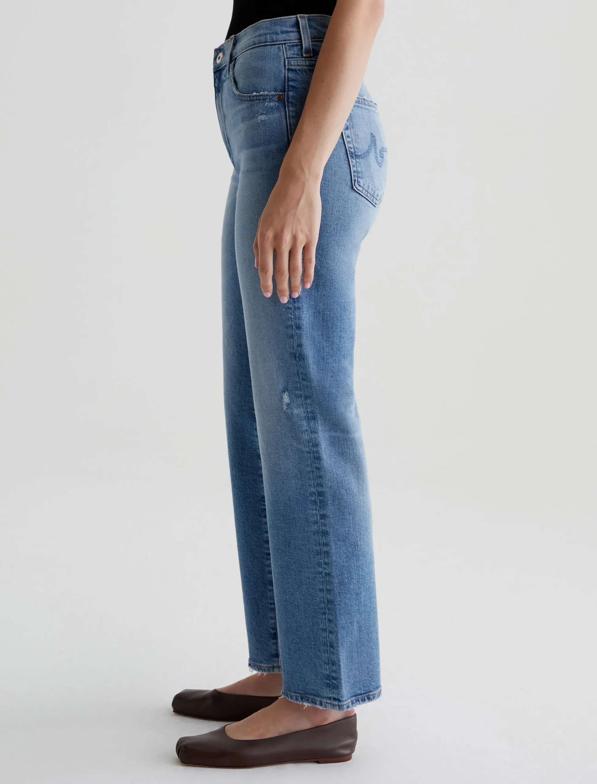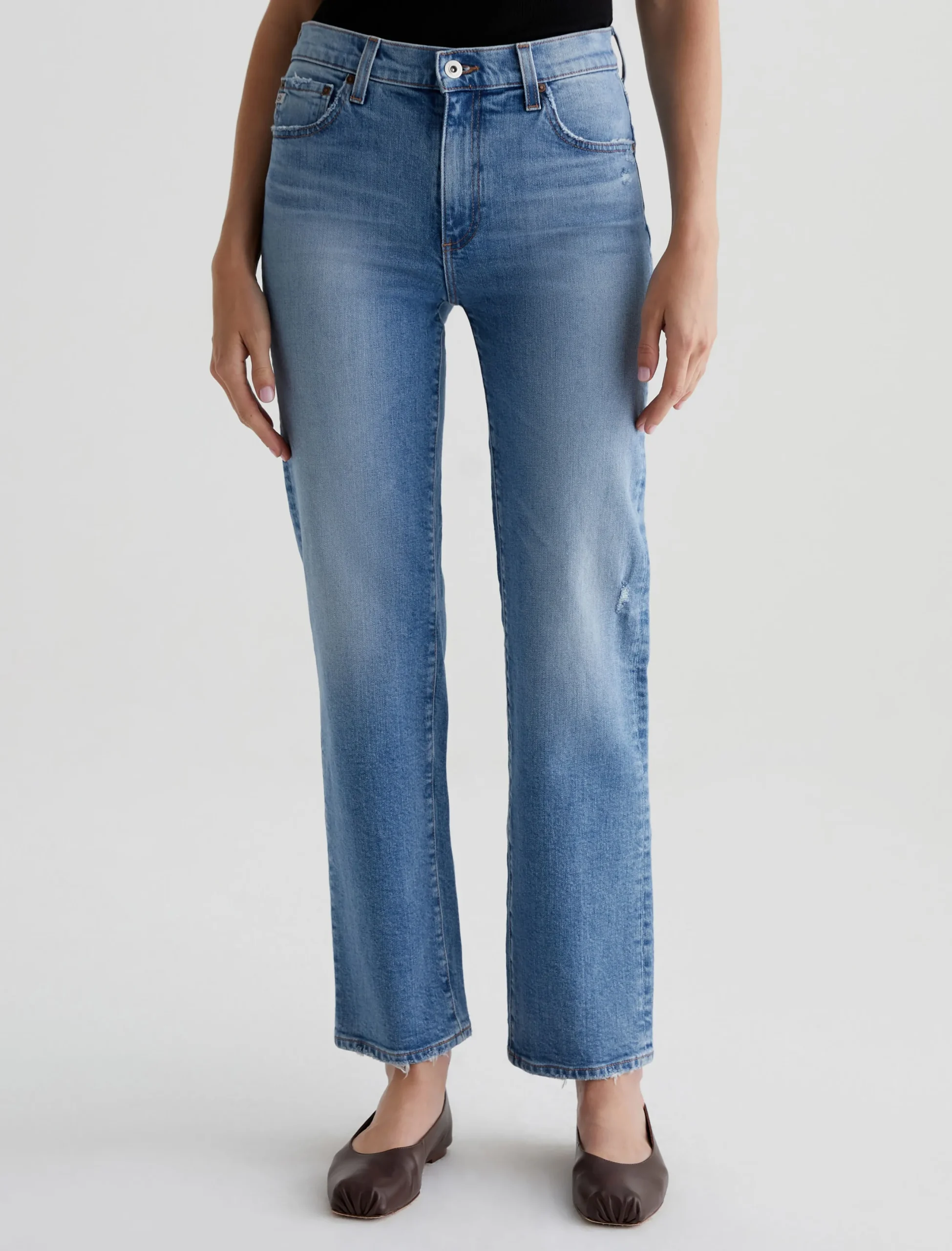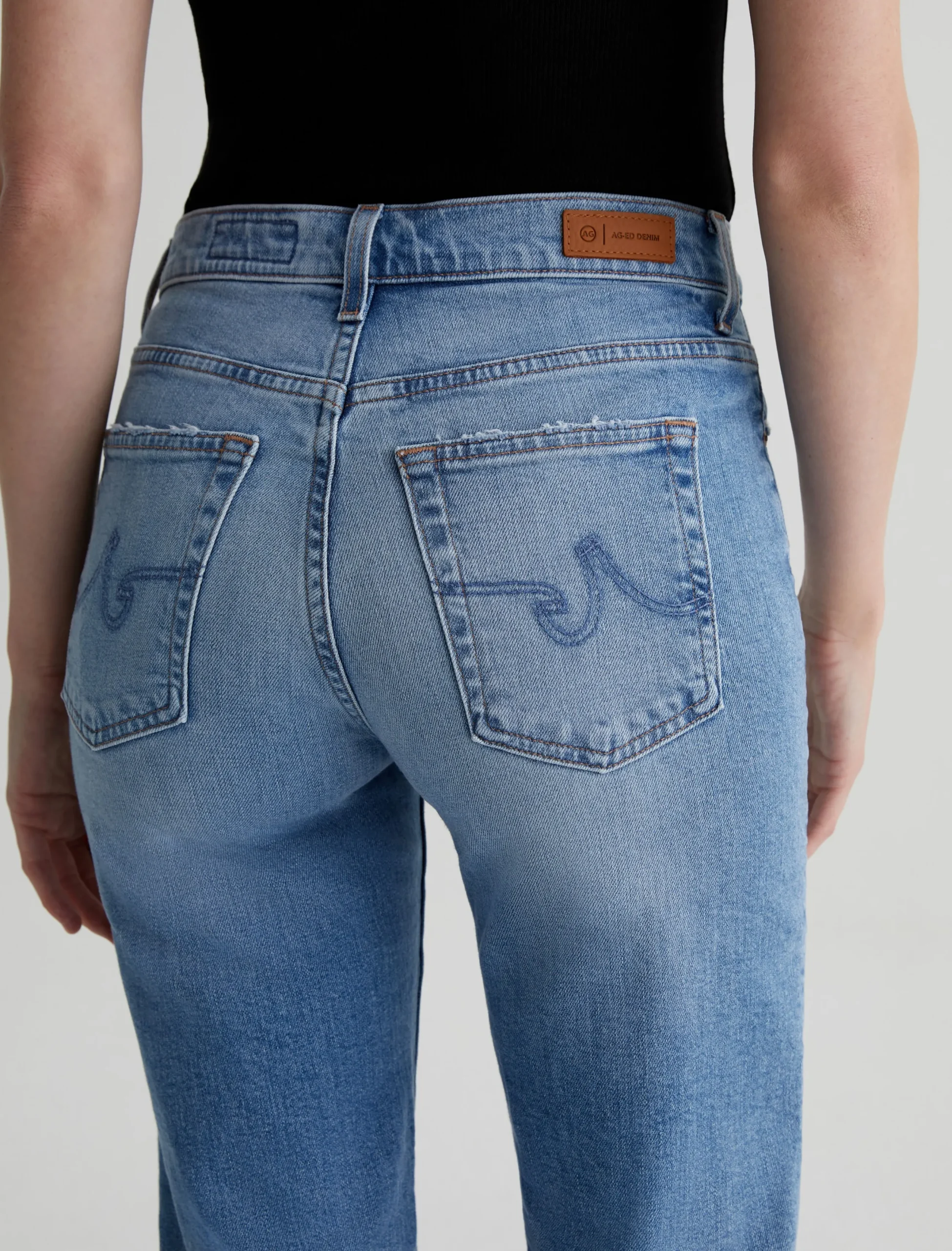 Brinley is our new mid-rise straight fit for women. The five-pocket style sits right at the natural waist and falls to a classic straight-leg silhouette. Crafted from 11.75 oz. Vintage Comfort Stretch Denim, it’s done in a light blue wash that our designers custom-developed to replicate the lived-in details of authentic vintage jeans. Fading, worn edges, busted hems, and a touch of distressing near the pockets create the 18-year AG-ed™ Denim character.