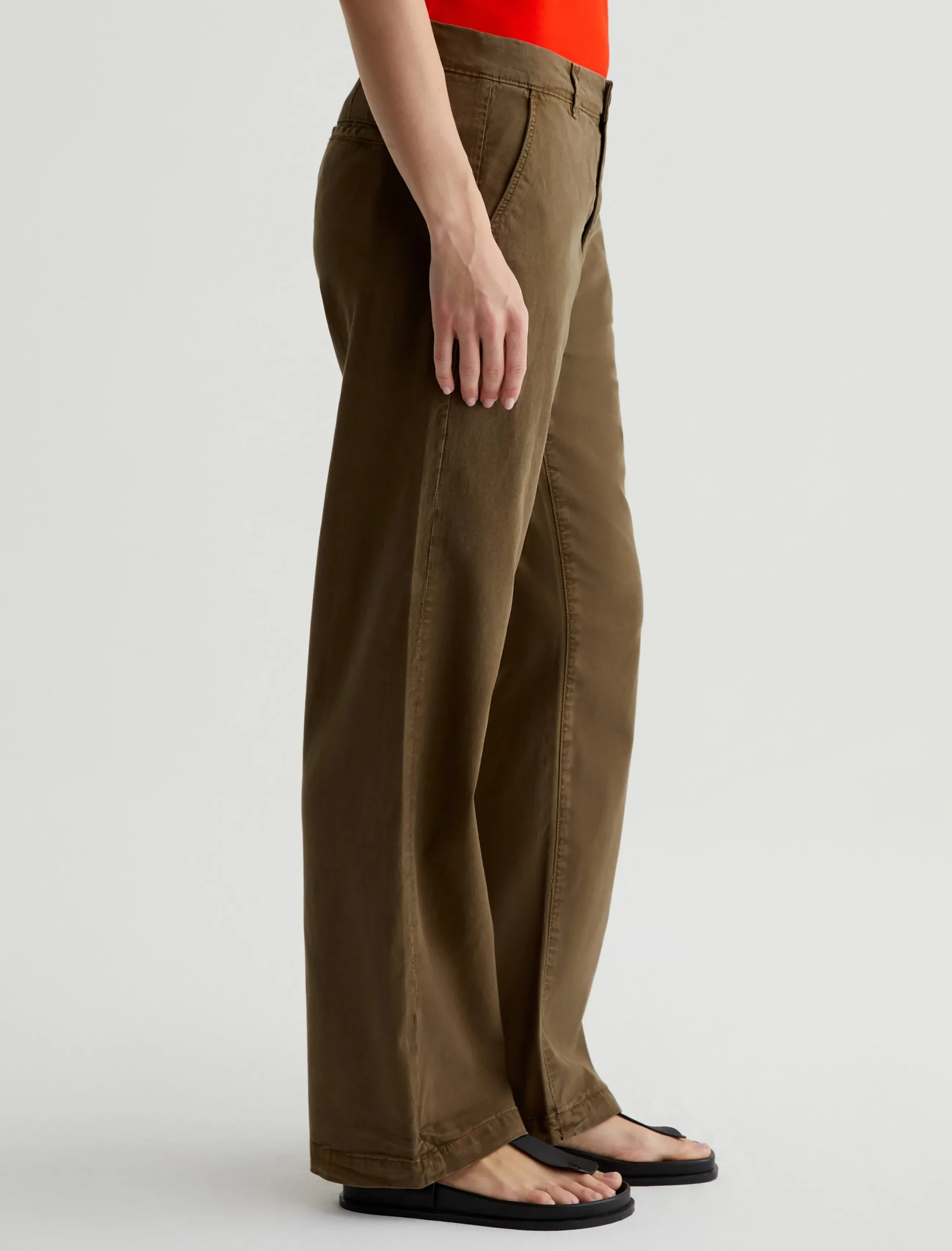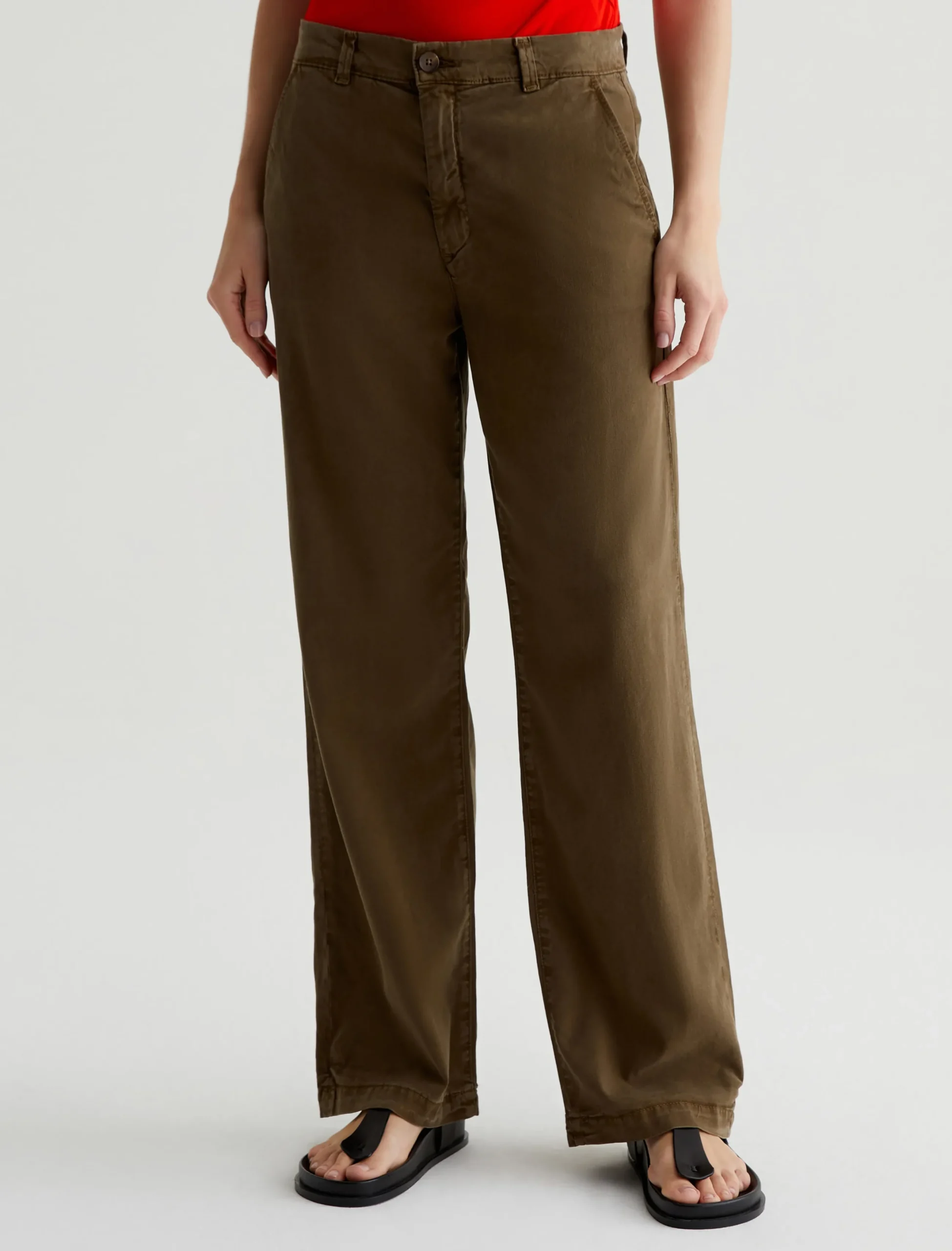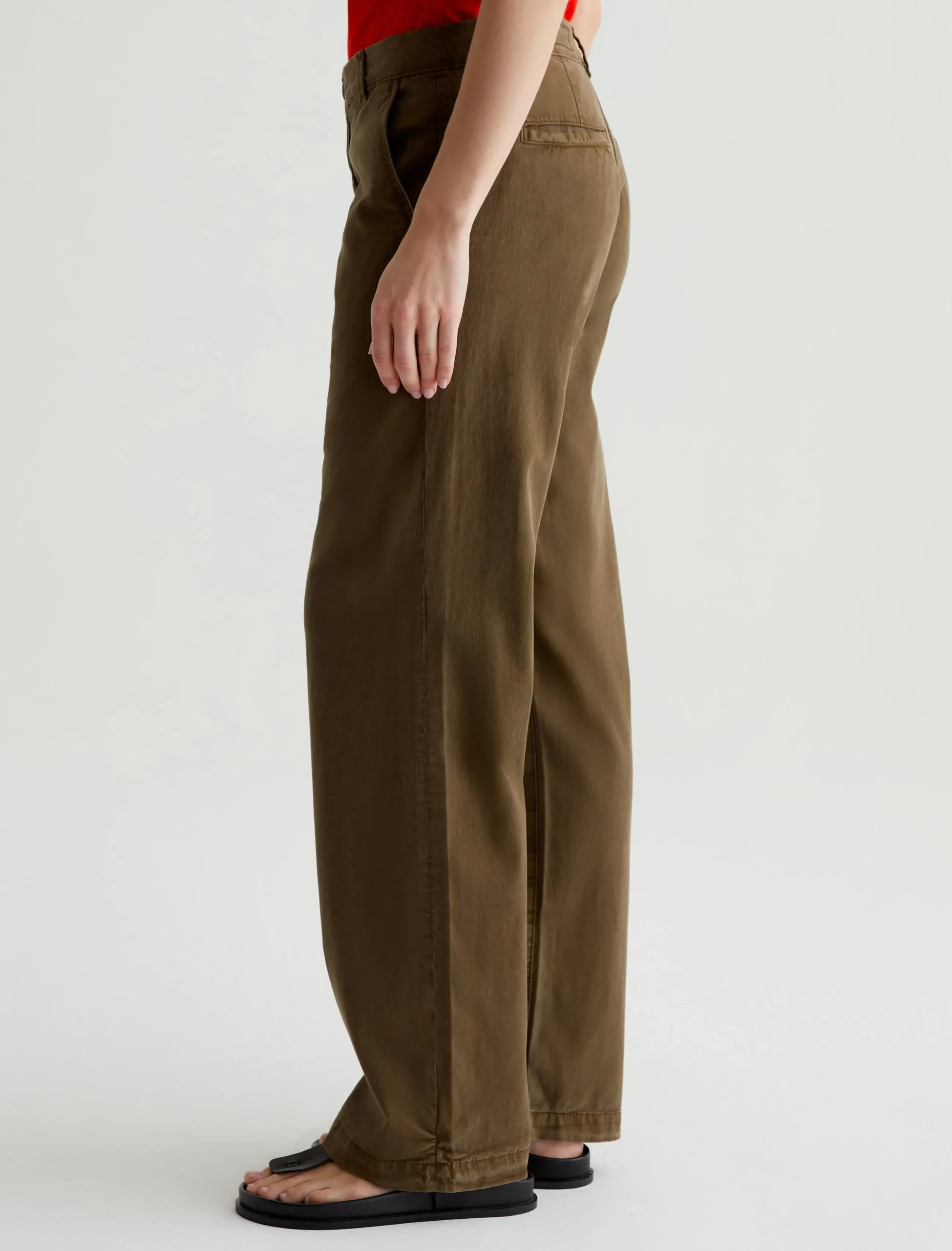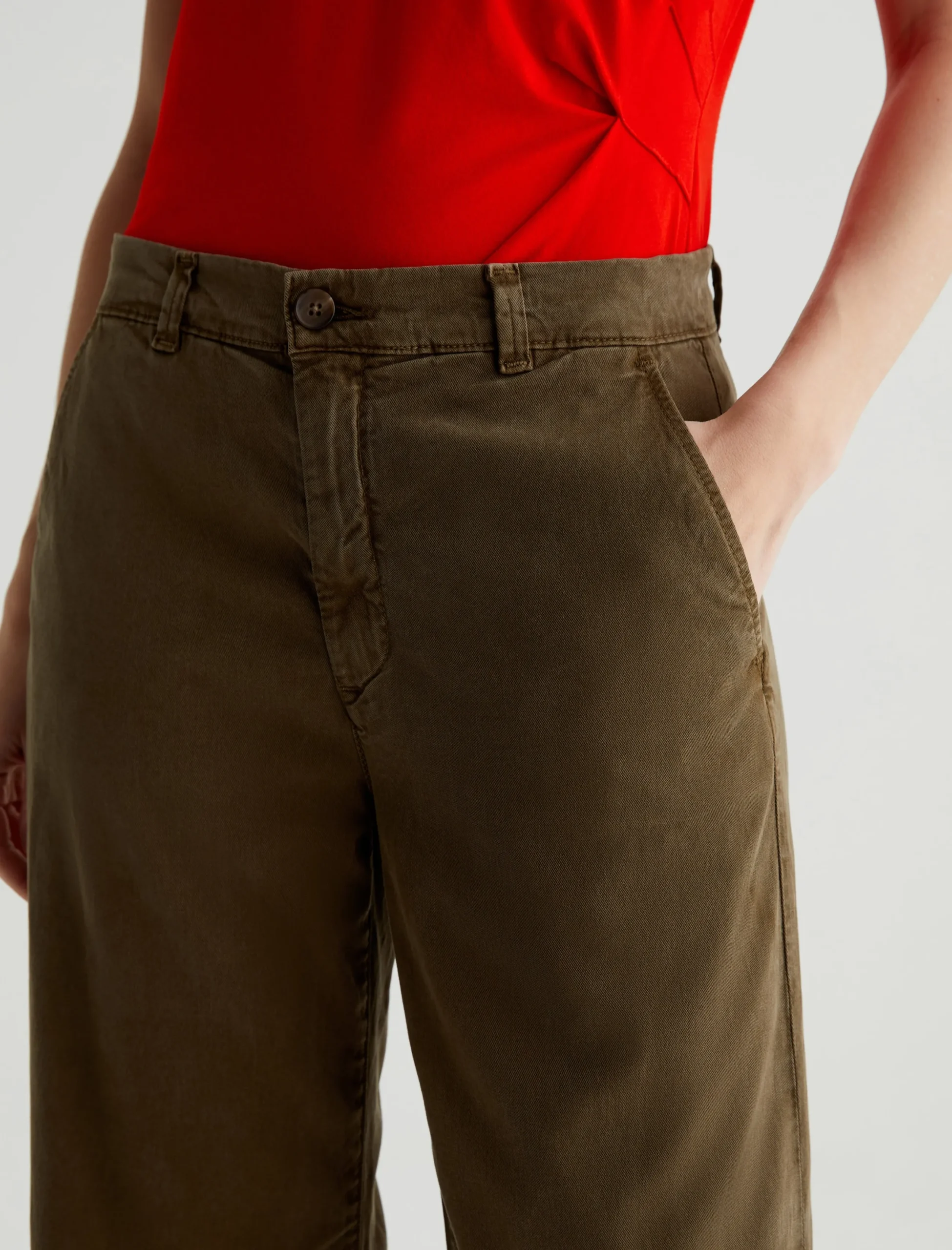 Our best-selling Caden trouser, updated in an easygoing straight-leg silhouette. Cut for a relaxed fit at the hips, these women’s tailored pants are made from soft, lightweight Stretch Cotton Tencel Twill featuring a sulfur-dyed army green. The pair has slant front pockets and welt pockets at the back.