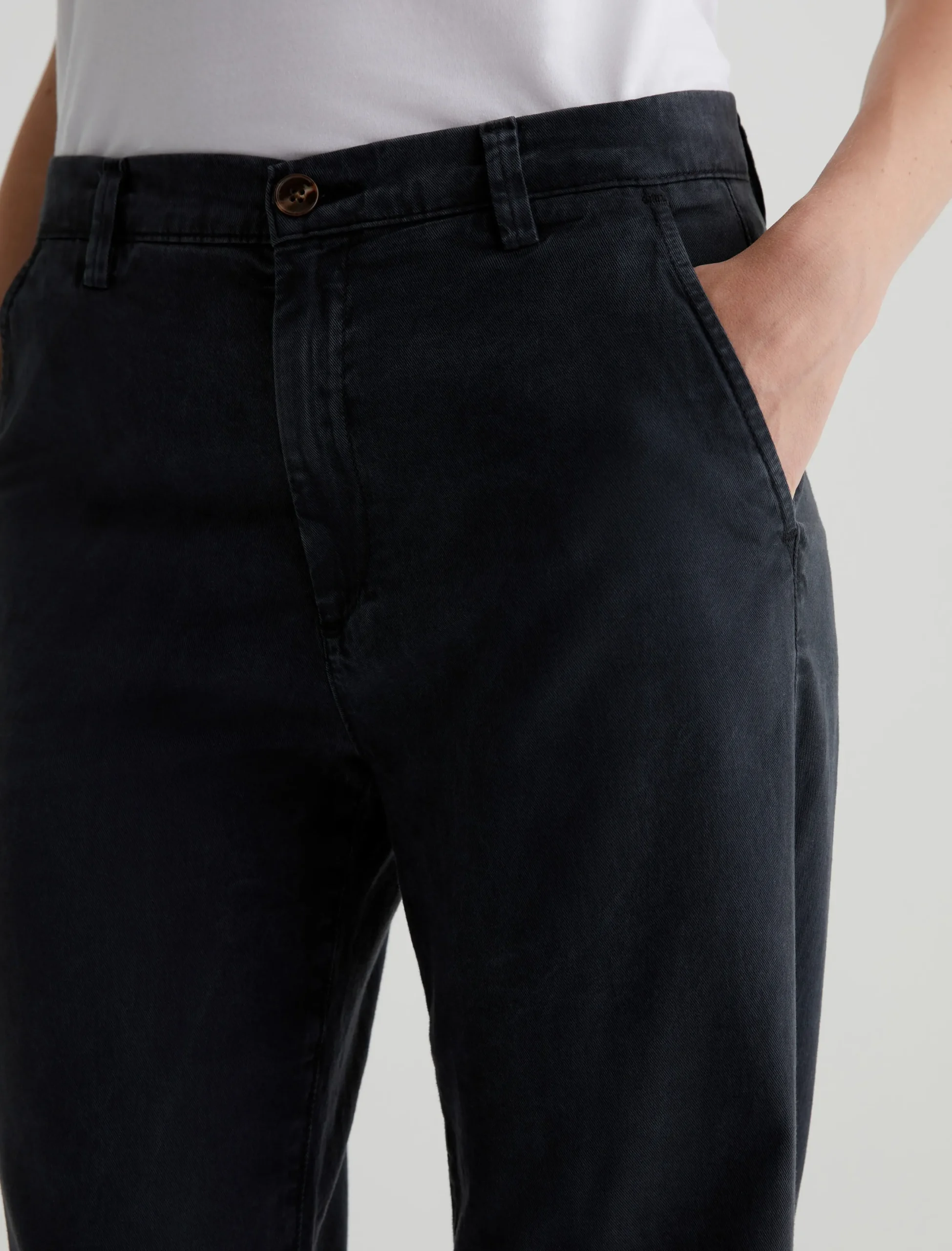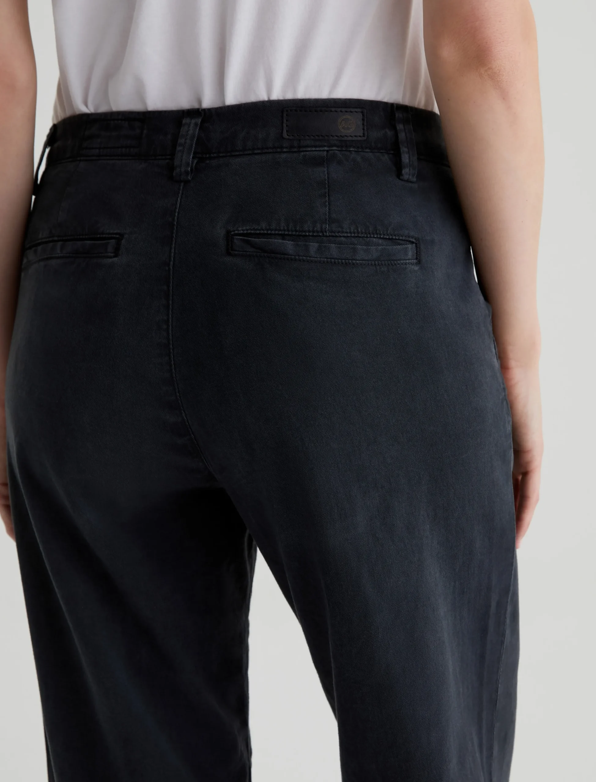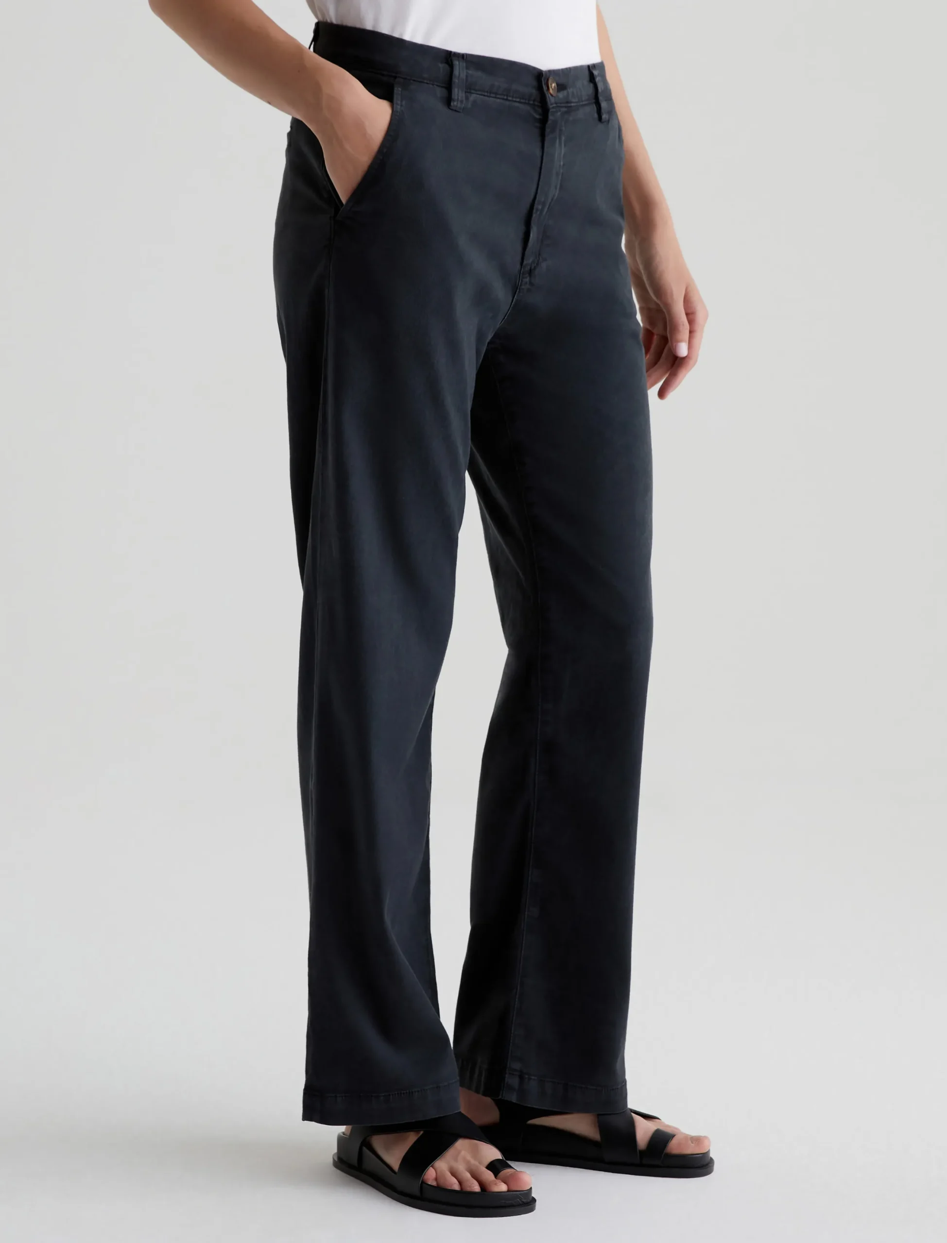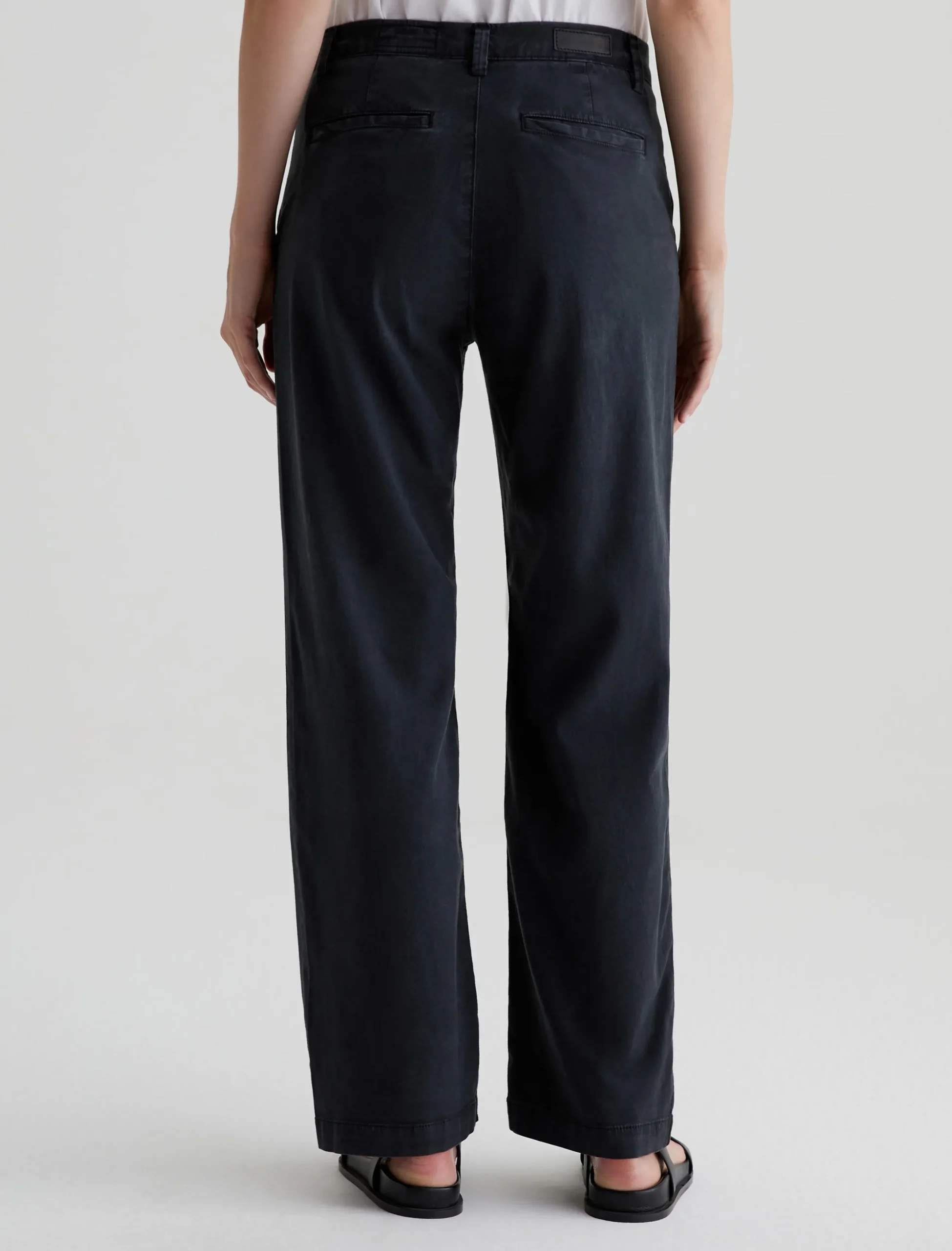 Our best-selling Caden trouser, updated in an easygoing straight-leg silhouette. Cut for a relaxed fit at the hips, these women’s tailored pants are made from soft, lightweight Stretch Cotton Tencel Twill featuring a sulfur-dyed black shade. The pair has slant front pockets and welt pockets at the back.