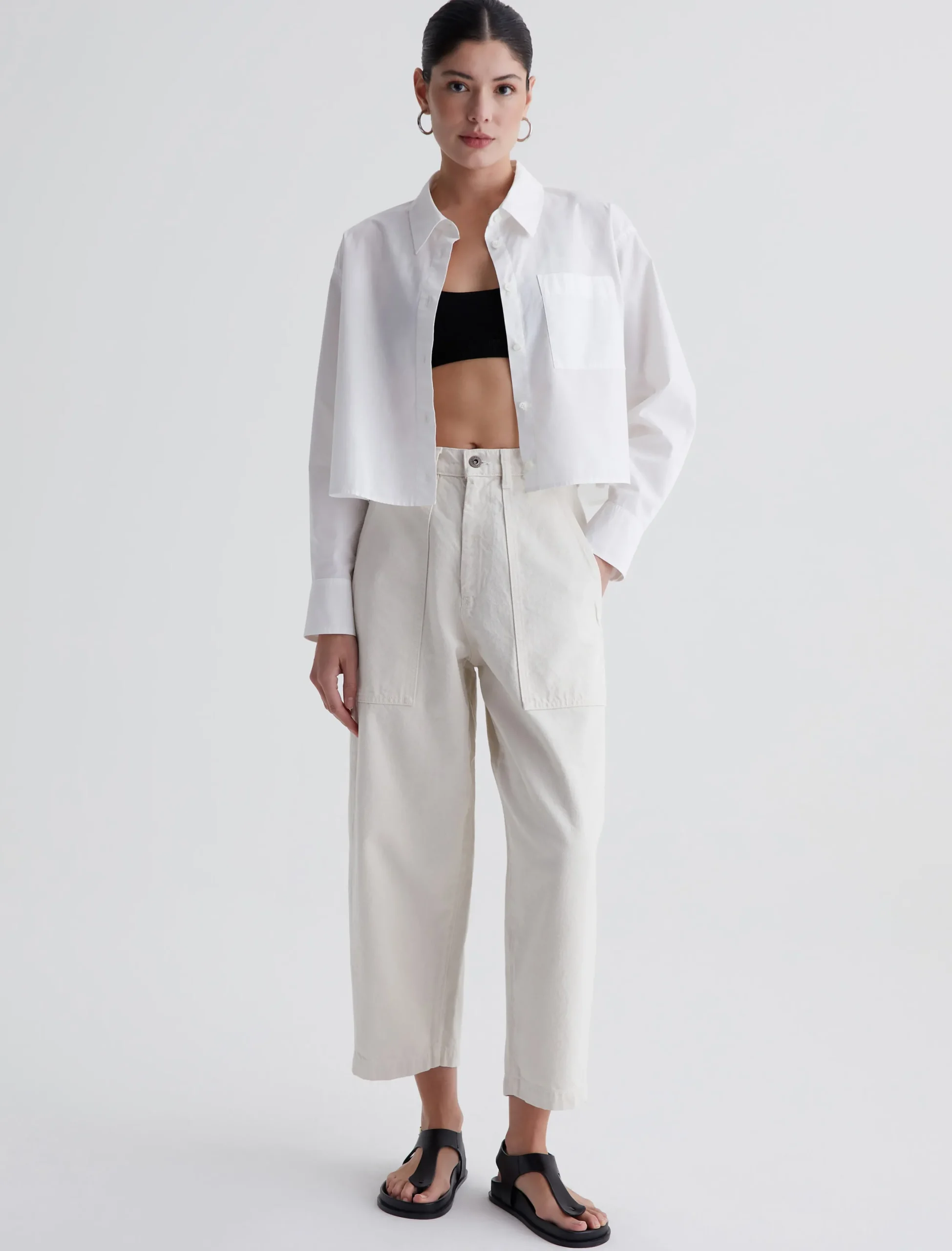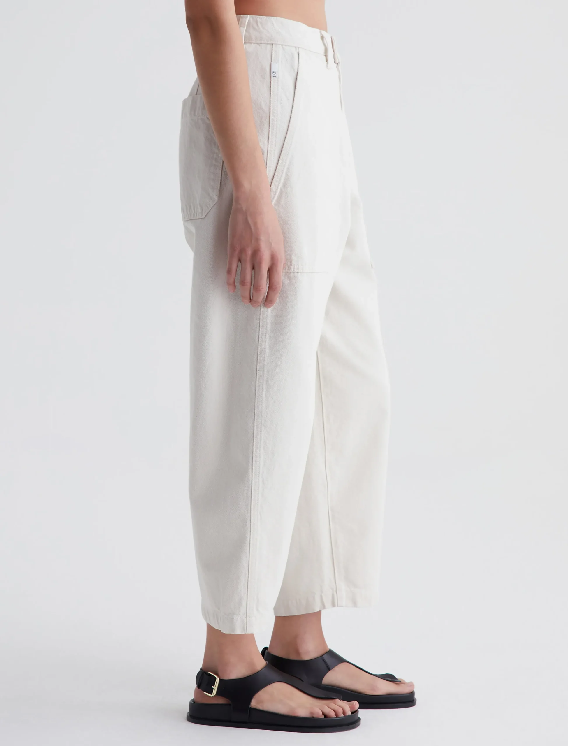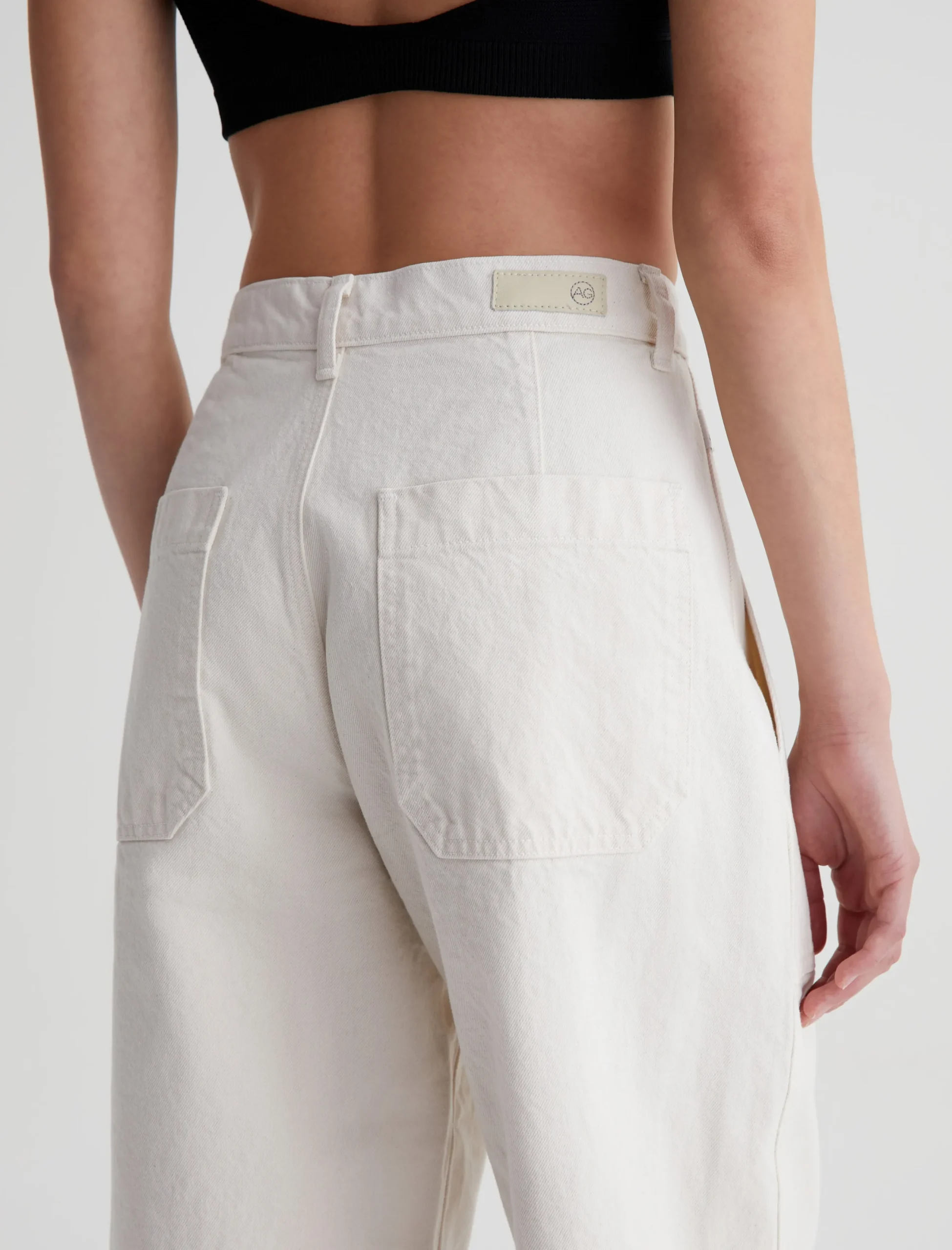 The Camille utility pant features a barrel-leg silhouette with an ultra-high waist. Made from 100% cotton Natural Bull Denim in soft white, this style has workwear-inspired front pockets and a loose, cropped fit through the legs. Complete with roomy patch pockets at the back.