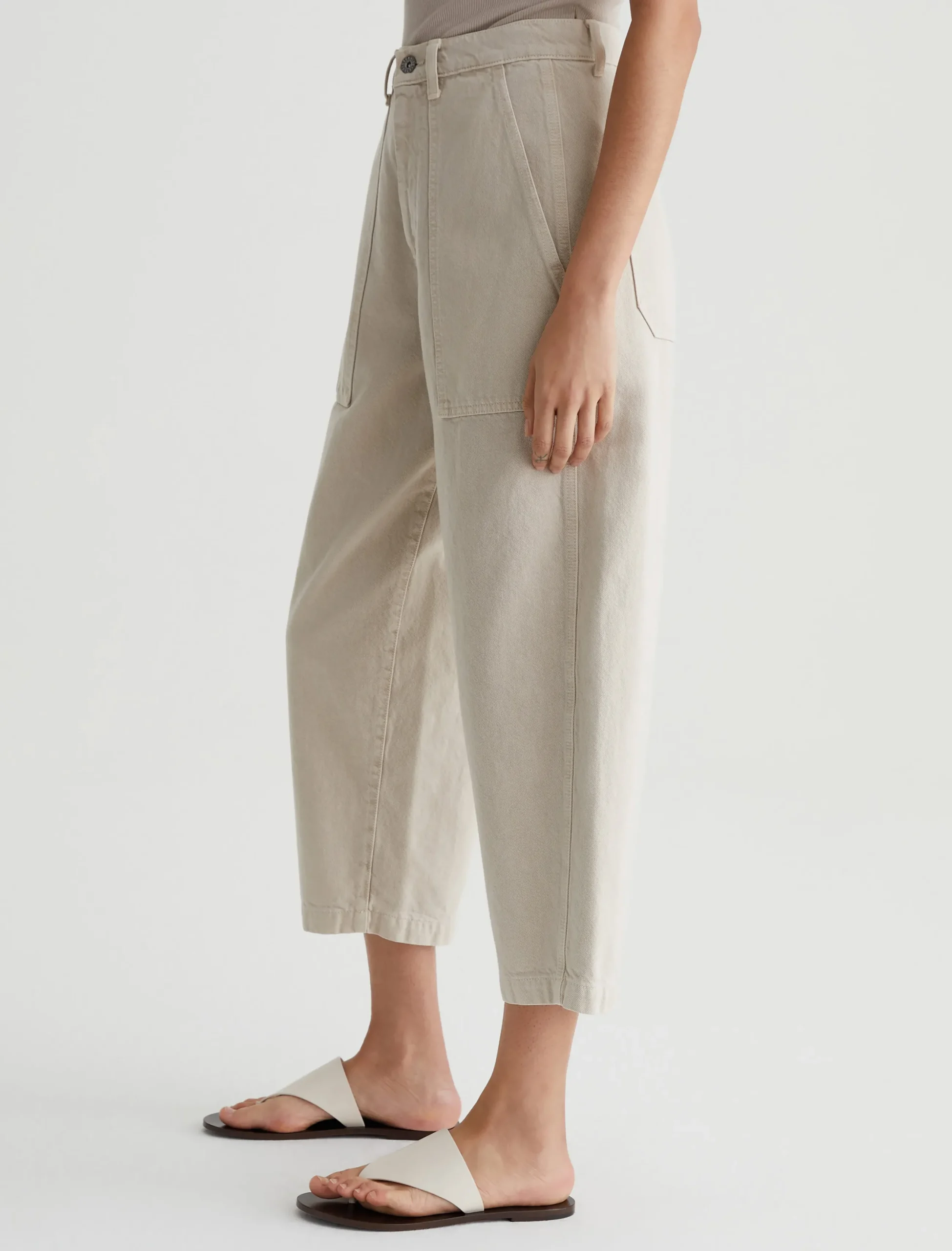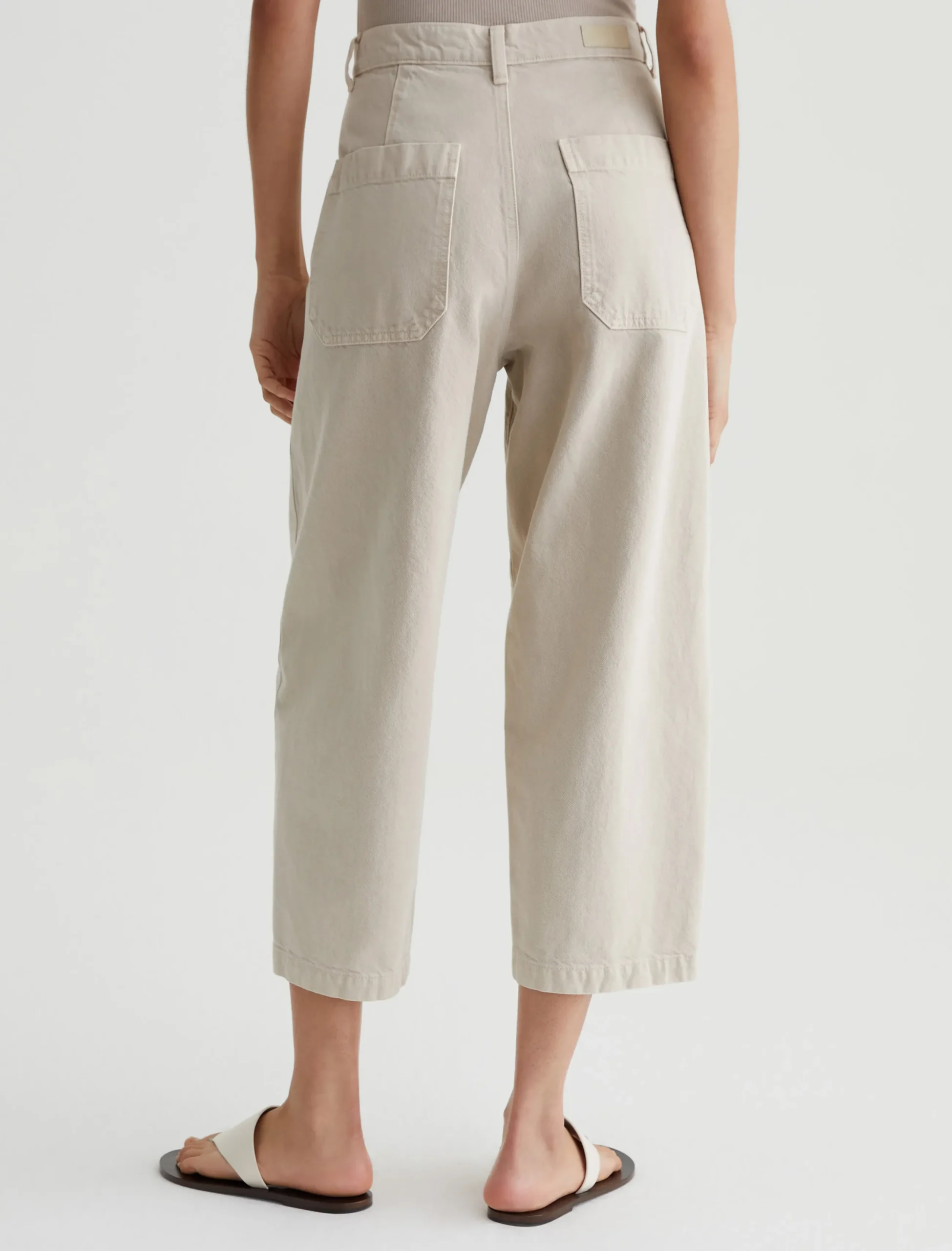 The Camille utility pant features a barrel-leg silhouette with an ultra-high waist. Made from 100% cotton Natural Bull Denim in a sulfur-dyed pale beige shade, this style has workwear-inspired front pockets and a loose, cropped fit through the legs. Complete with roomy patch pockets at the back.