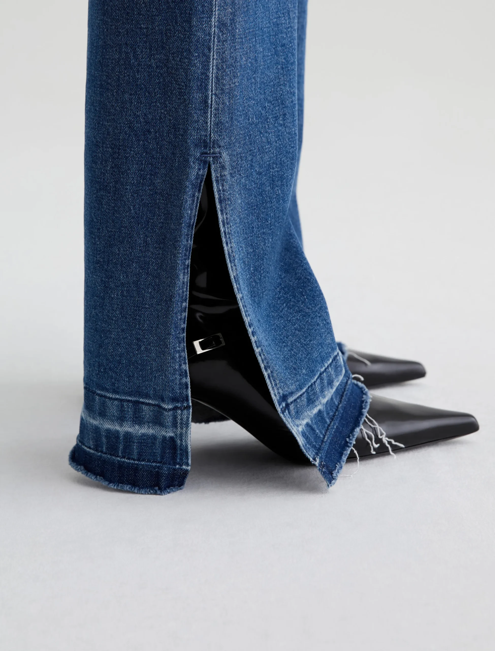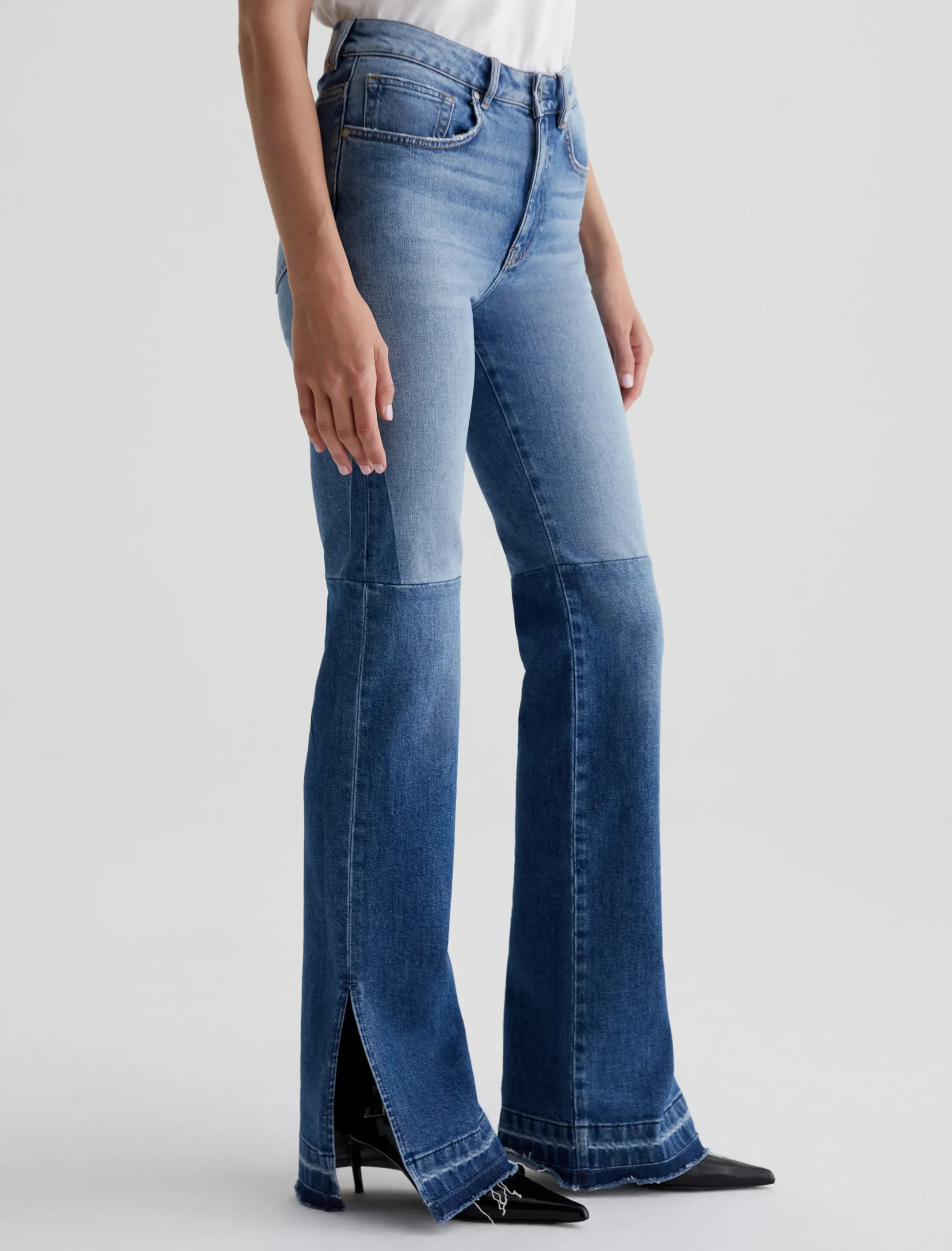 The Cannes jean is a ’70s-inspired bootcut silhouette with faded two-tone denim paneling at the legs. The pair fits close through the knee before kicking into flared let-down hems with split sides. Whiskering and worn pocket edges add a weathered finish.
