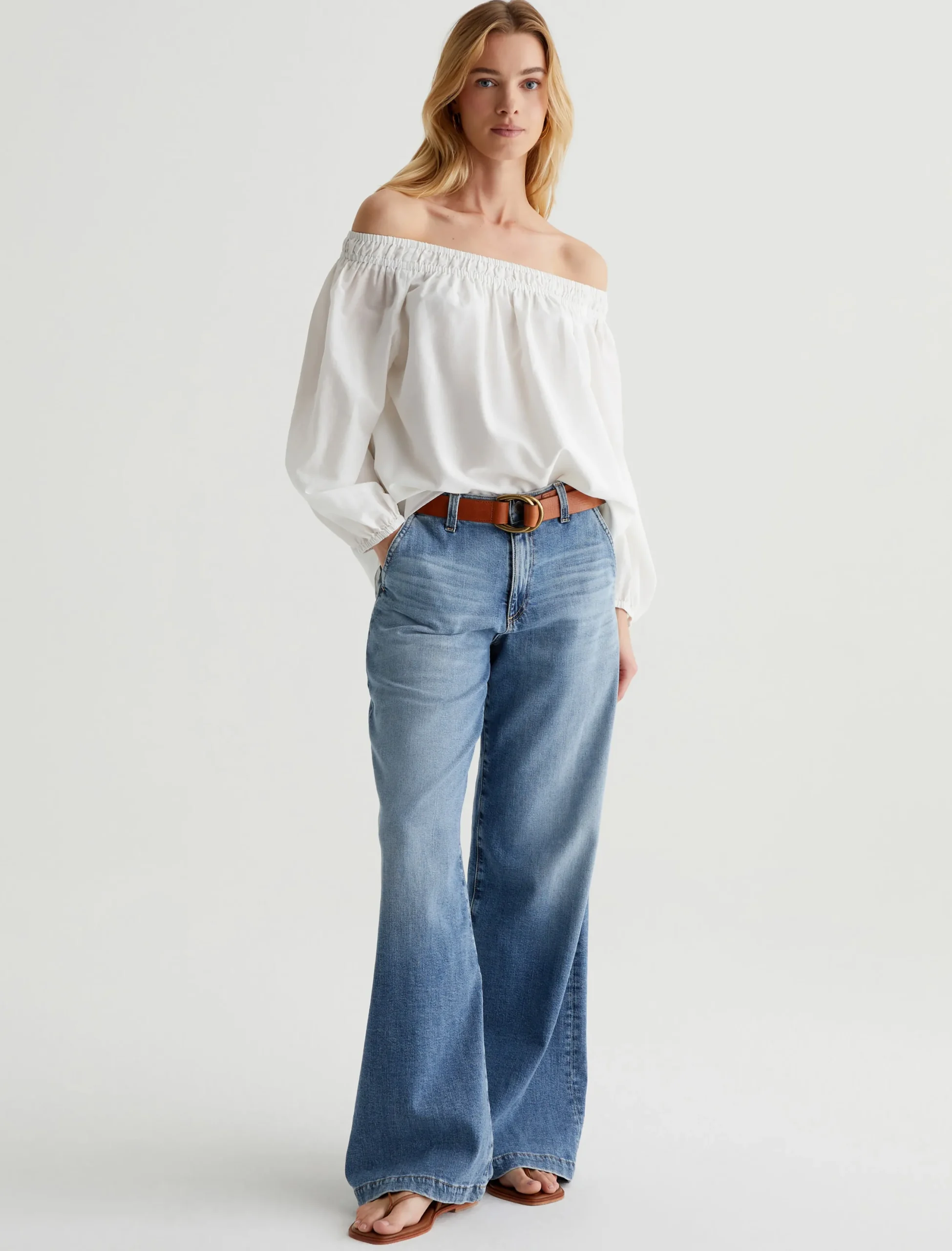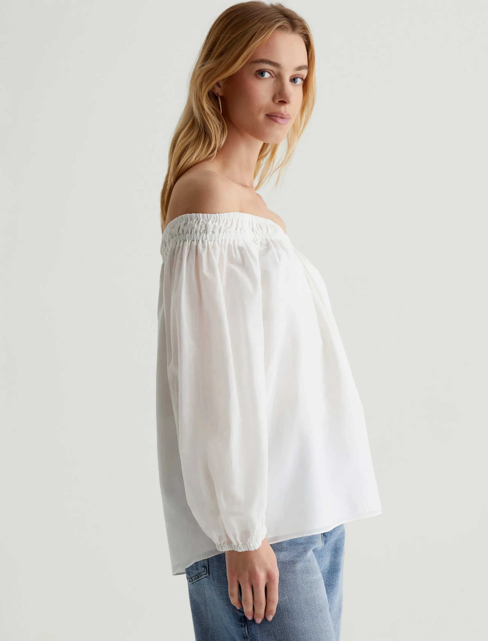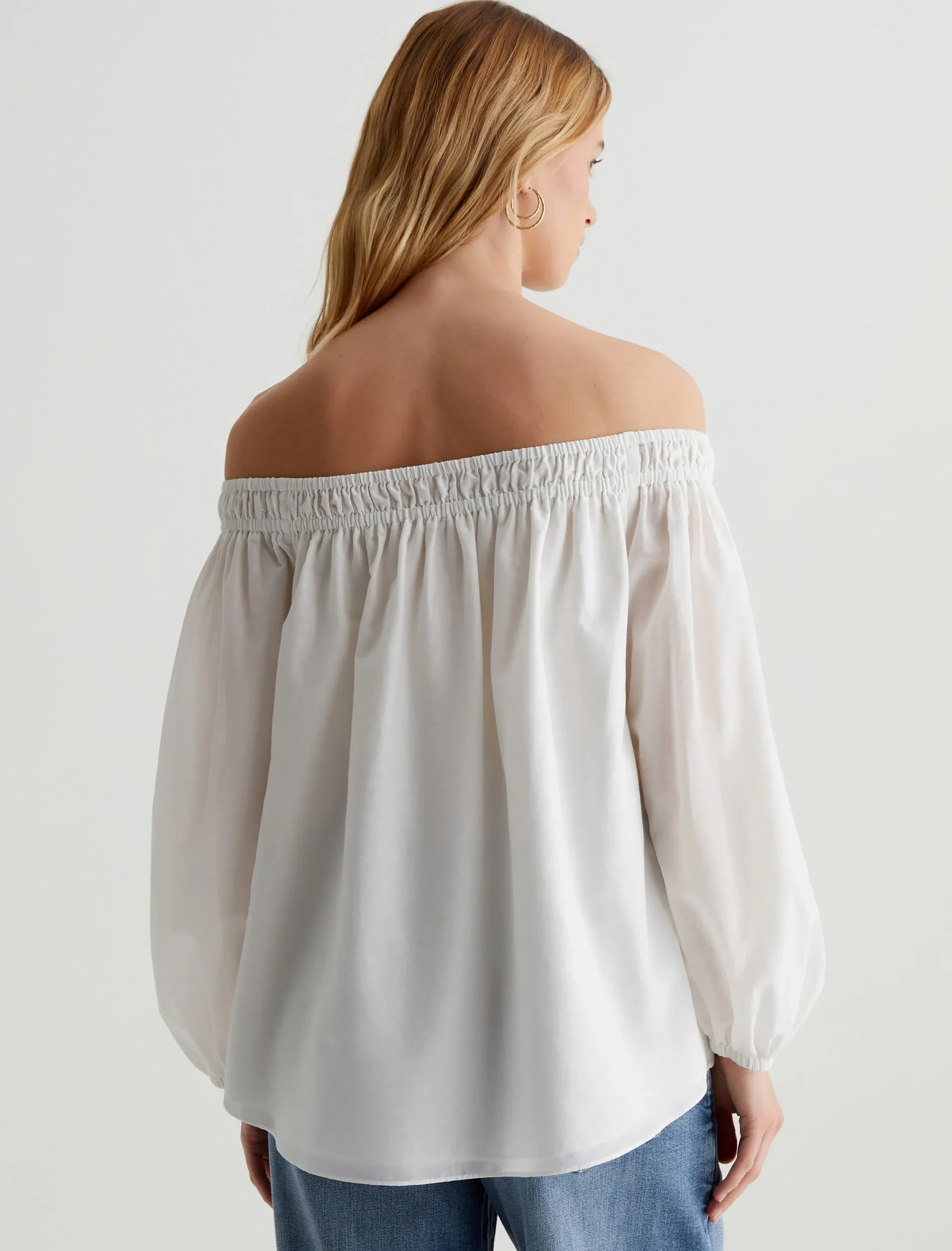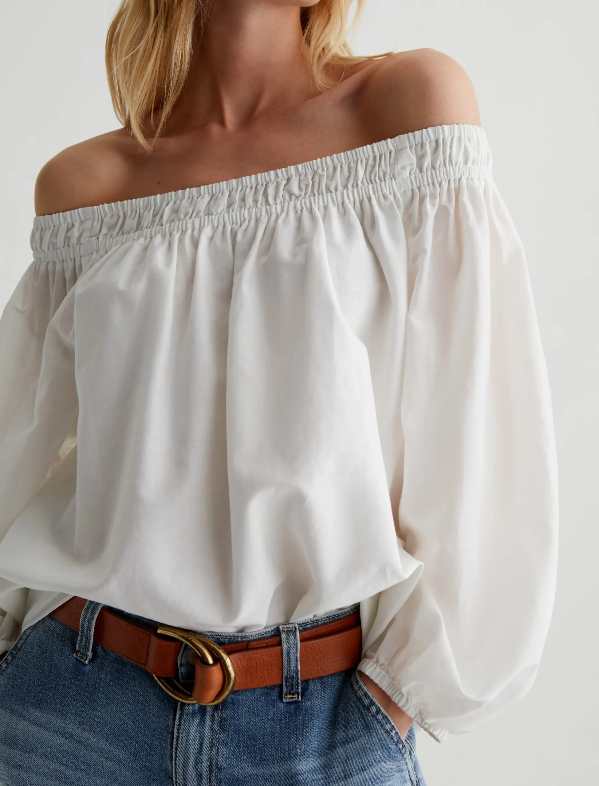 The Carroline Top has an off-the-shoulder silhouette in airy cotton silk voile. Defined by a stretch-enhanced shirred neckline, this white peasant blouse is relaxed and billowy with voluminous long sleeves.