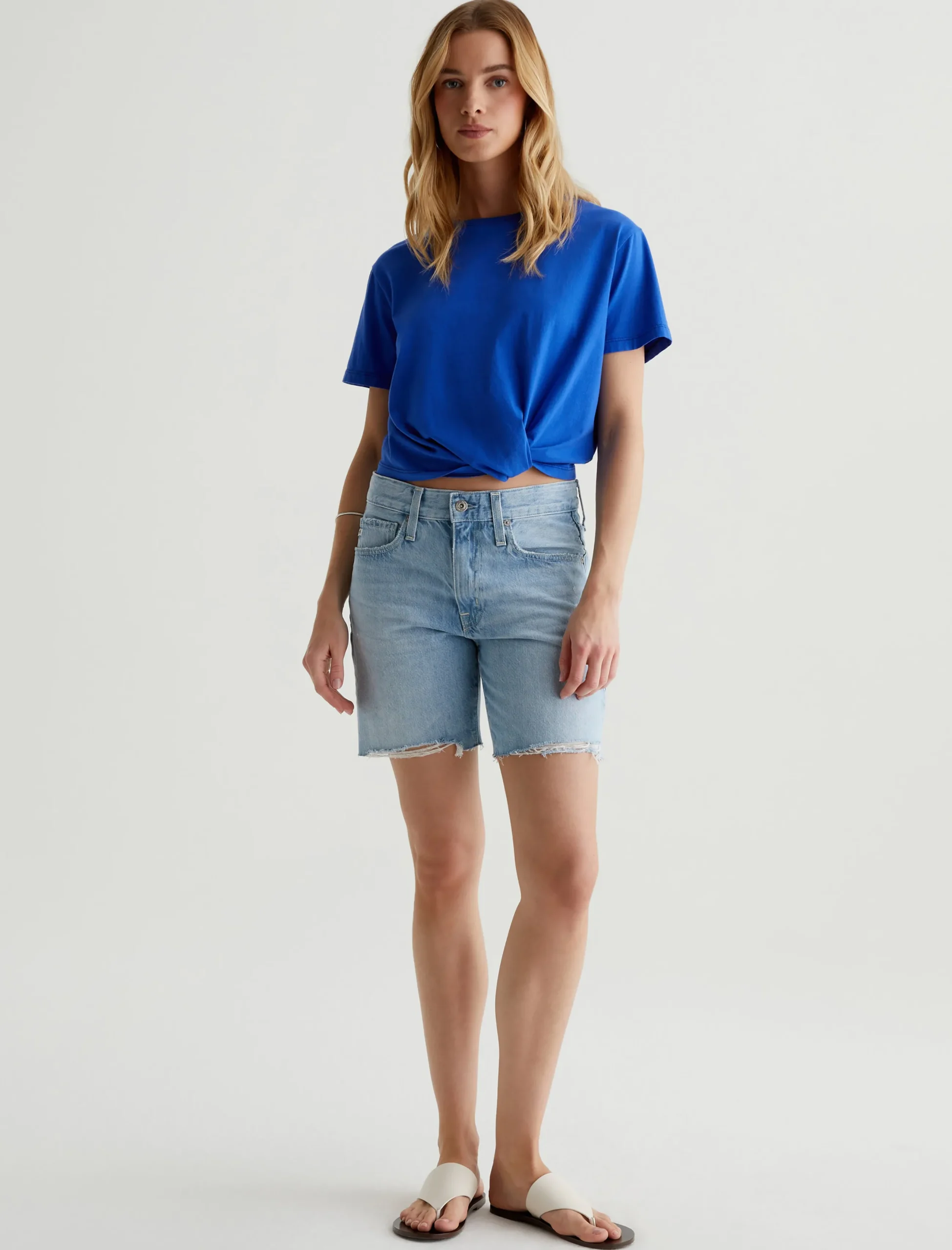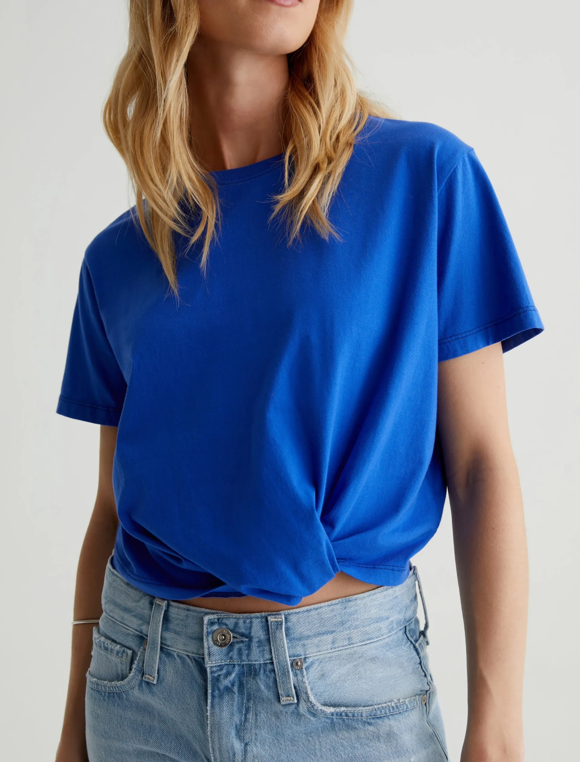 The Ciara Tee has the appearance of a tucked boyfriend T-shirt with a clean, coordinated fold at the hem. Crafted from a soft cotton blend in a bold blue shade, this short-sleeve style features a cropped silhouette that’s boxy at the shoulders and narrower at the waist.