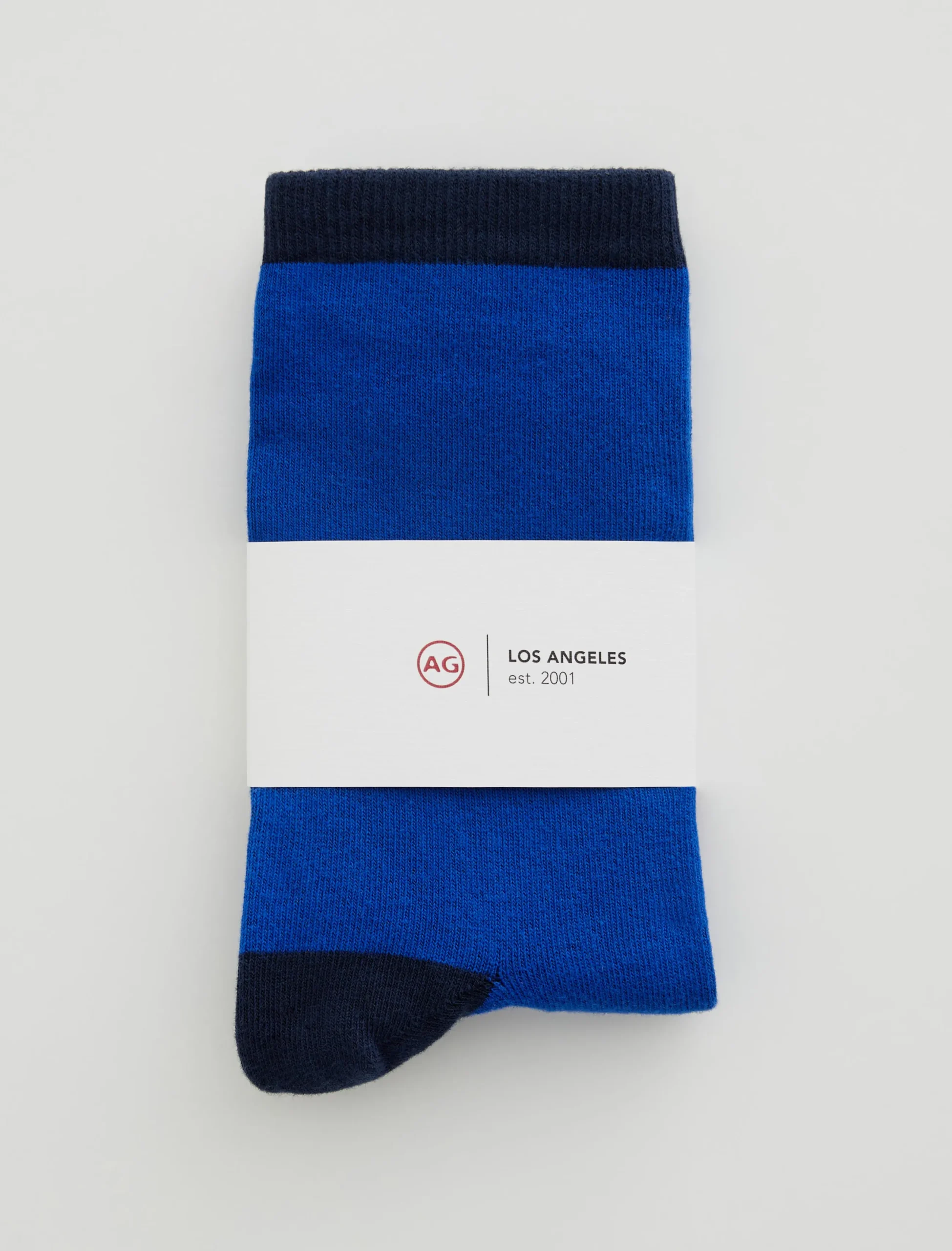This sock is our classic crew sock. Featuring a blue and navy color block, this pair has been knitted from a comfortable cotton blend and ribbed through the ankles.