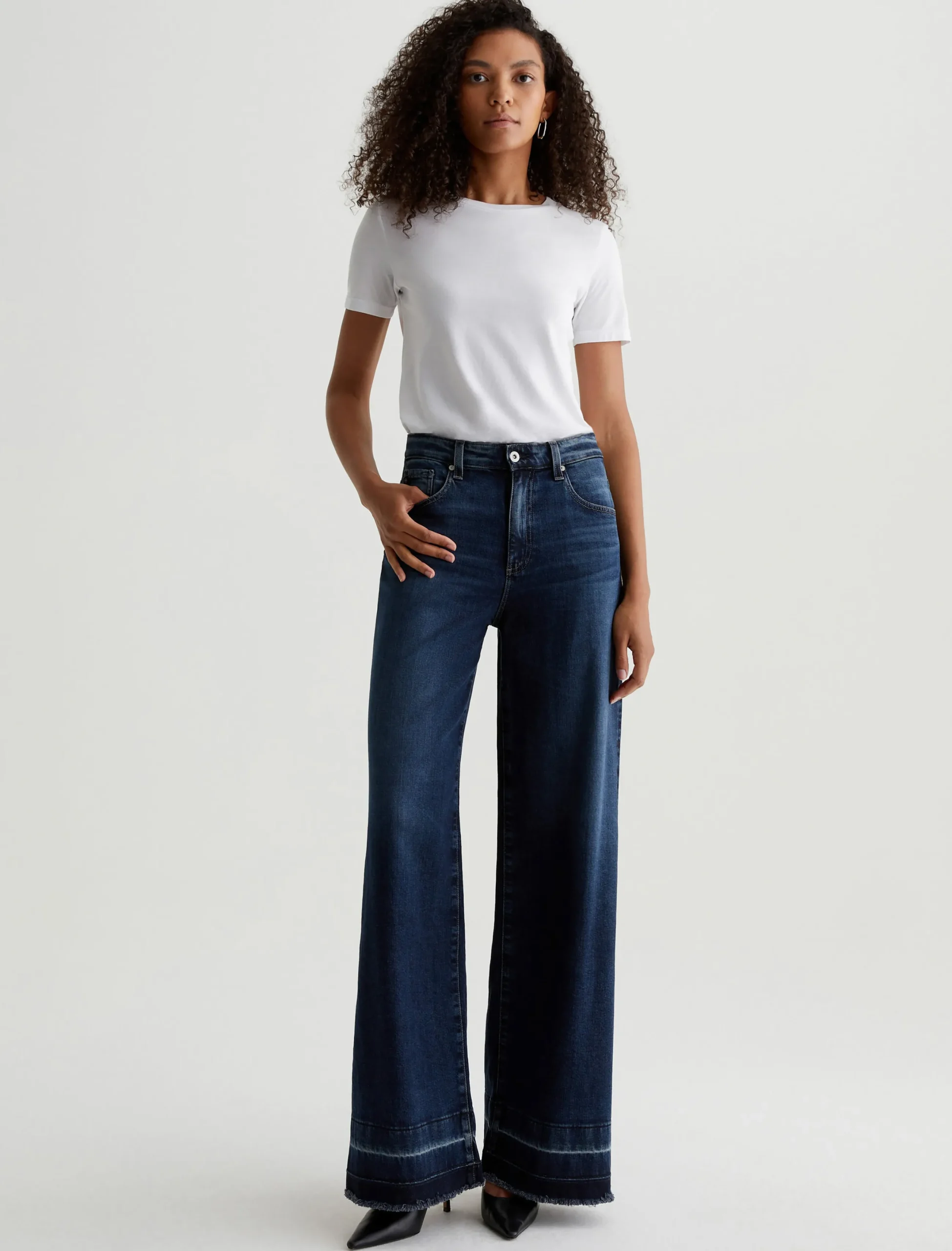 Deven is a wide-leg jean with an ultra-high rise and released hems for an extra-long inseam. This pair comes in 10 oz. Daytripper Stretch Denim with a dark indigo wash worn in by fading and whiskering.