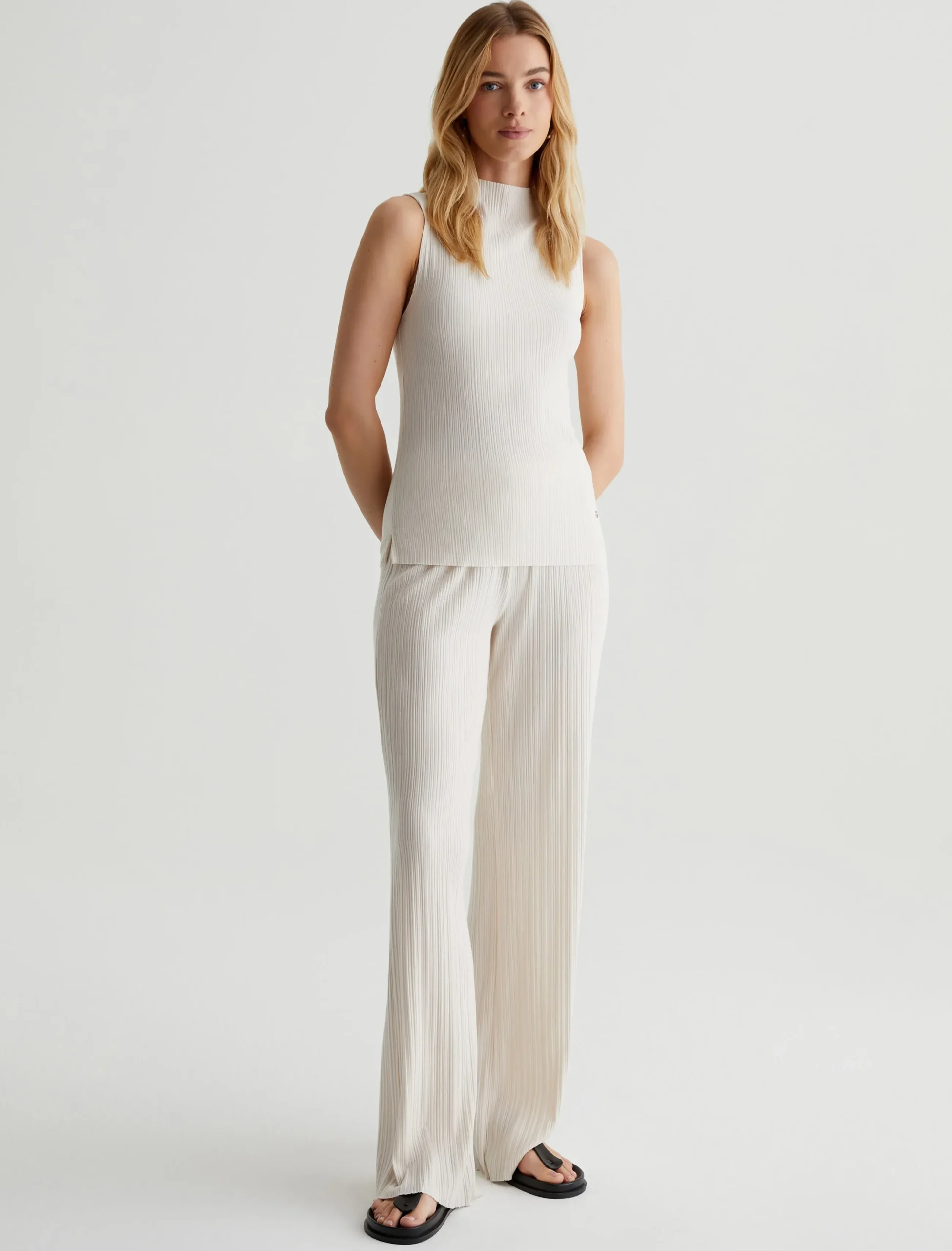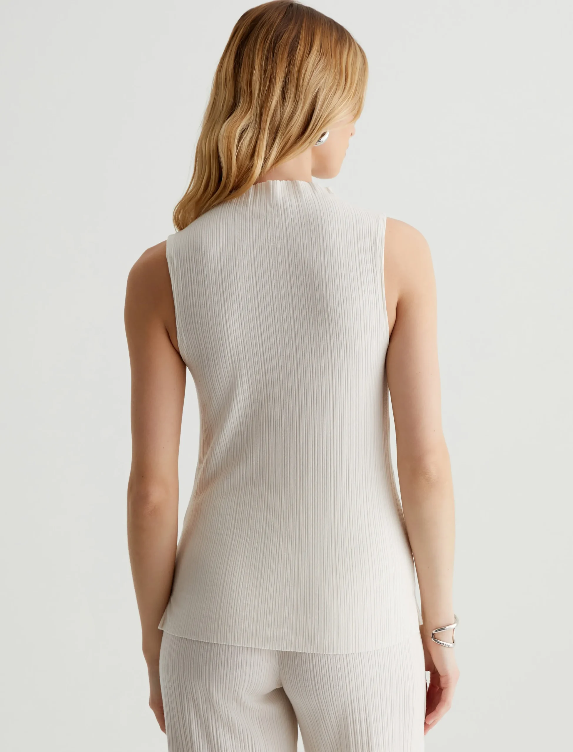 The Emi is a lightweight funnel-neck top made from a soft variegated rib knit. Simple and sleek, this white sleeveless top has split sides and raw edges at the neckline and hem. An easy piece to wear with denim or our matching knit pants.