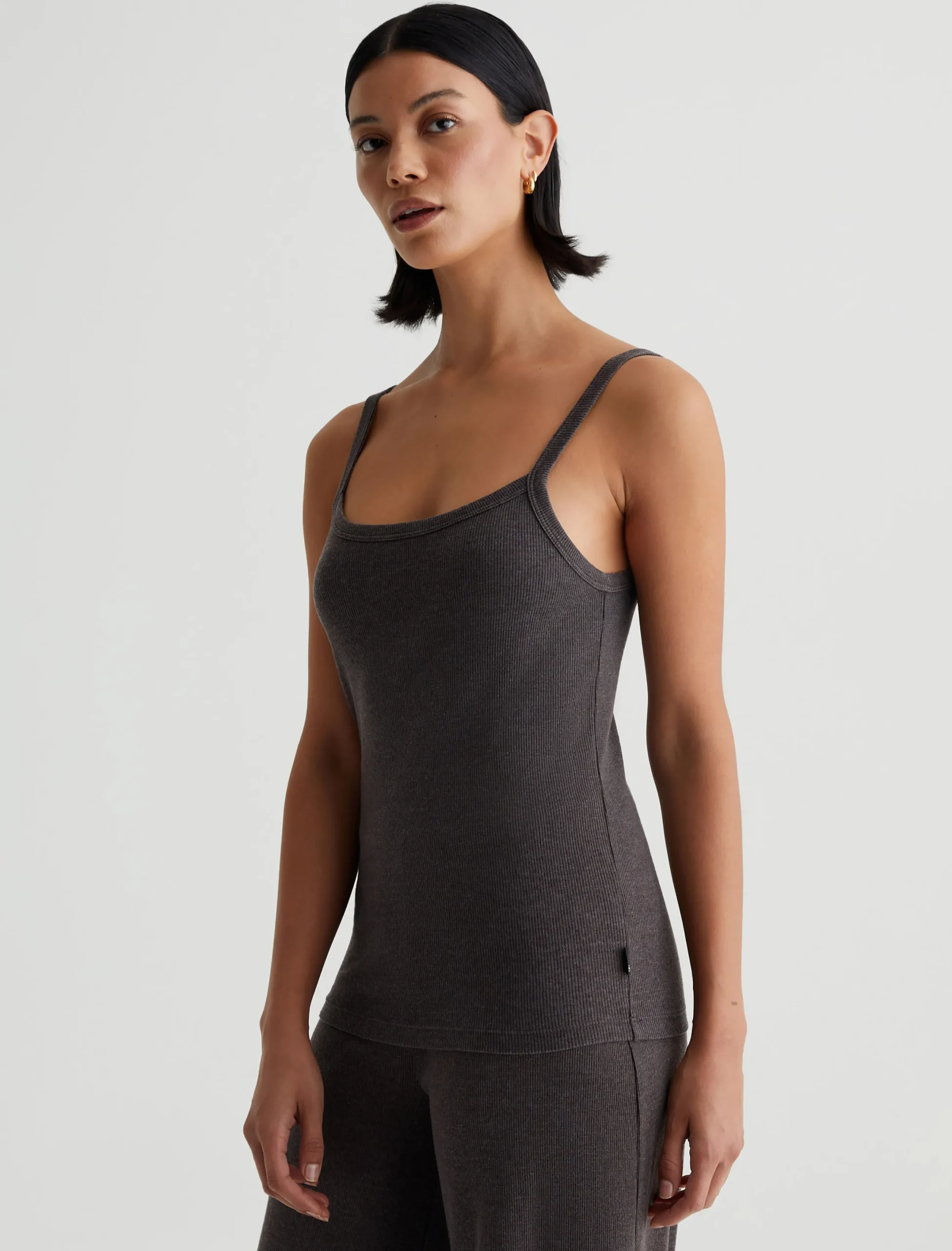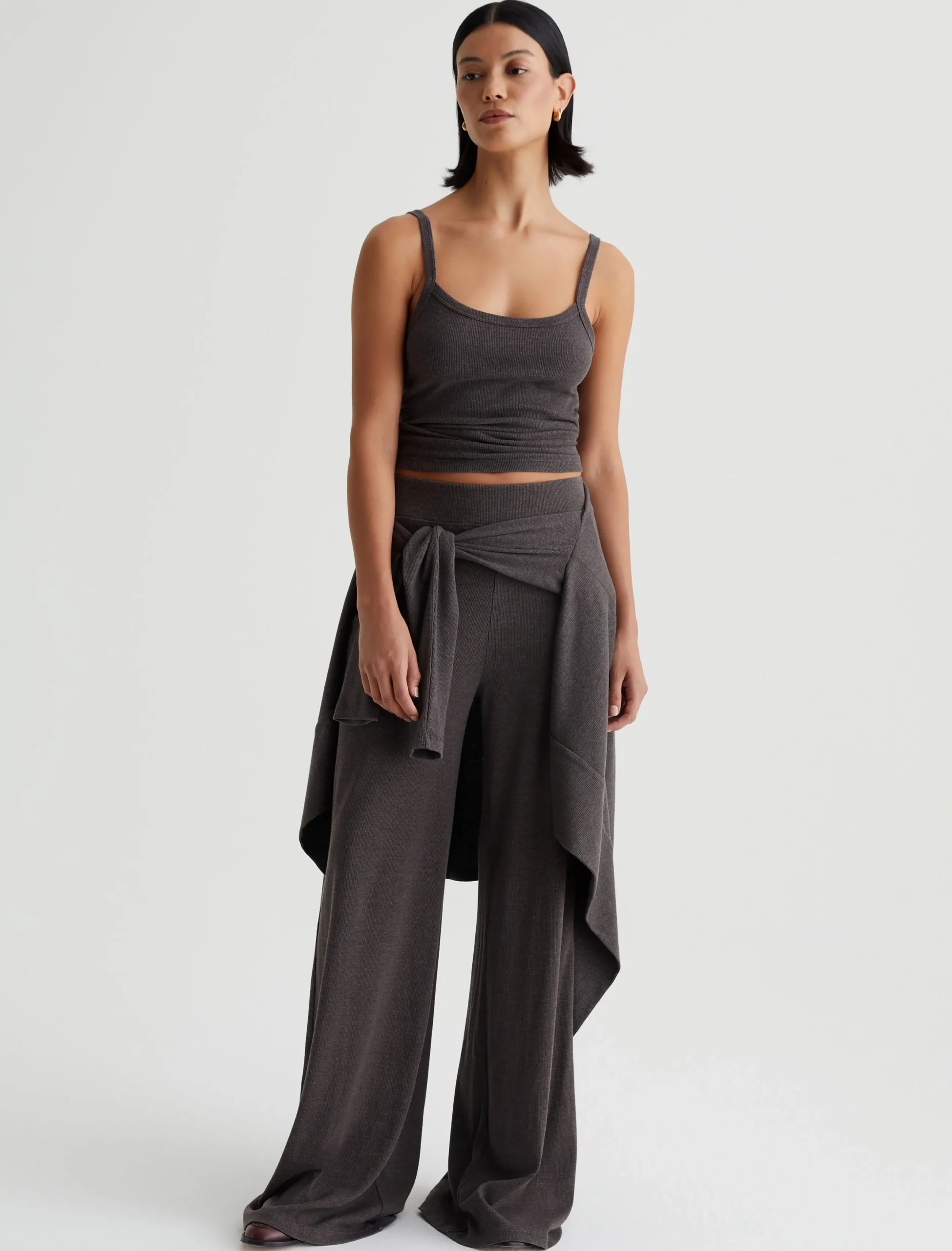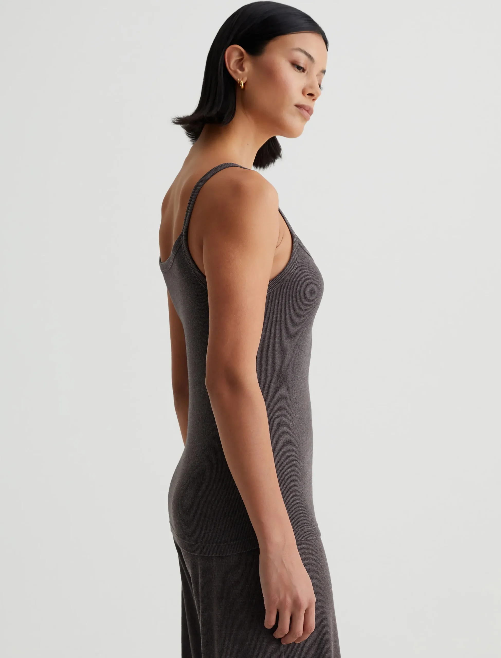 A luxe piece for lounging and layering, the Ever Tank has a slim fit and soft feel in our Mélange Snow Rib. Featured here in heathered Stone Brown, this strappy knit top naturally pairs with our Saamie Cardigan and Sourie pants to create a cozy-chic set.