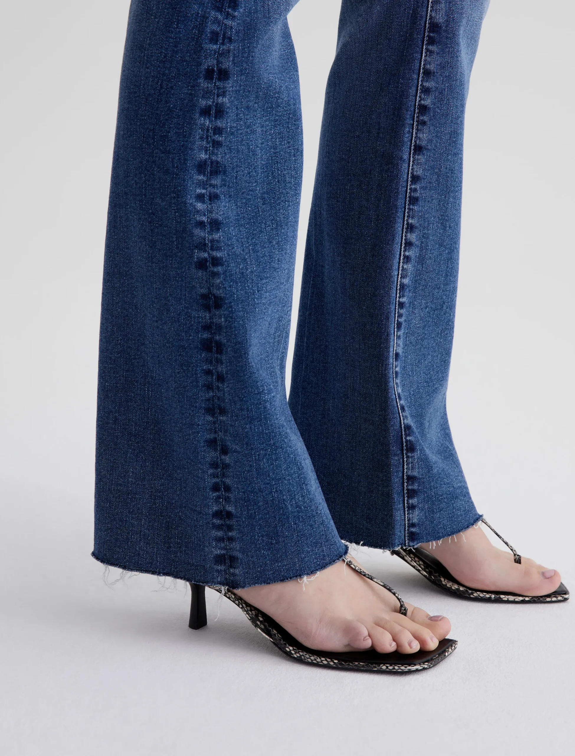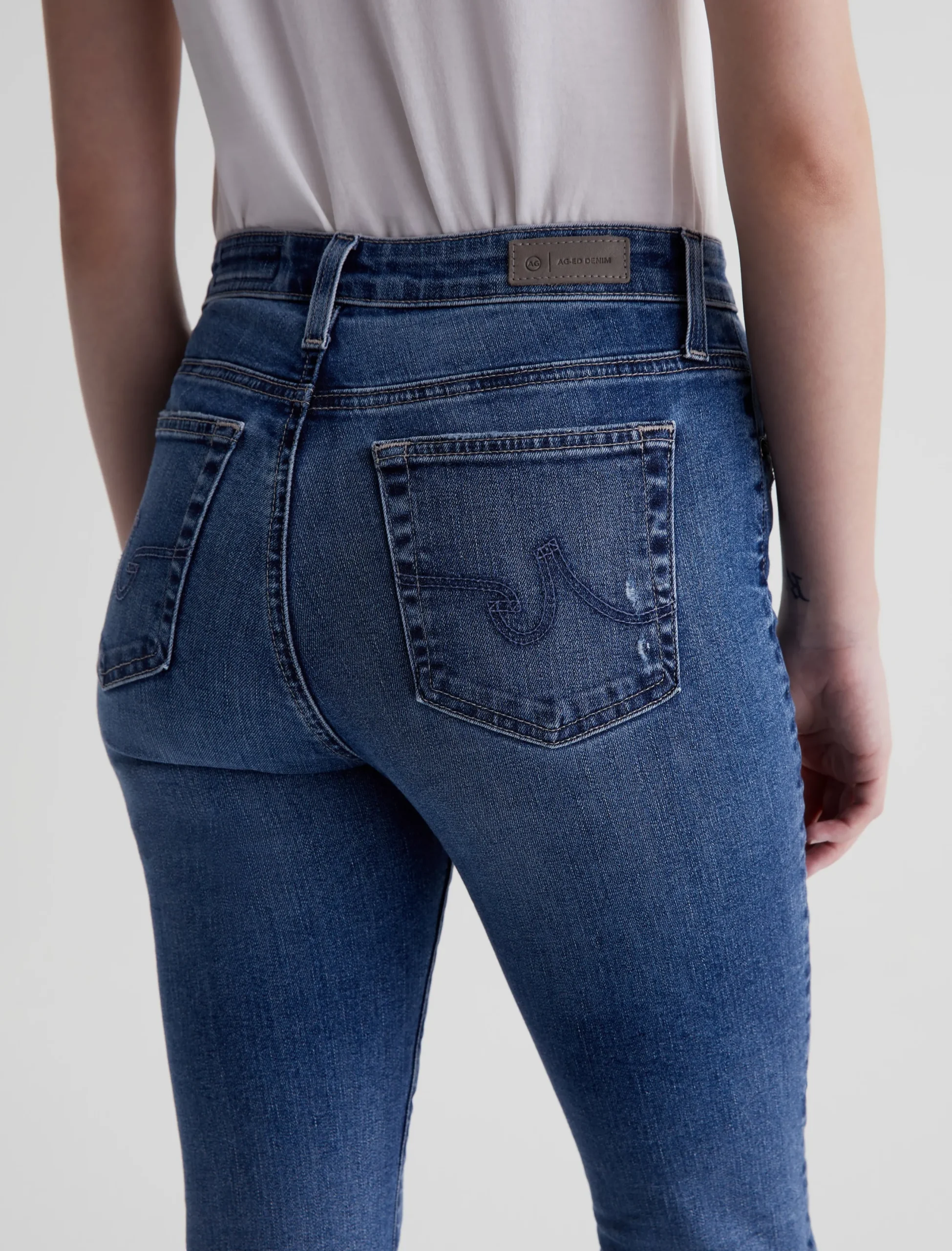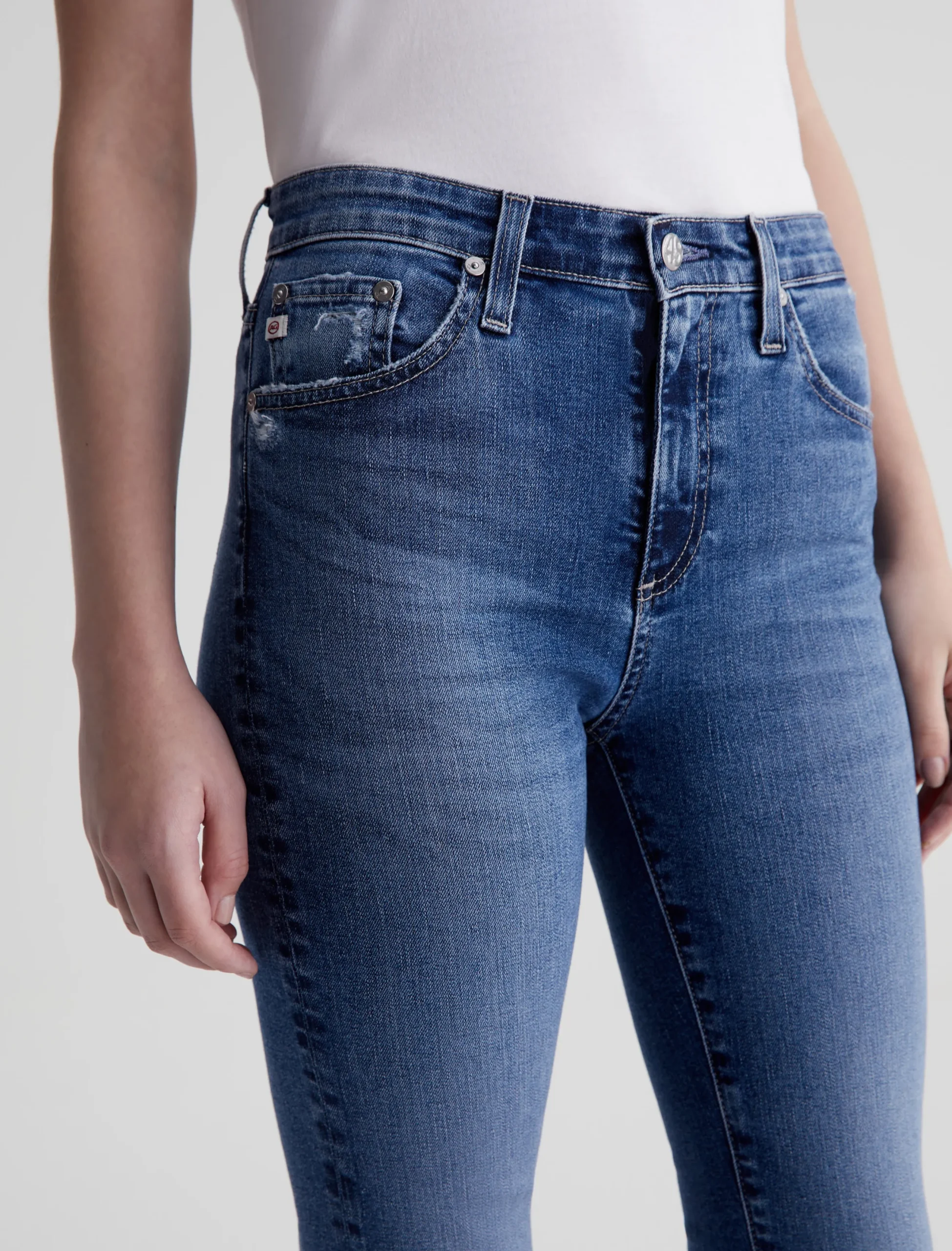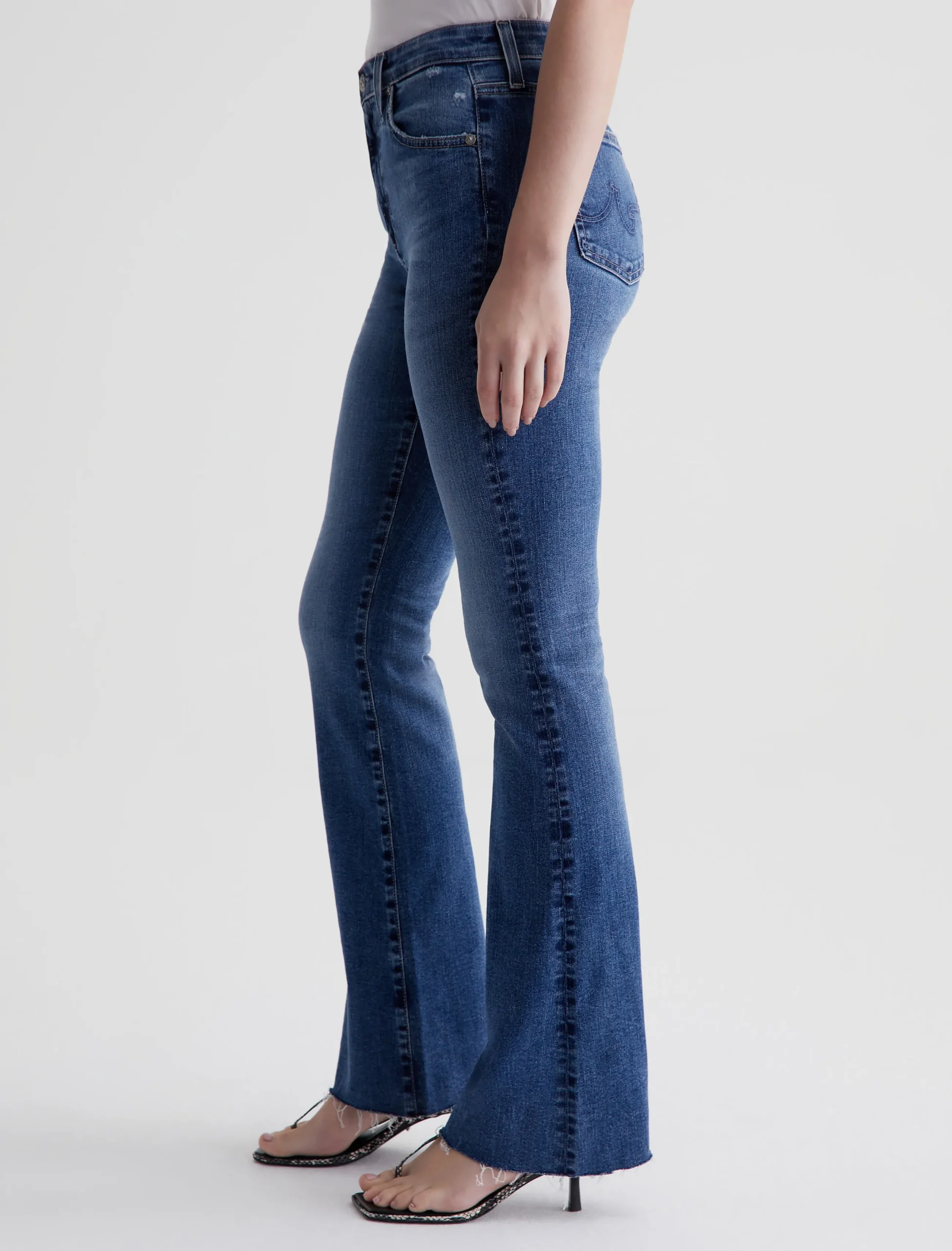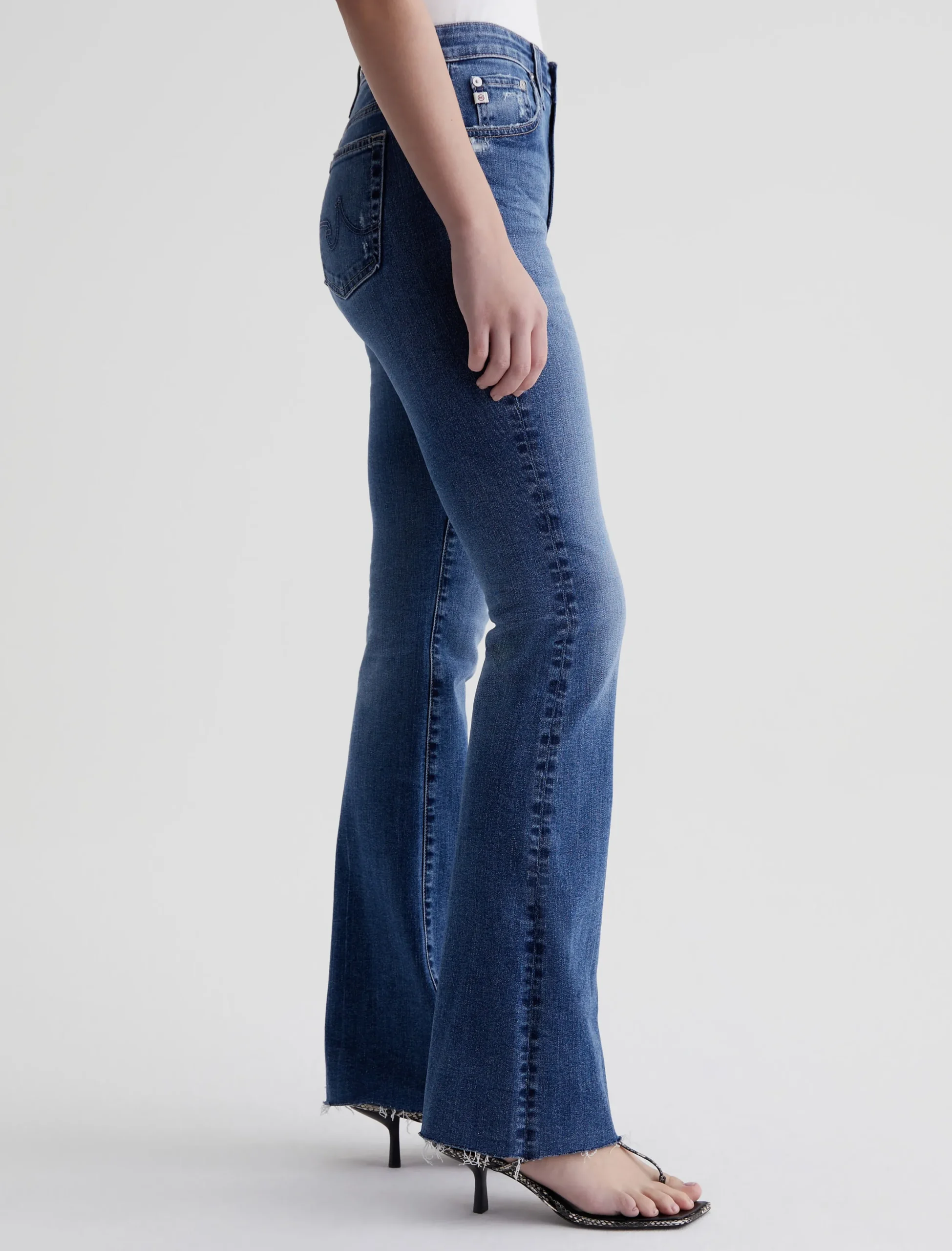 The Farrah Boot is our mid-rise bootcut jean in a medium indigo wash with an AG-ed™ Denim finish. It’s faded, whiskered, and distressed at the pockets. Crafted from 10 oz. Rouge Advanced Stretch Denim, the pair sits right at the natural waist and has a skinny fit through the legs before opening into a subtly flared shape. Raw hems finish the look.