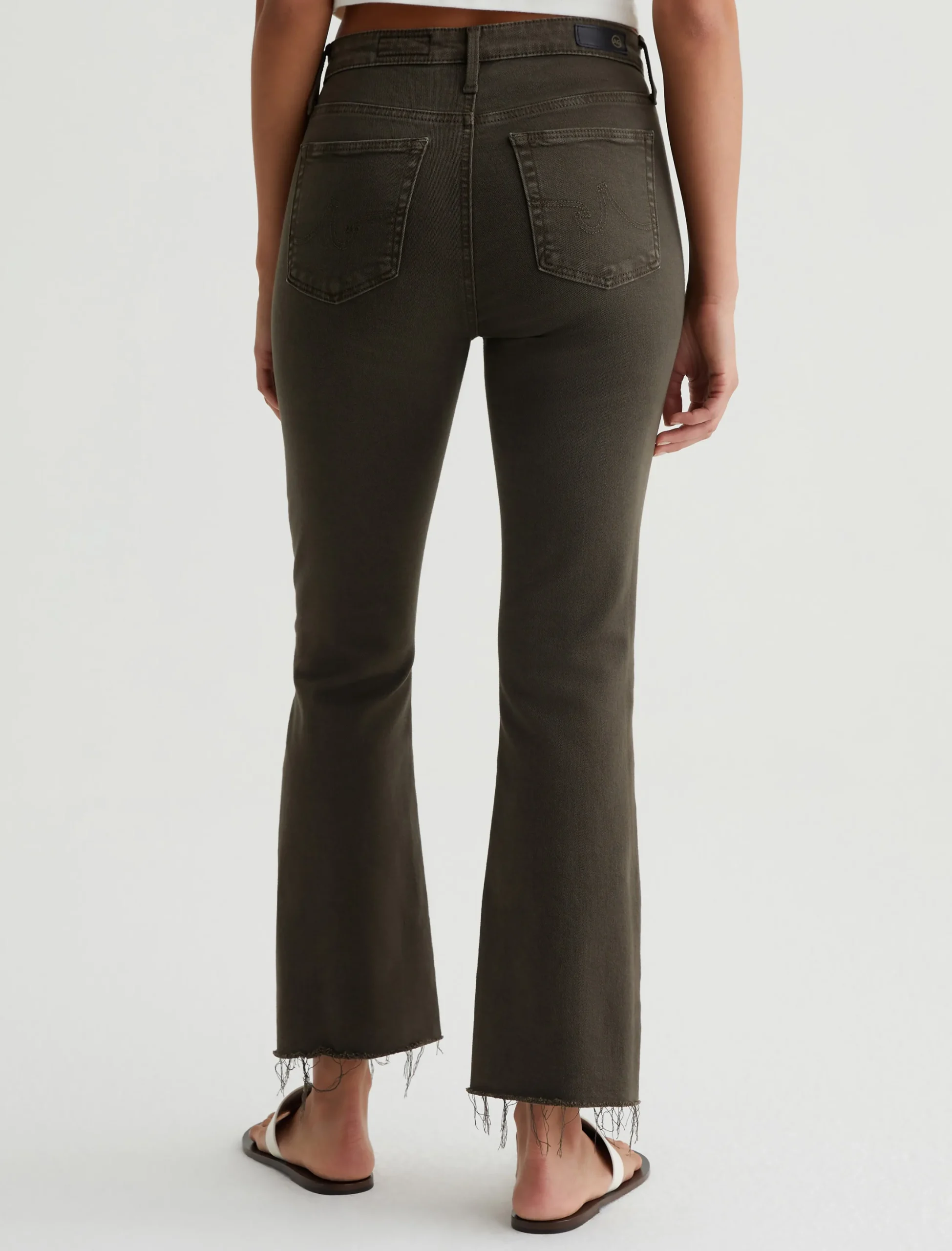 The Farrah Boot Crop jean is a mid-rise cropped bootcut updated in rich, sulfur-dyed brown. The pair has a skinny fit through the legs before opening into subtly flared raw hems. Part of our exclusive AG Cloud Soft Denim™ collection, these women’s bootcut jeans are made from 8.7 oz. Hyper Soft Bull Denim. This special left-hand twill fabric allows the yarns to gently relax and untwist for a supple, velvety-soft feel. It’s designed to get even softer as you wear it. Superstretch construction offers added comfort and enhanced recovery.