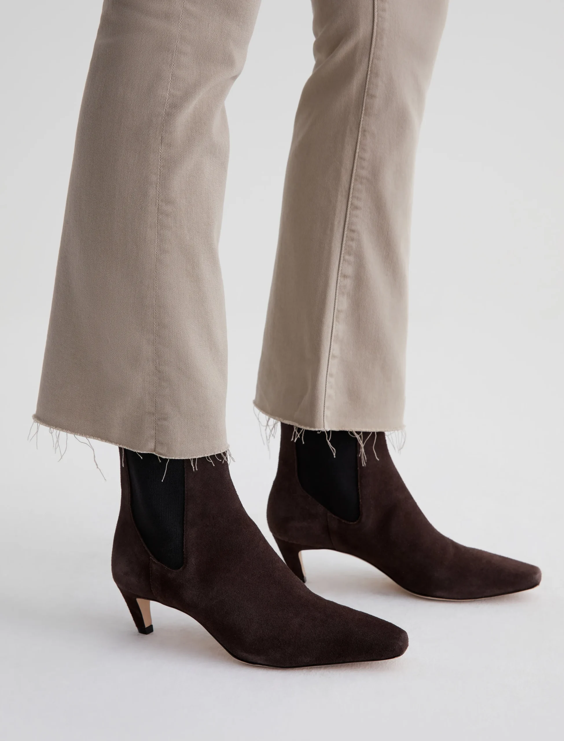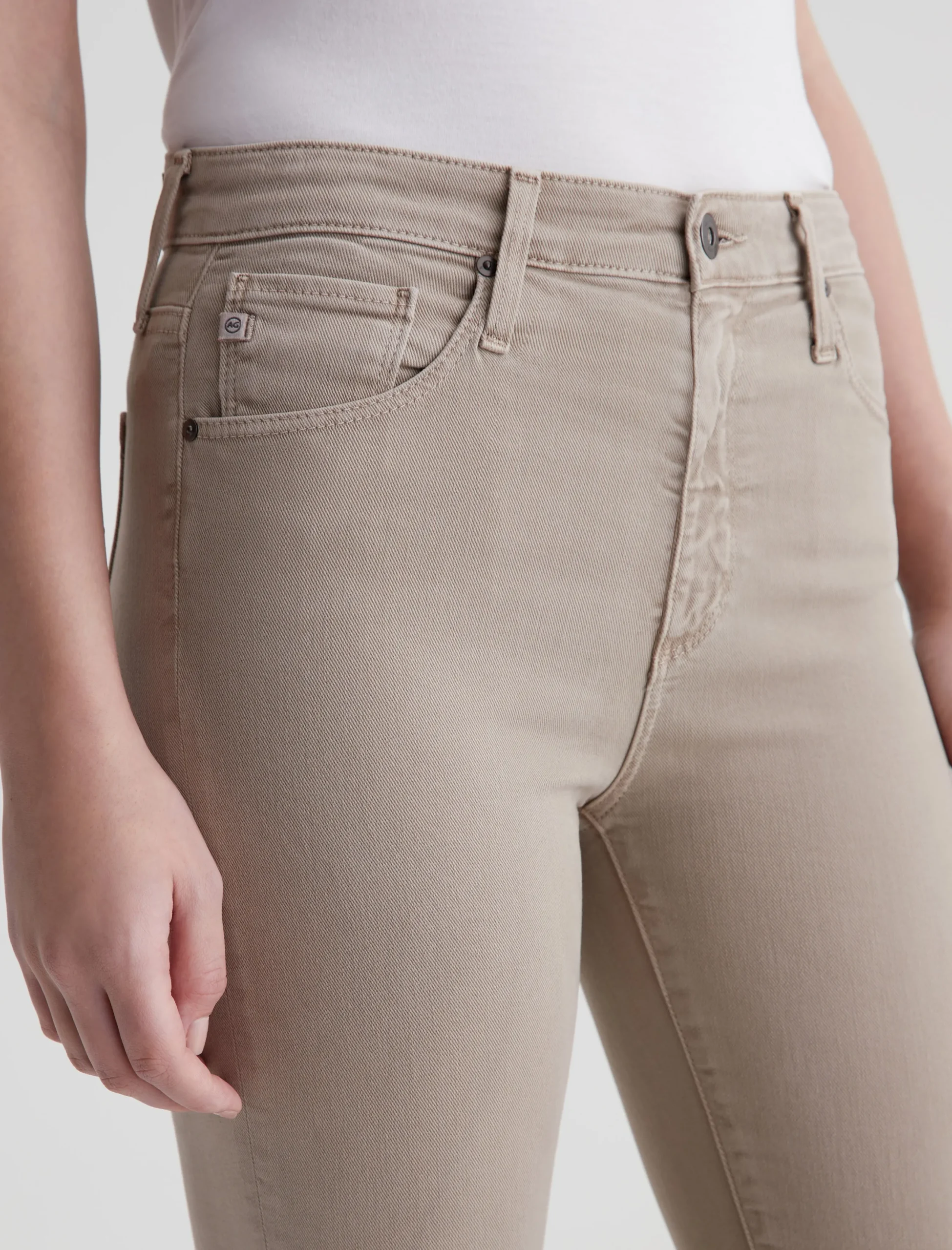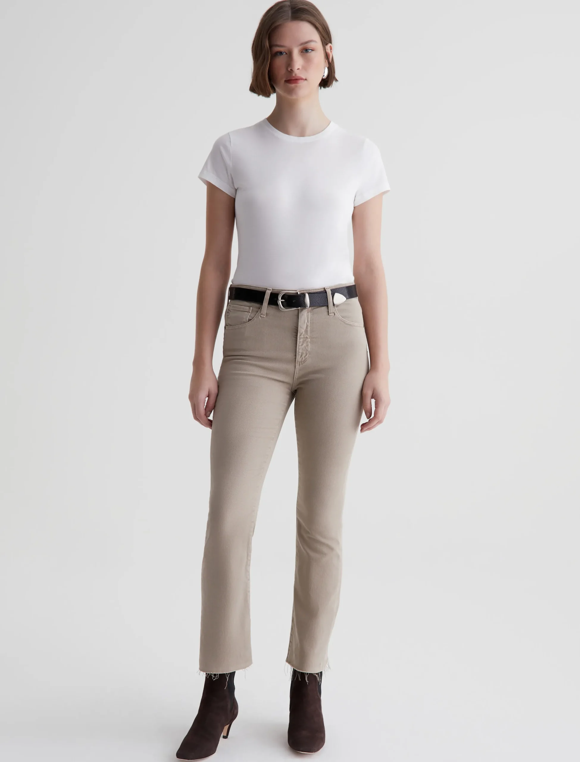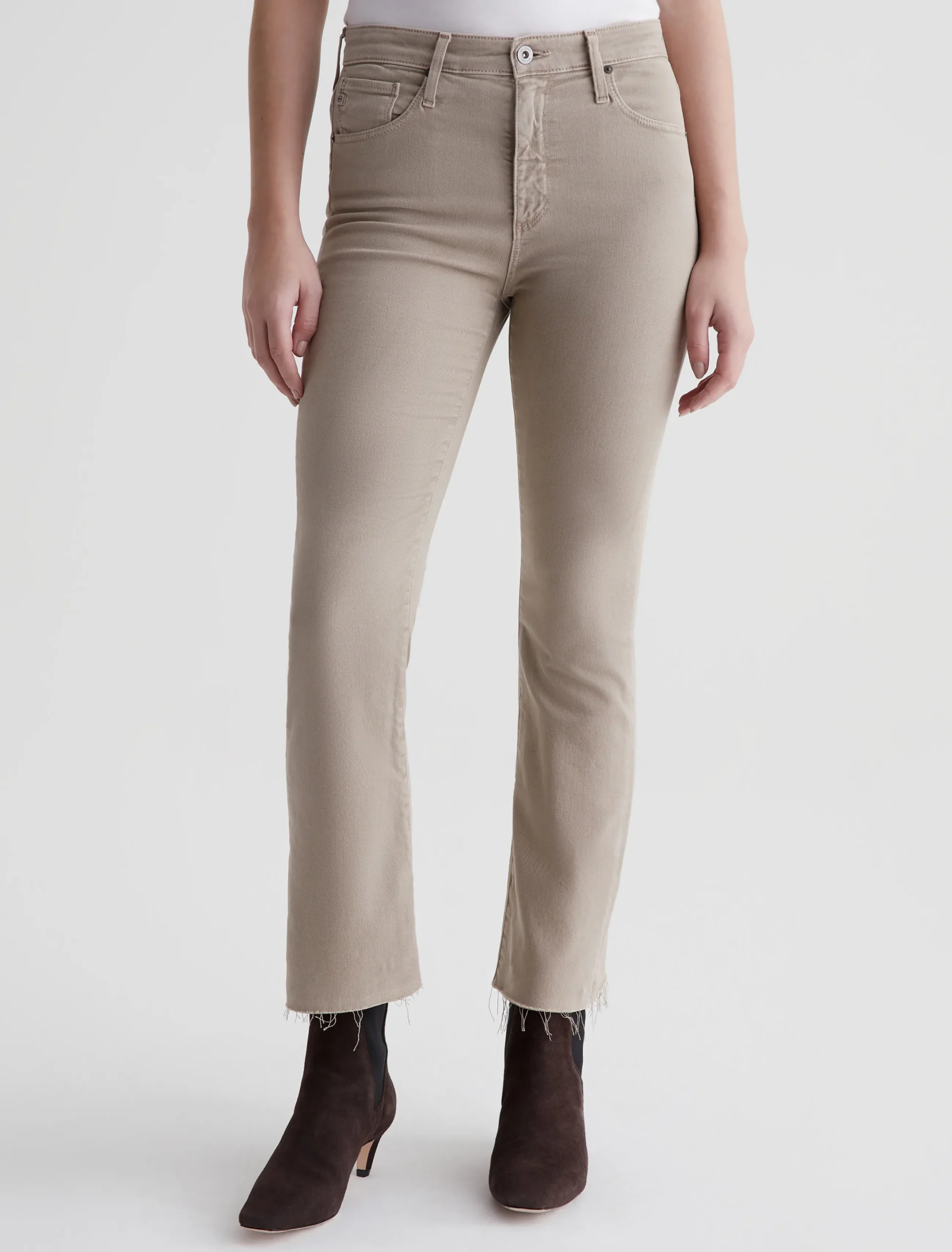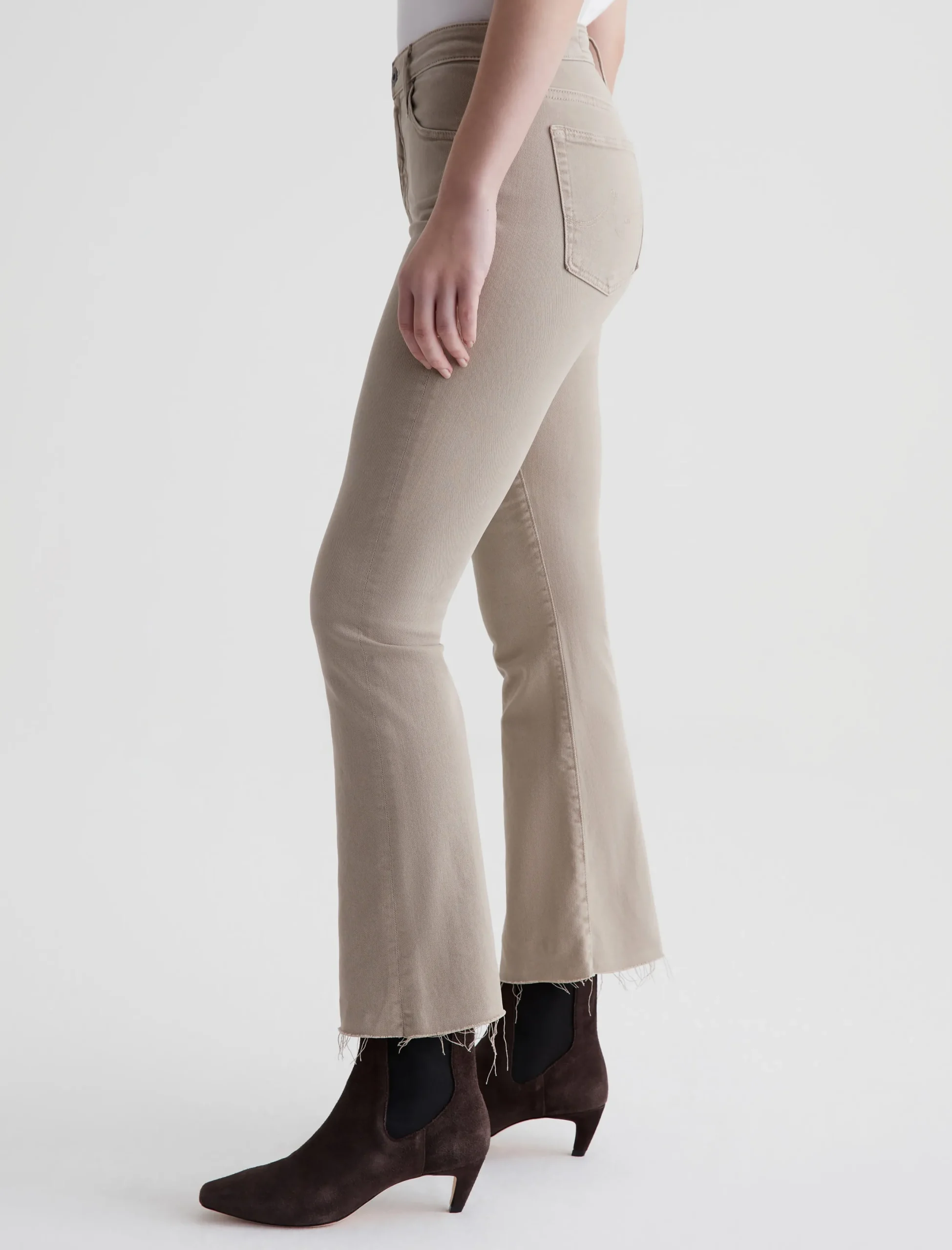The Farrah Boot Crop jean is a mid-rise cropped bootcut silhouette that’s been sulfur-dyed for a faded khaki shade. The pair has a skinny fit through the legs before opening into subtly flared raw hems. Made from our exclusive AG Cloud Soft Denim™, these women’s bootcut jeans are designed in 8.7 oz. Hyper Soft Bull Denim, a left-hand twill fabric that allows the yarns to gently relax and untwist for a supple, velvety-soft feel. It’s designed to get even softer as you wear it. Superstretch construction offers added comfort and enhanced recovery.