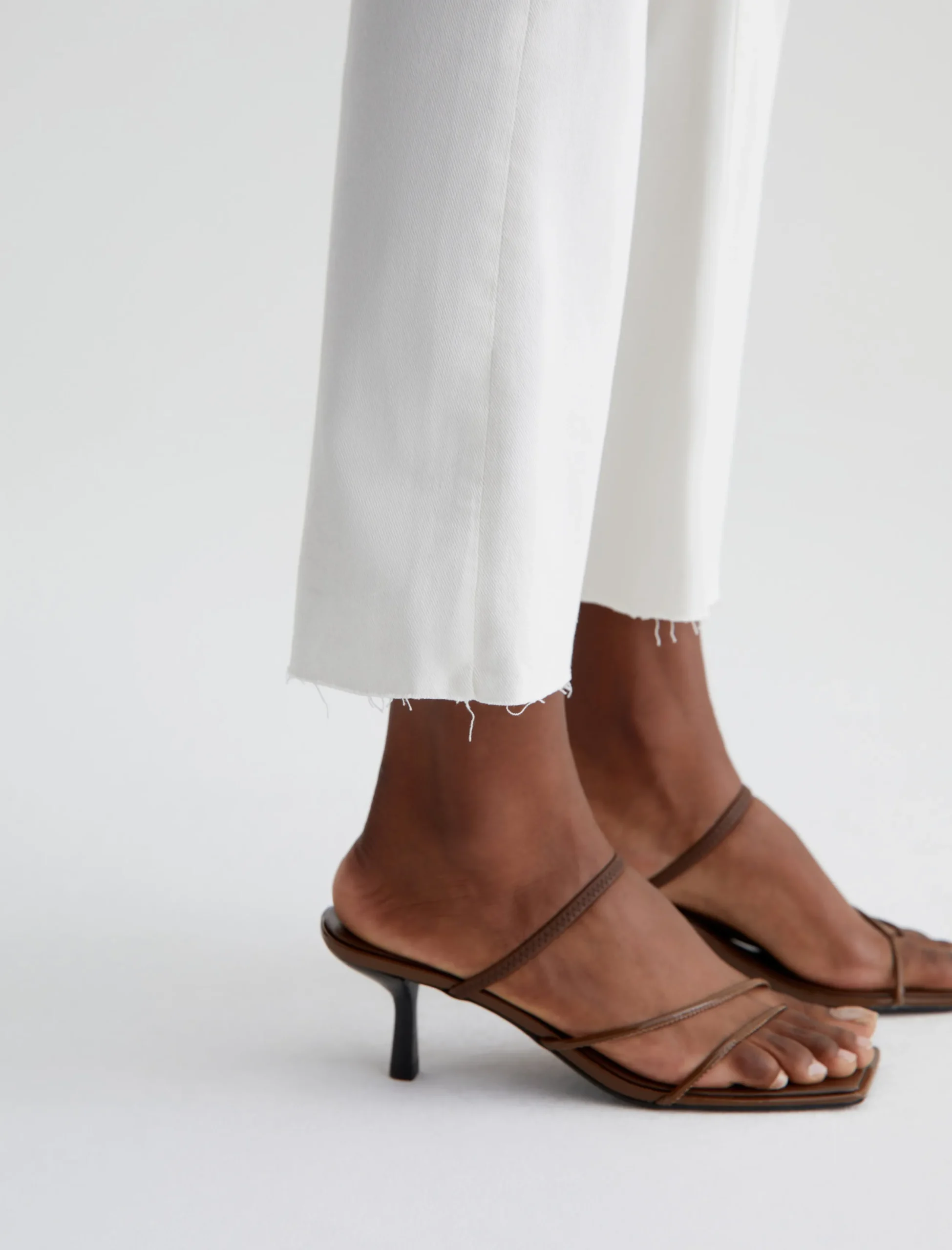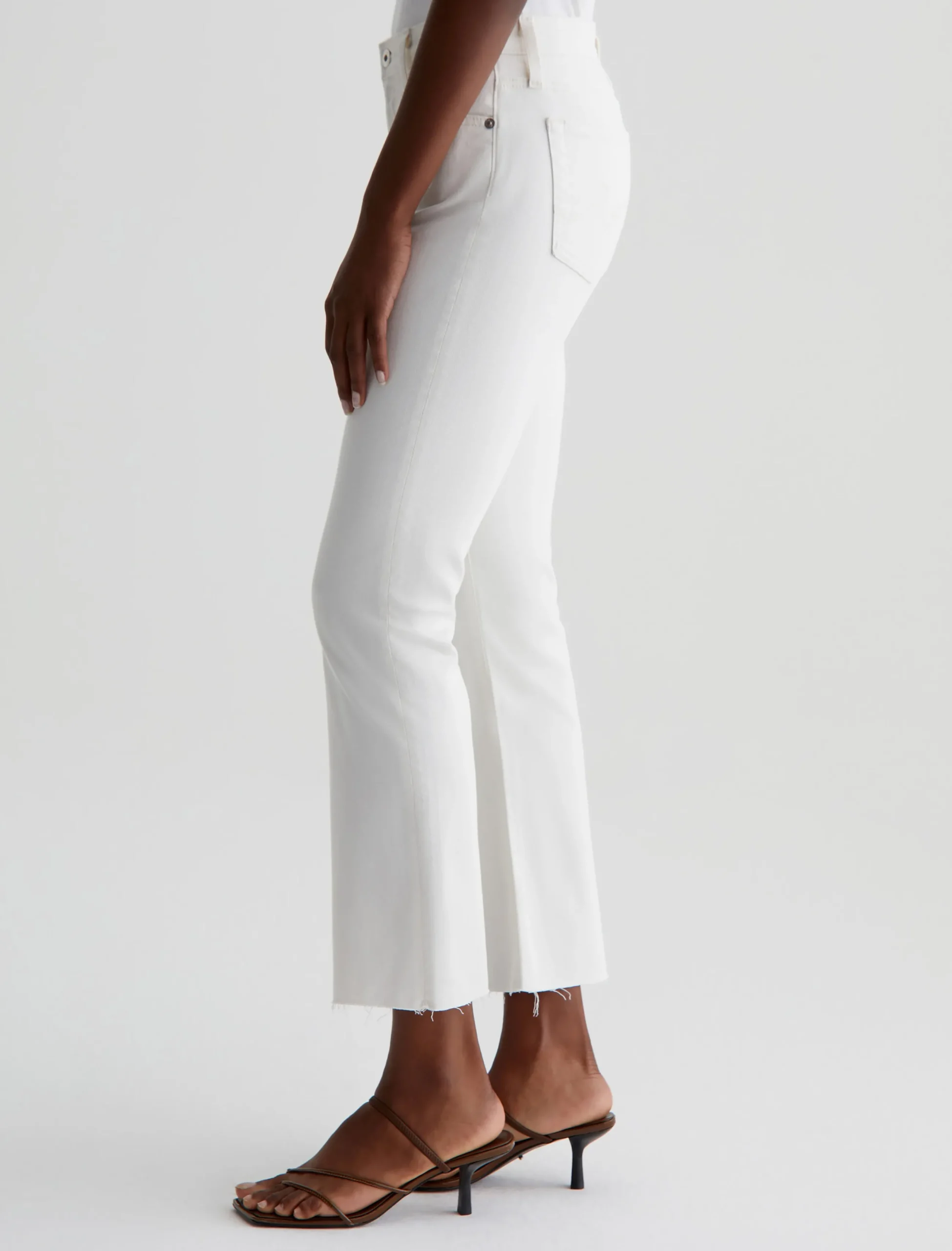 The Farrah Boot Crop jean is a mid-rise cropped bootcut silhouette in powder white. The five-pocket pair has a skinny fit through the legs before opening into subtly flared raw hems. Crafted from our exclusive AG Cloud Soft Denim™, these women’s bootcut jeans are designed in 8.7 oz. Hyper Soft Bull Denim, a left-hand twill fabric that allows the yarns to gently relax and untwist for a supple, velvety feel. It’s designed to get even softer as you wear it. Superstretch construction delivers premium comfort and advanced recovery.