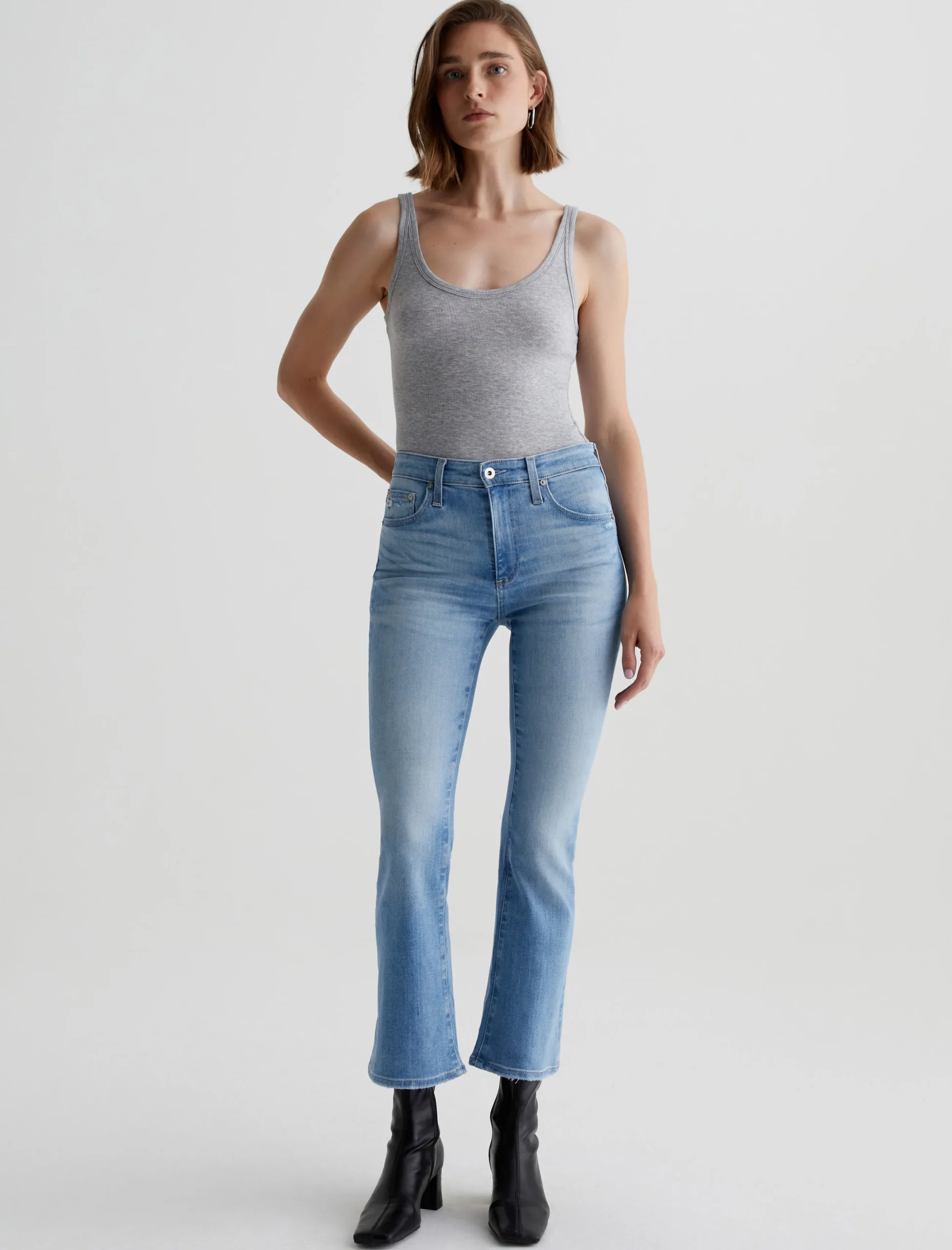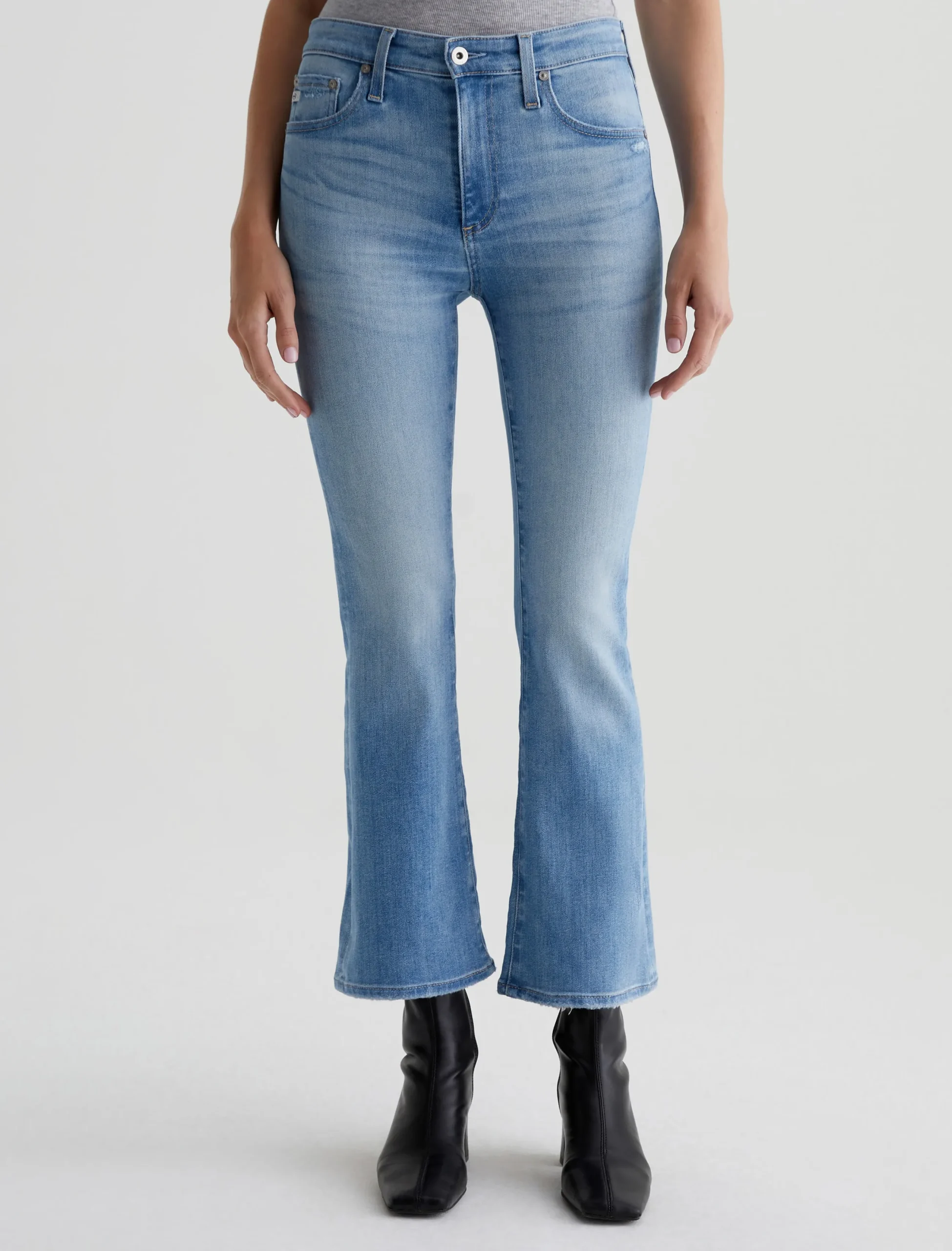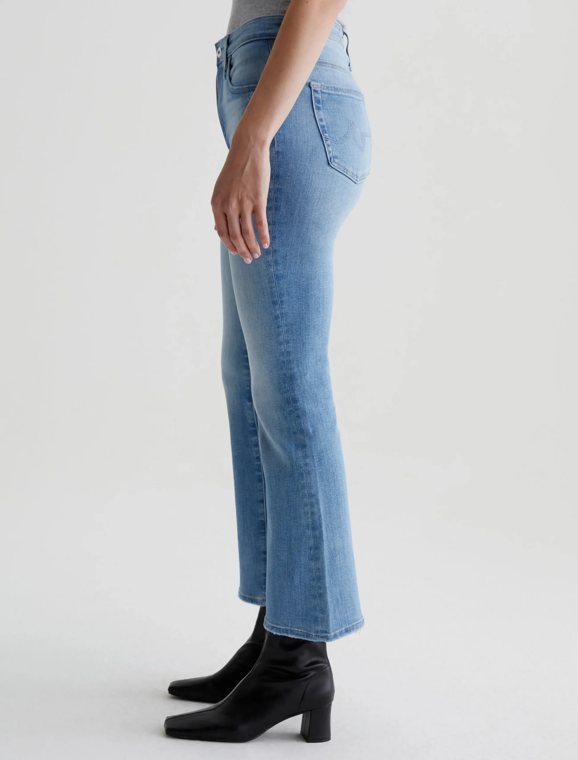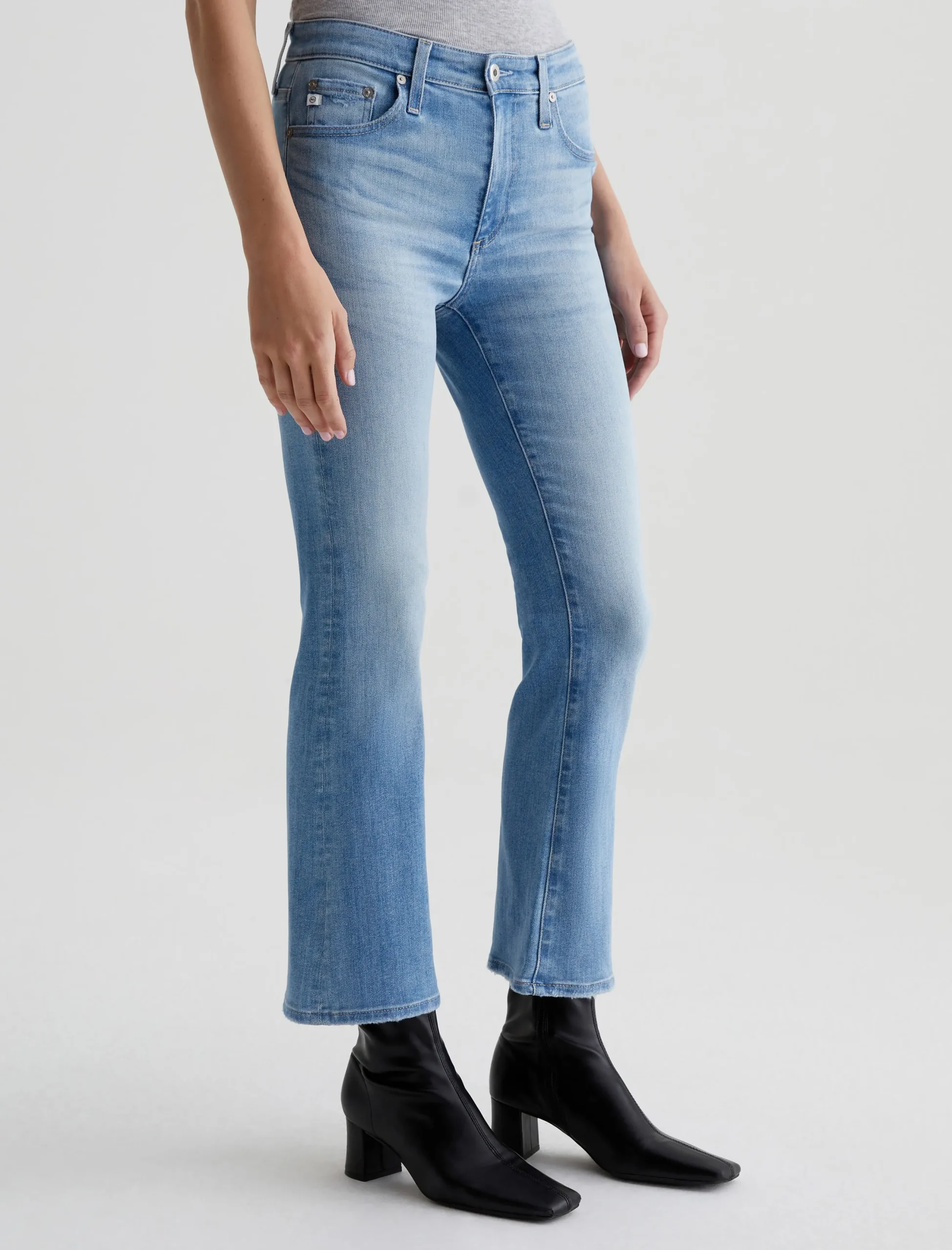The Farrah Boot Crop jean is a mid-rise cropped bootcut silhouette in a faded blue wash. Crafted from 11.5 oz. Sioux Stretch Denim from Japan, these five-pocket jeans have a skinny fit through the legs before opening into subtly flared hems.