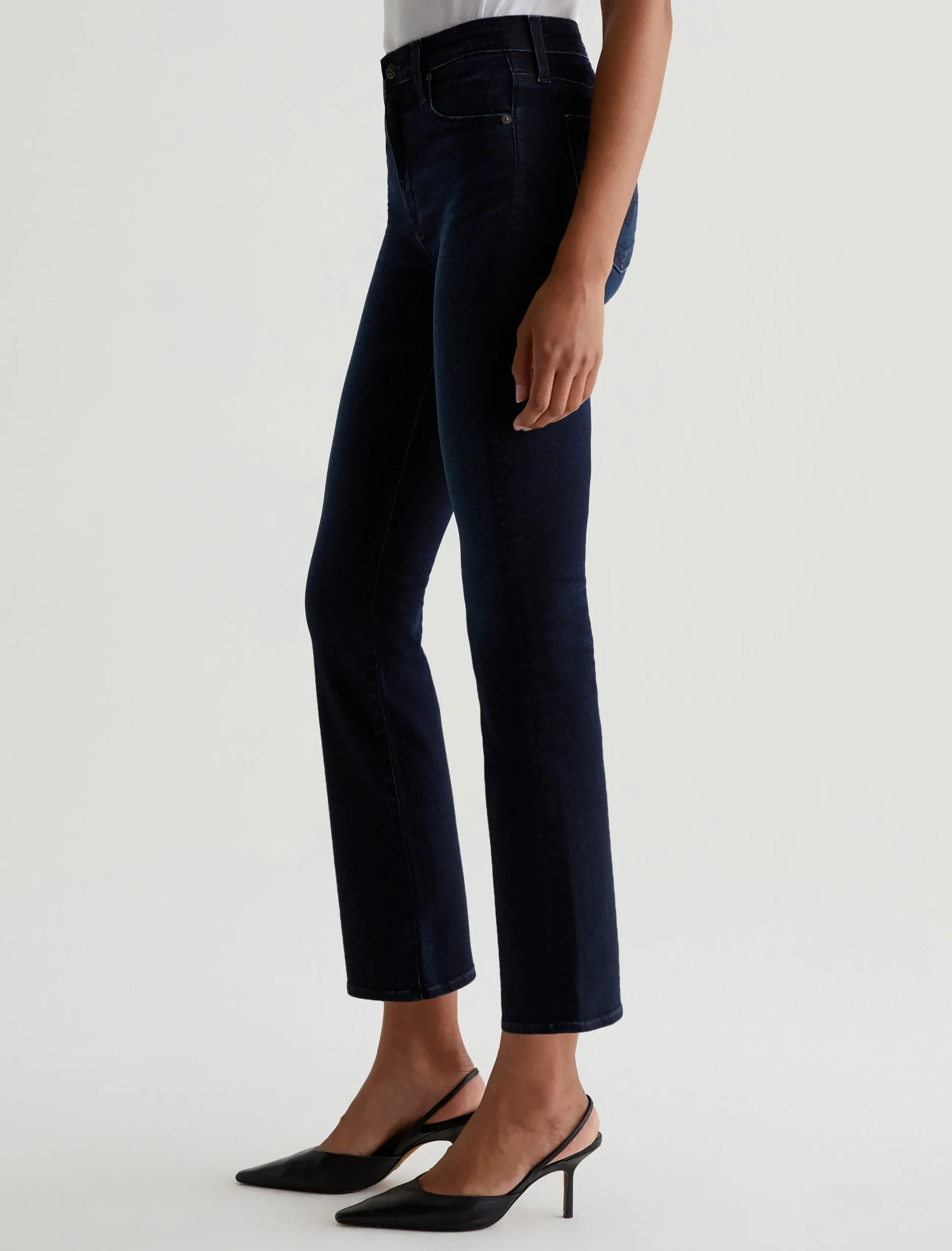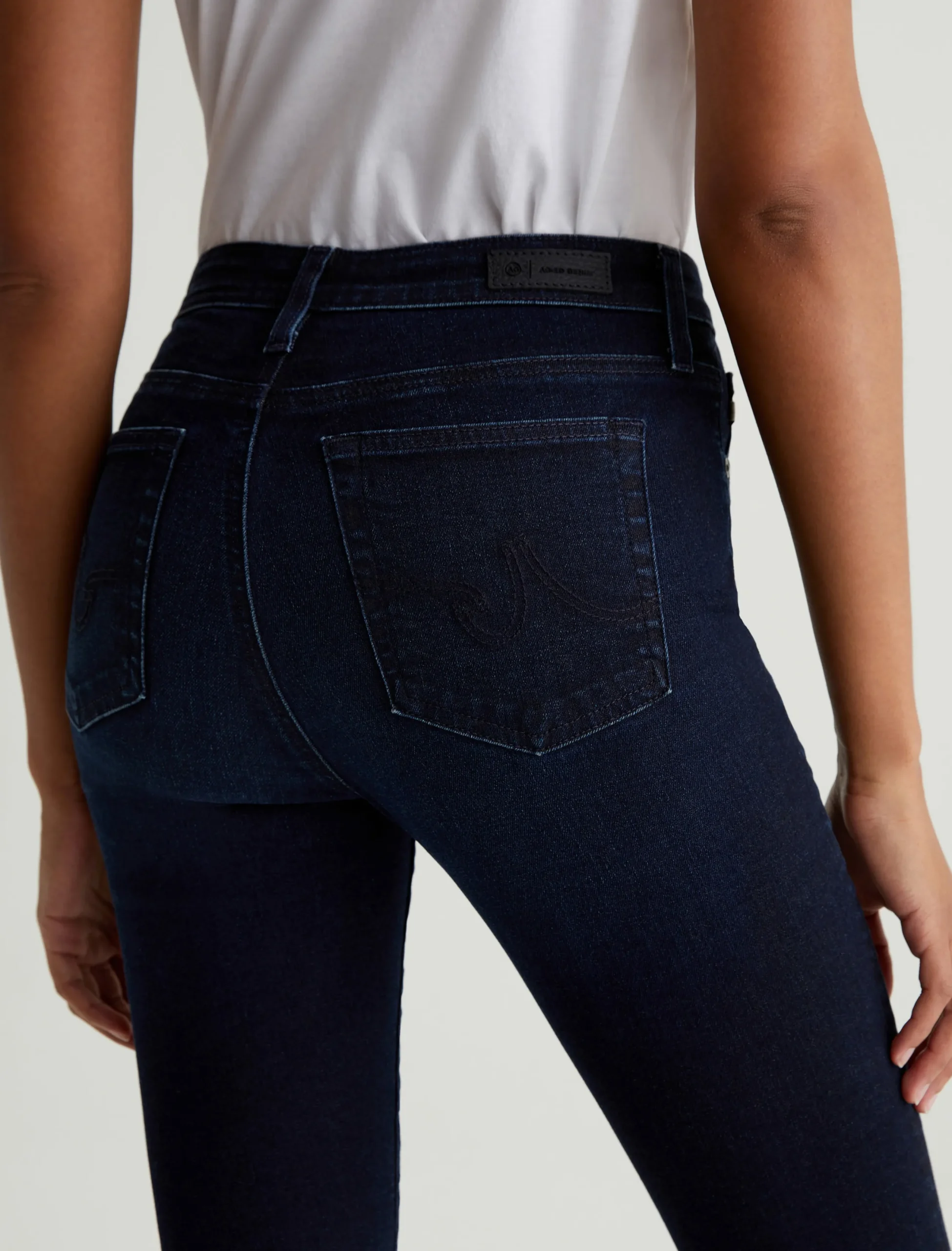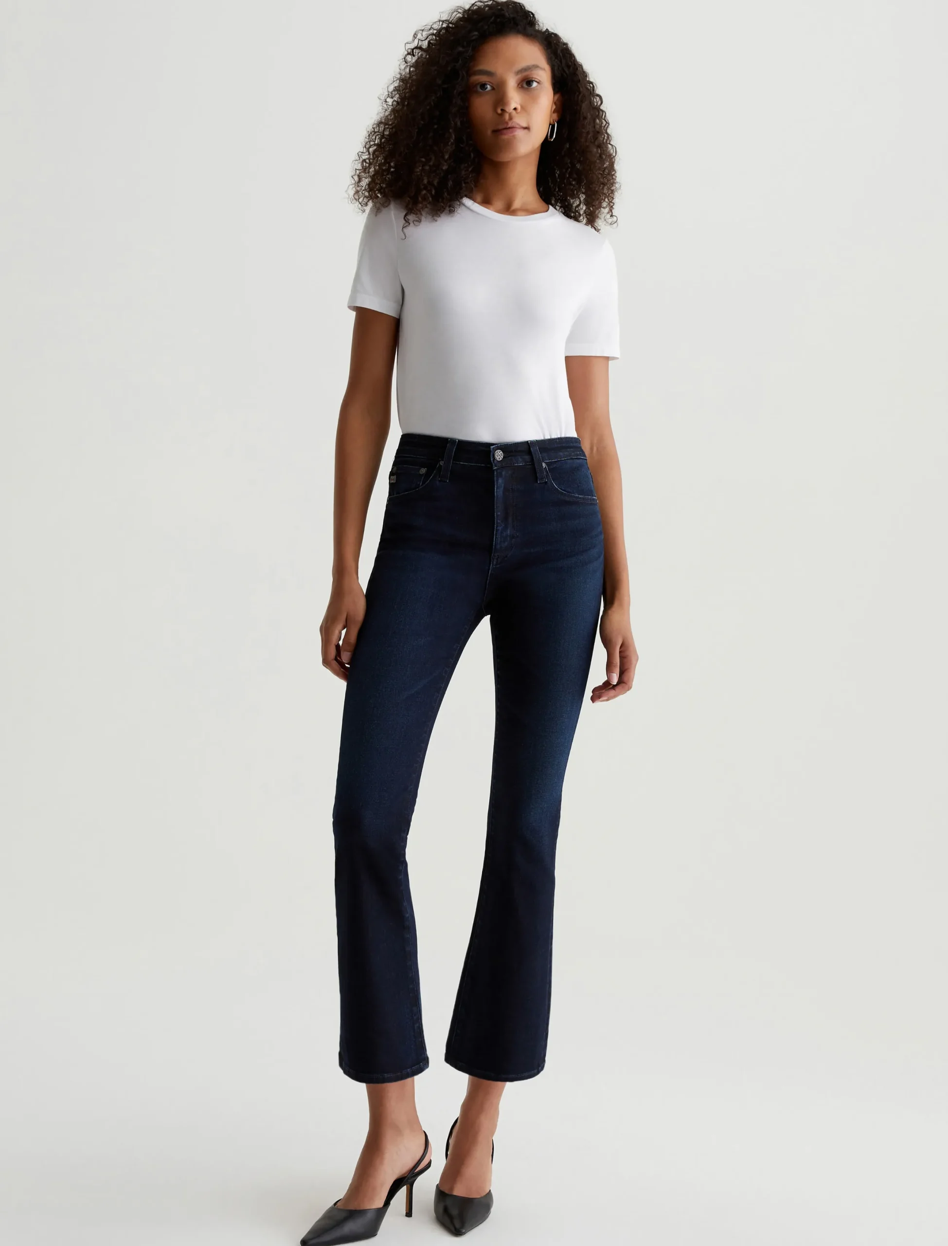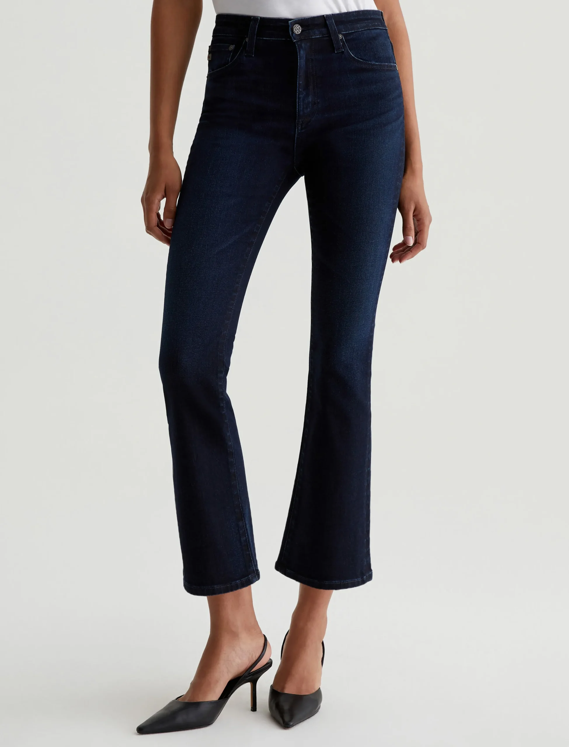 Our Farrah Boot Crop jeans feature a mid-rise bootcut silhouette in 10 oz. superstretch Empower Denim from Japan. The AG-ed™ pair features a dark blue wash worn in by subtle fading and whiskering. These women’s bootcut jeans sit right at the natural waist and has a skinny fit through the legs before opening into a subtle flare.