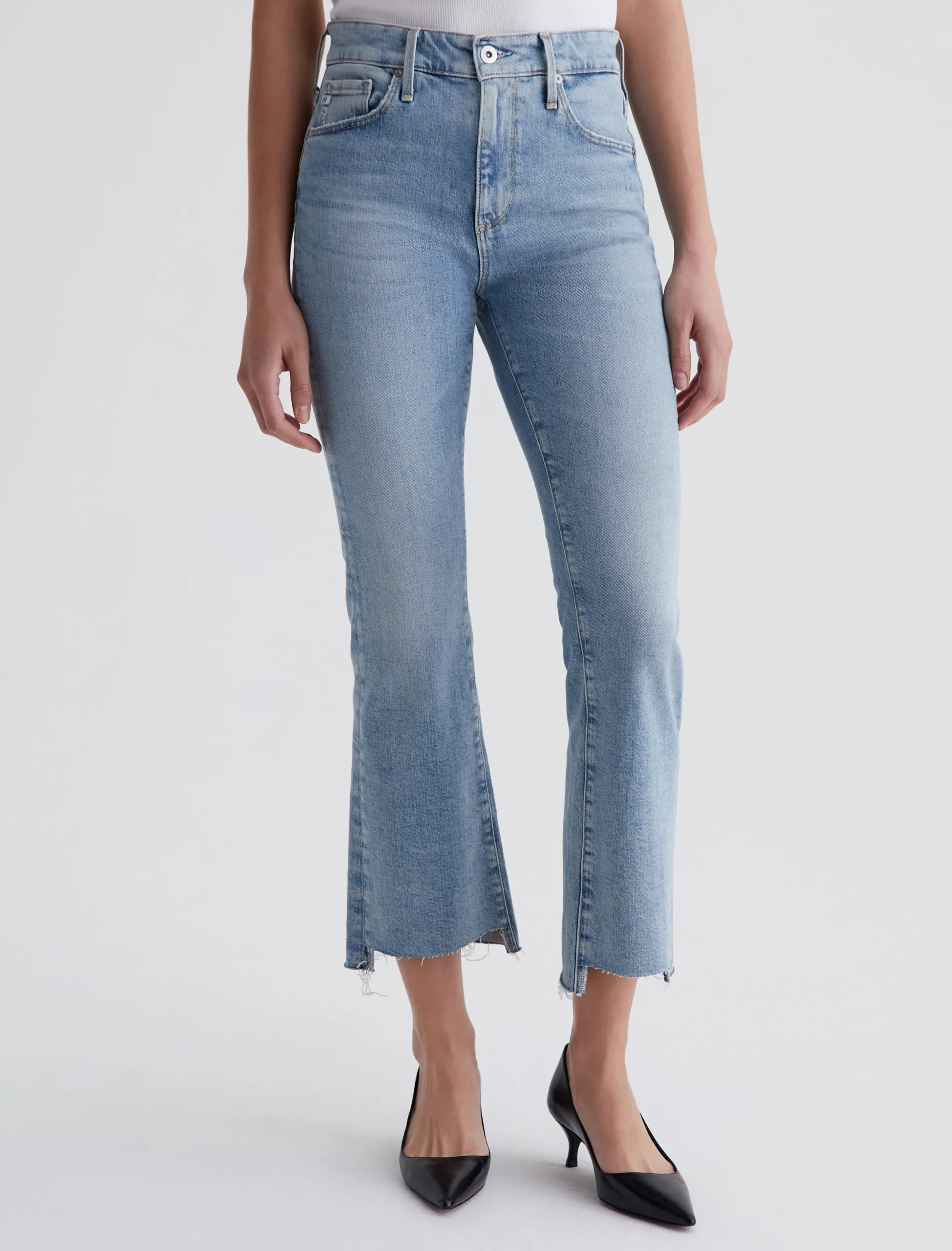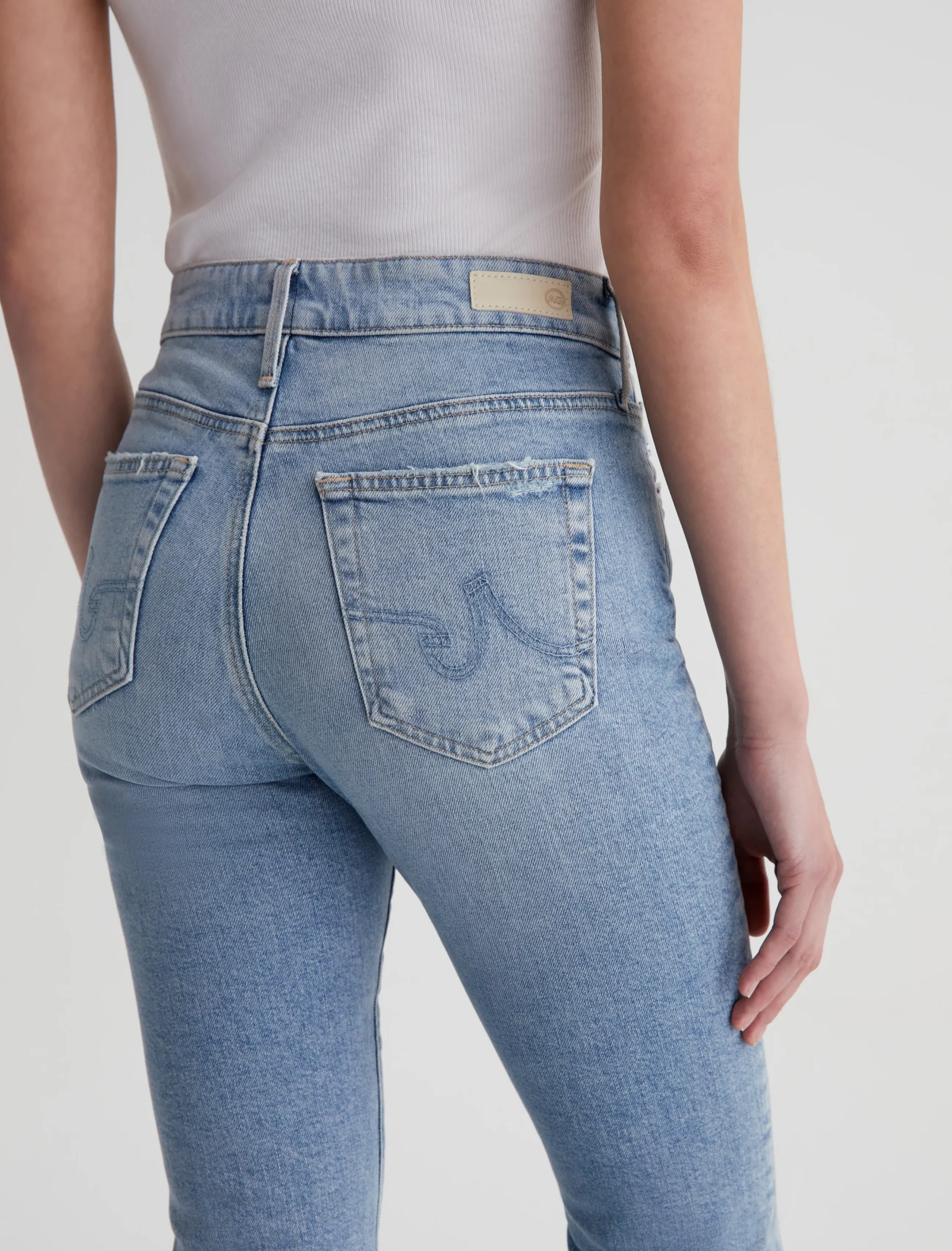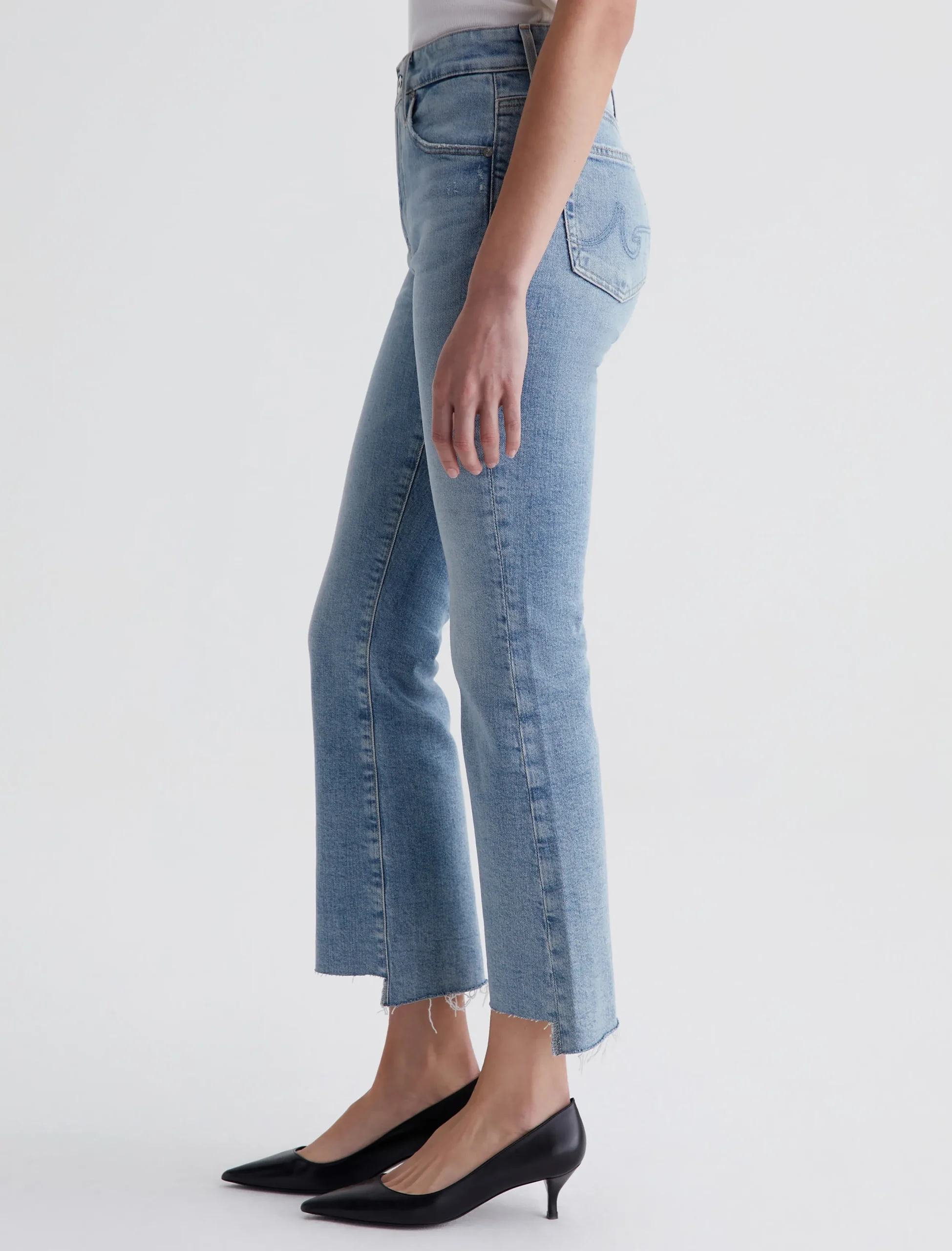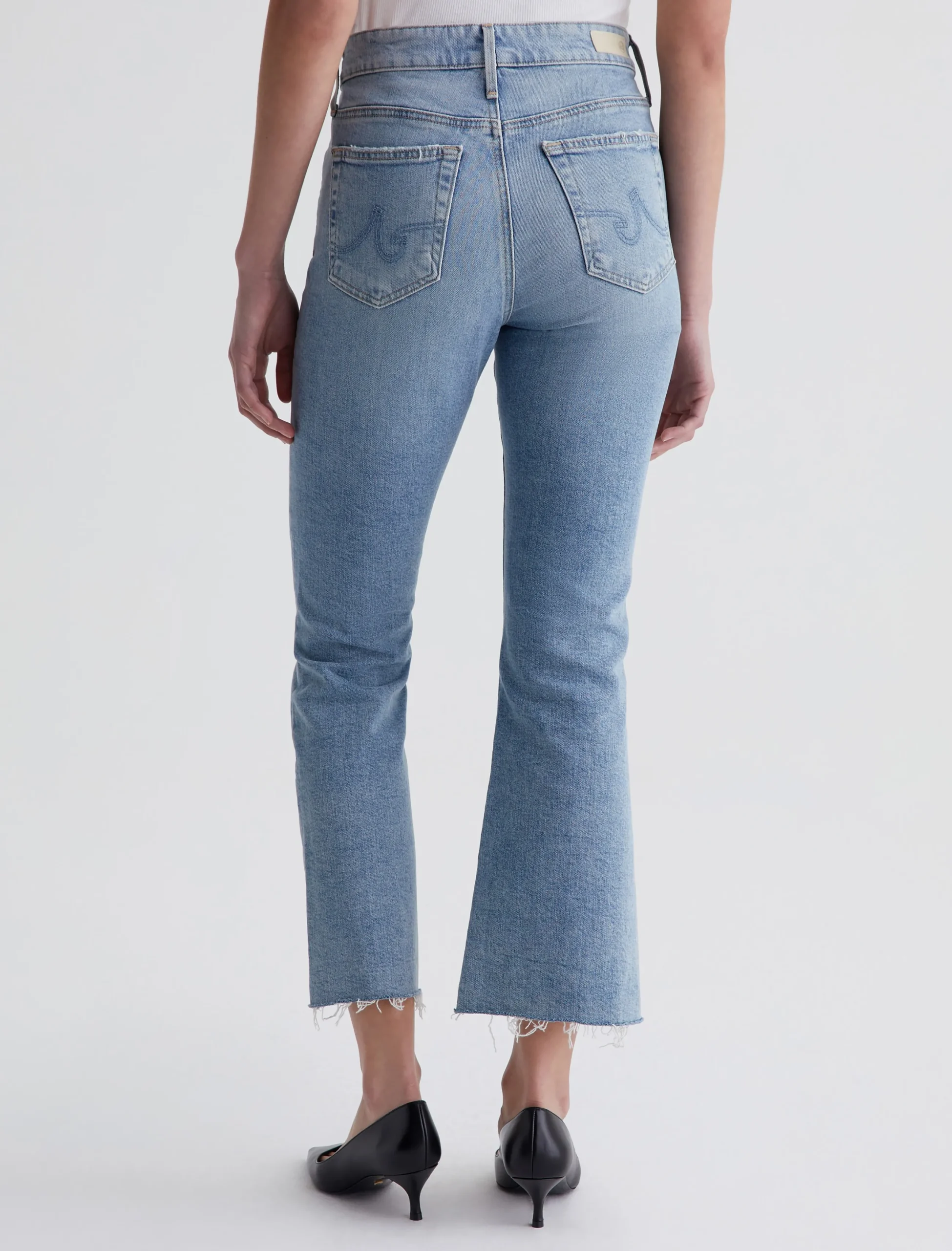 Our Farrah Boot Crop jeans feature a mid-rise bootcut silhouette with cropped step hems. The pair has a skinny fit through the legs before opening into a subtly flared shape. Made from 11.75 oz. Vintage Comfort Stretch Denim, these women’s bootcut jeans come in a light indigo stonewash with a sun-bleached fade and gently worn pocket edges.