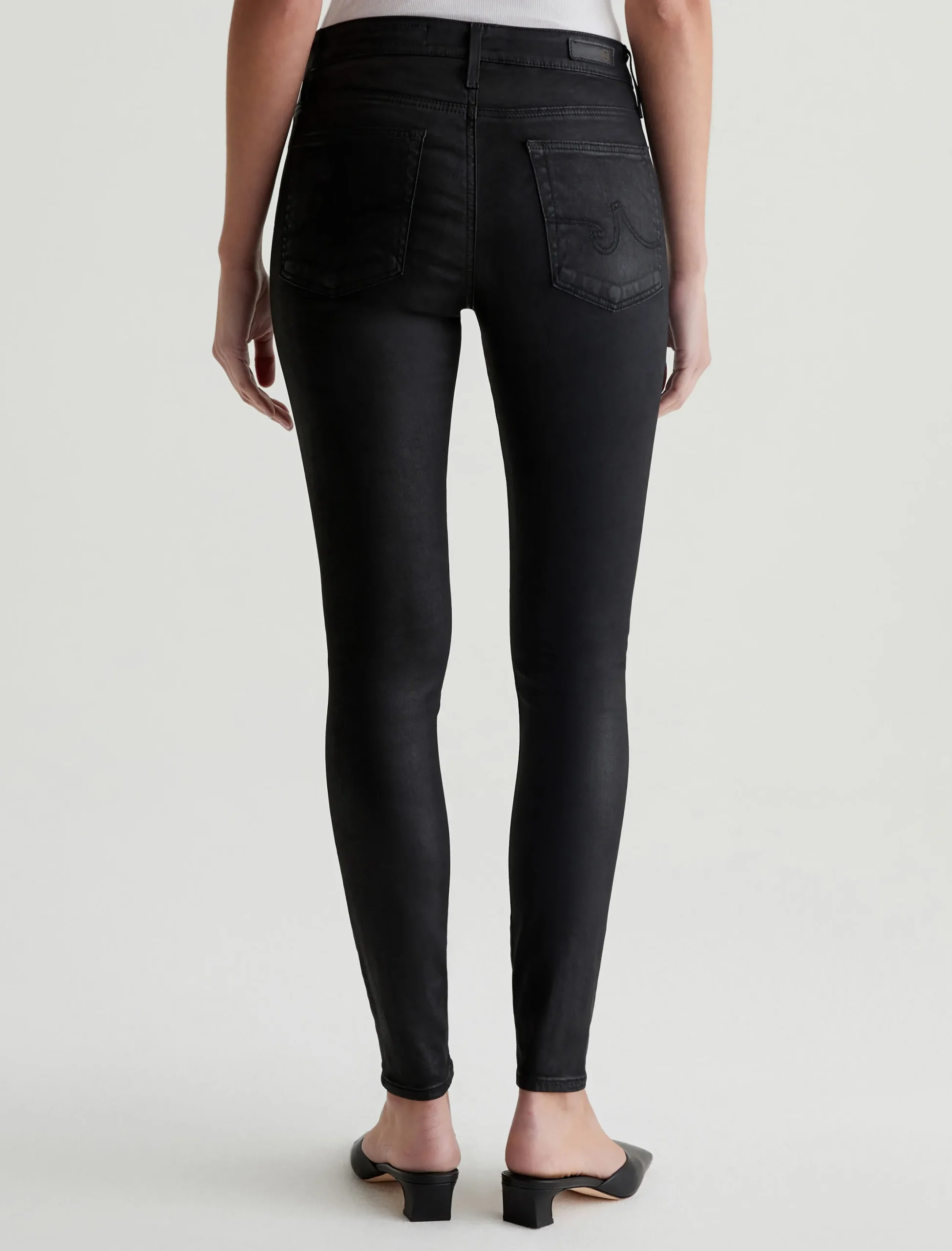 The Farrah Ankle skinny jean for women features a leatherette-coated black hue, cut with a flattering mid-rise waist and cropped length at the ankle. This women’s jean is designed in our Leatherette Luscious Super Stretch Sateen fabrication.