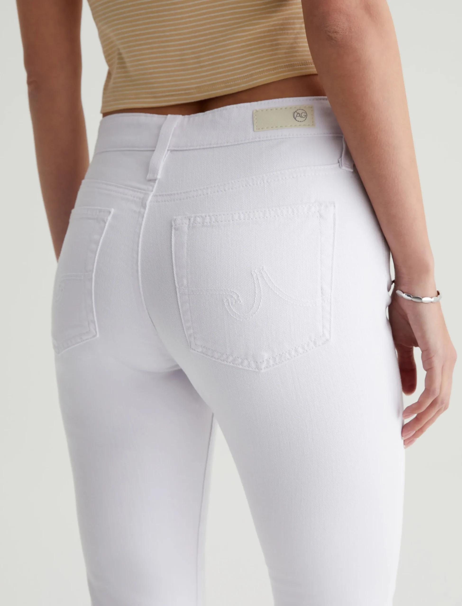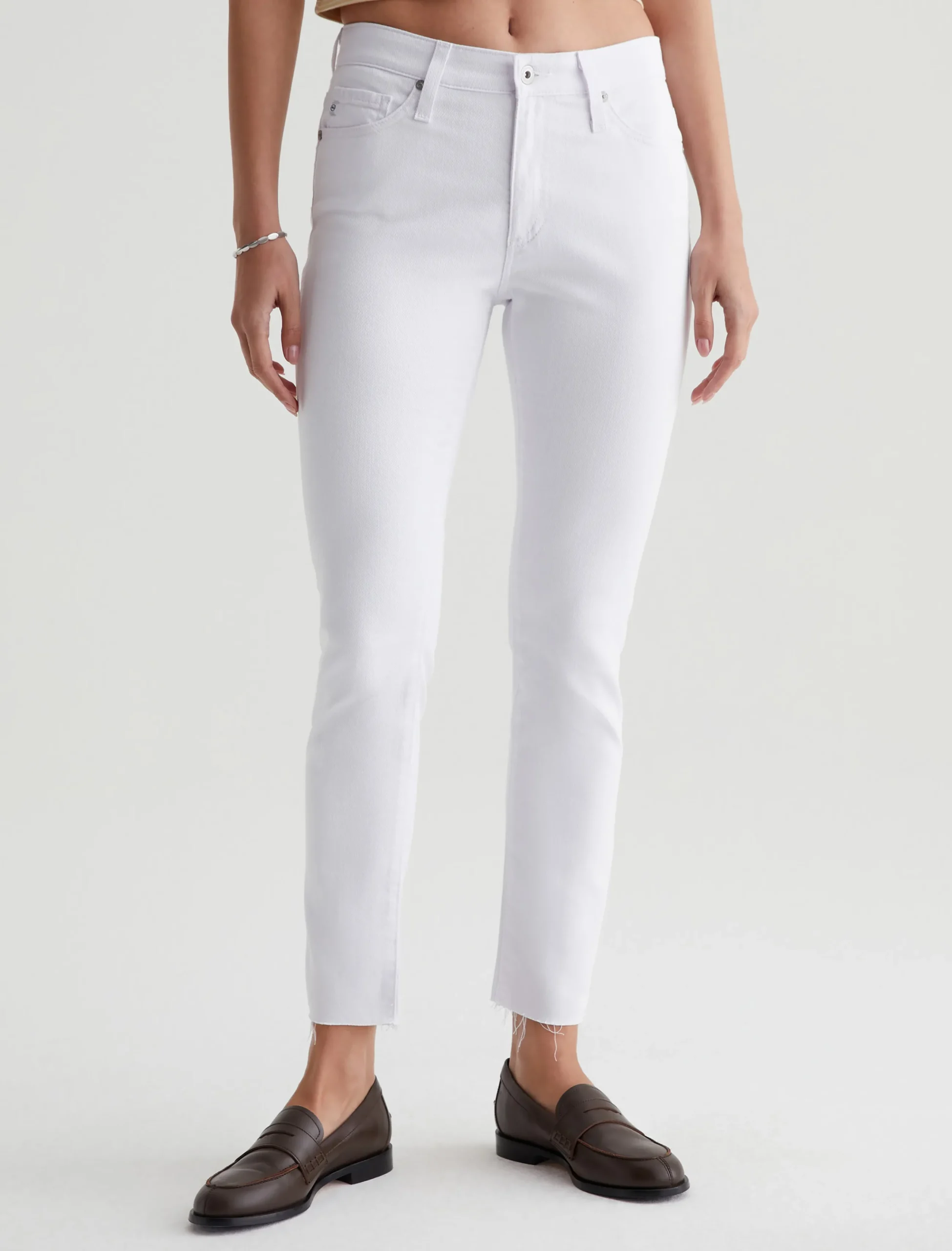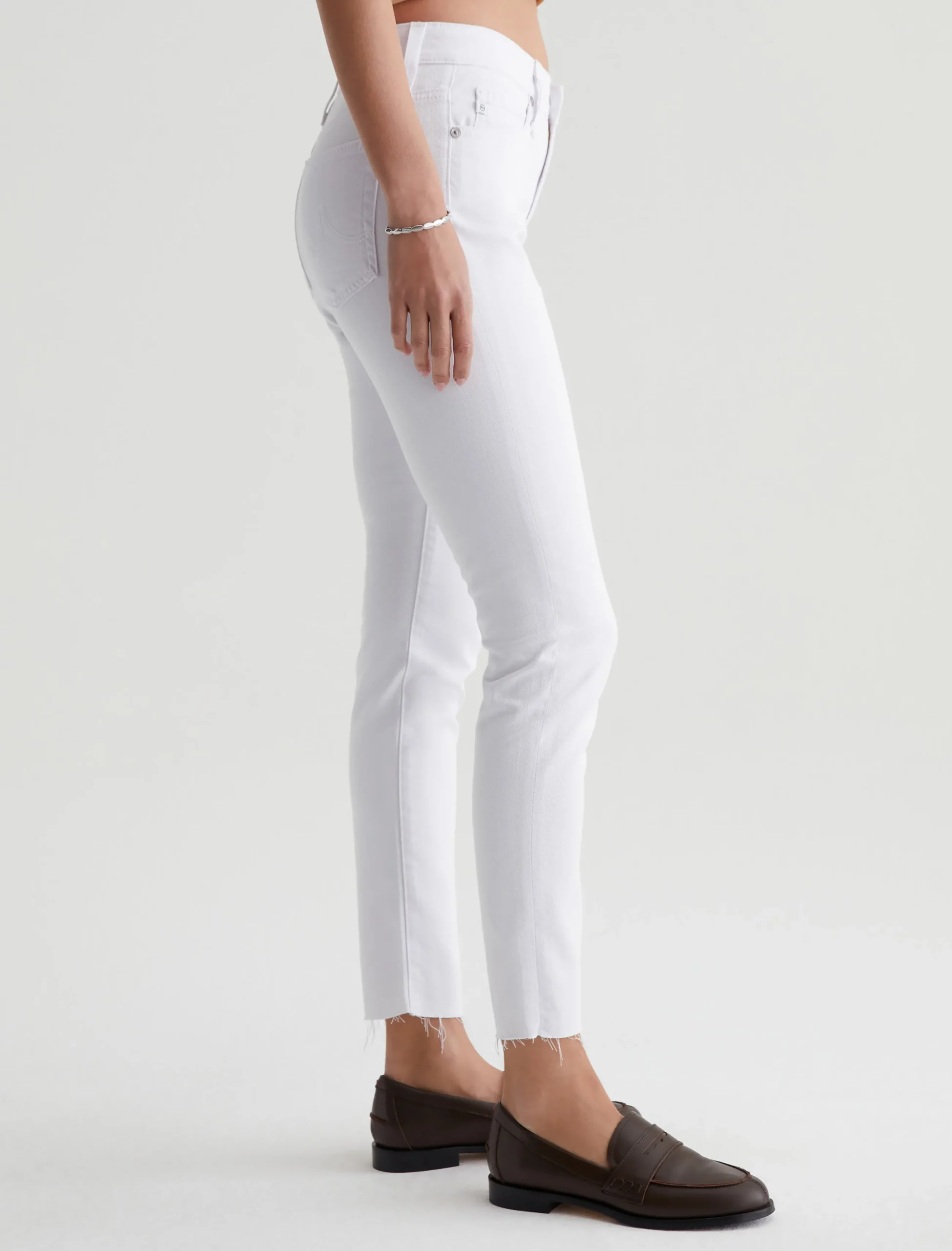 The Farrah Skinny Ankle jean in white features a flattering mid-rise waist and a streamlined fit through the legs, finishing with ankle-length raw hems. These five-pocket skinny jeans are crafted from 9.7 oz. Hyper-Soft Stretch Denim, an exclusive AG Cloud Soft Denim™ fabric. The special construction allows the yarns to gently relax and untwist for a supple feel that gets softer with every wear. There’s a generous amount of stretch woven in, offering a comfortable fit.