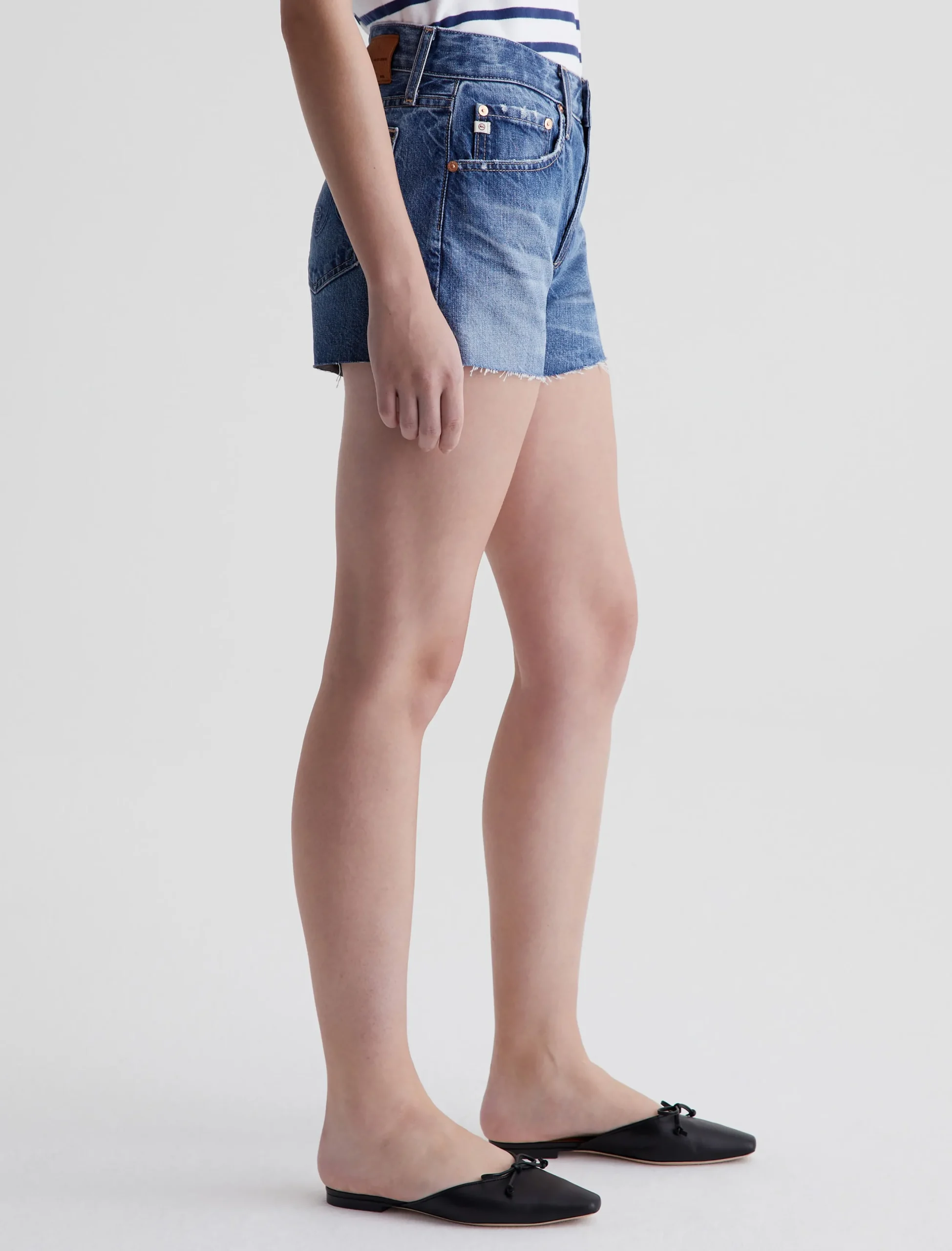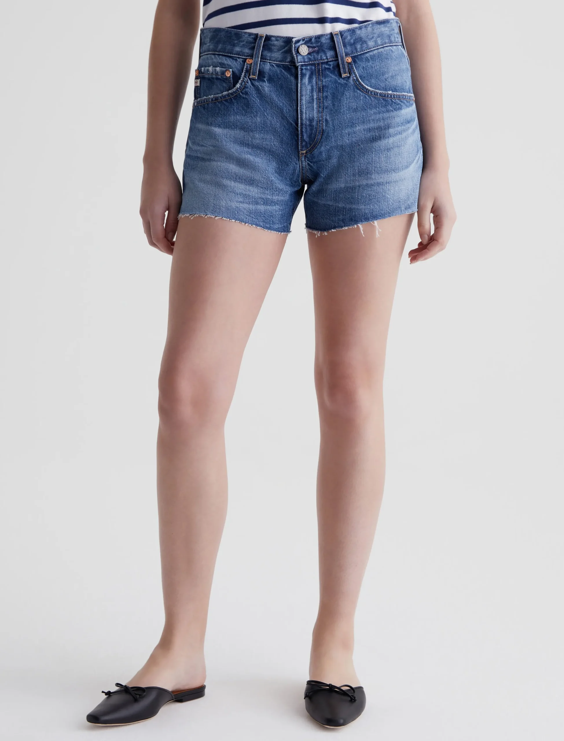 The Hailey Cut-Off Short is a boyfriend short for women, done here in an AG-ed™ medium indigo wash with heavy fading, whiskering, and raw hems. Hailey offers a flattering high-rise waist and relaxed silhouette. These women’s jean shorts are designed in 11.75 oz. Legion Denim made from 100% cotton. A bit of distressing at the pockets adds to the lived-in character.