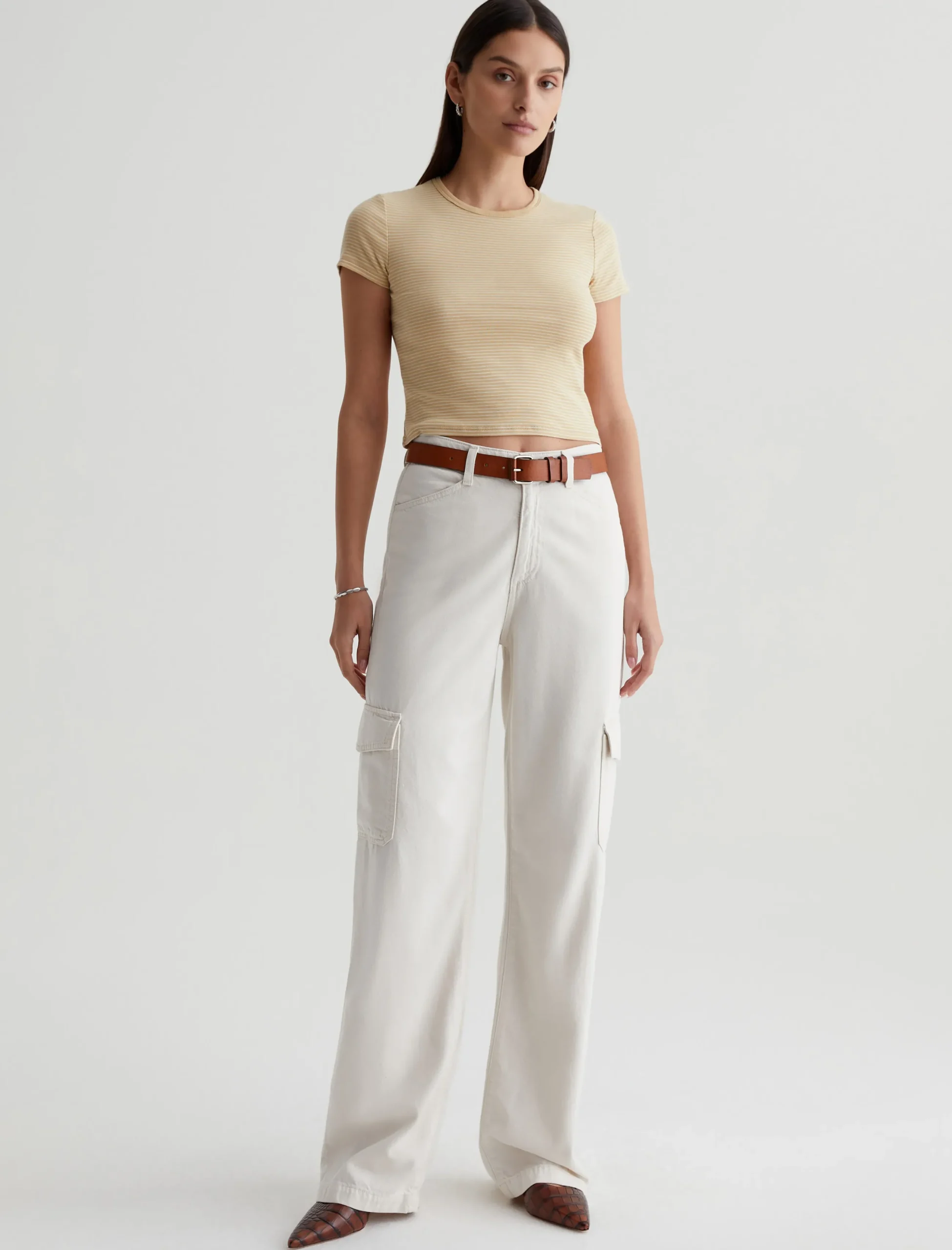 The Hutton Crew offers a throwback to ’70s style with its shrunken silhouette. Defined by a crew neckline and short sleeves, this baby tee fits close to the body and lands at the top of your high-waisted jeans. It’s soft and comfortable with the perfect amount of stretch in a yellow cotton-blend rib knit adorned by slim blue stripes. Solid yellow trim accents the neckline.