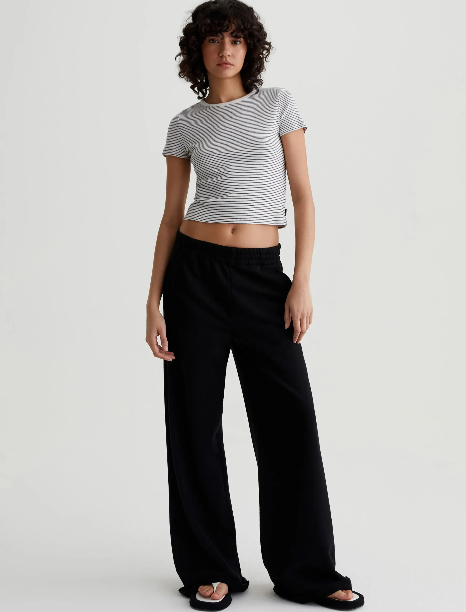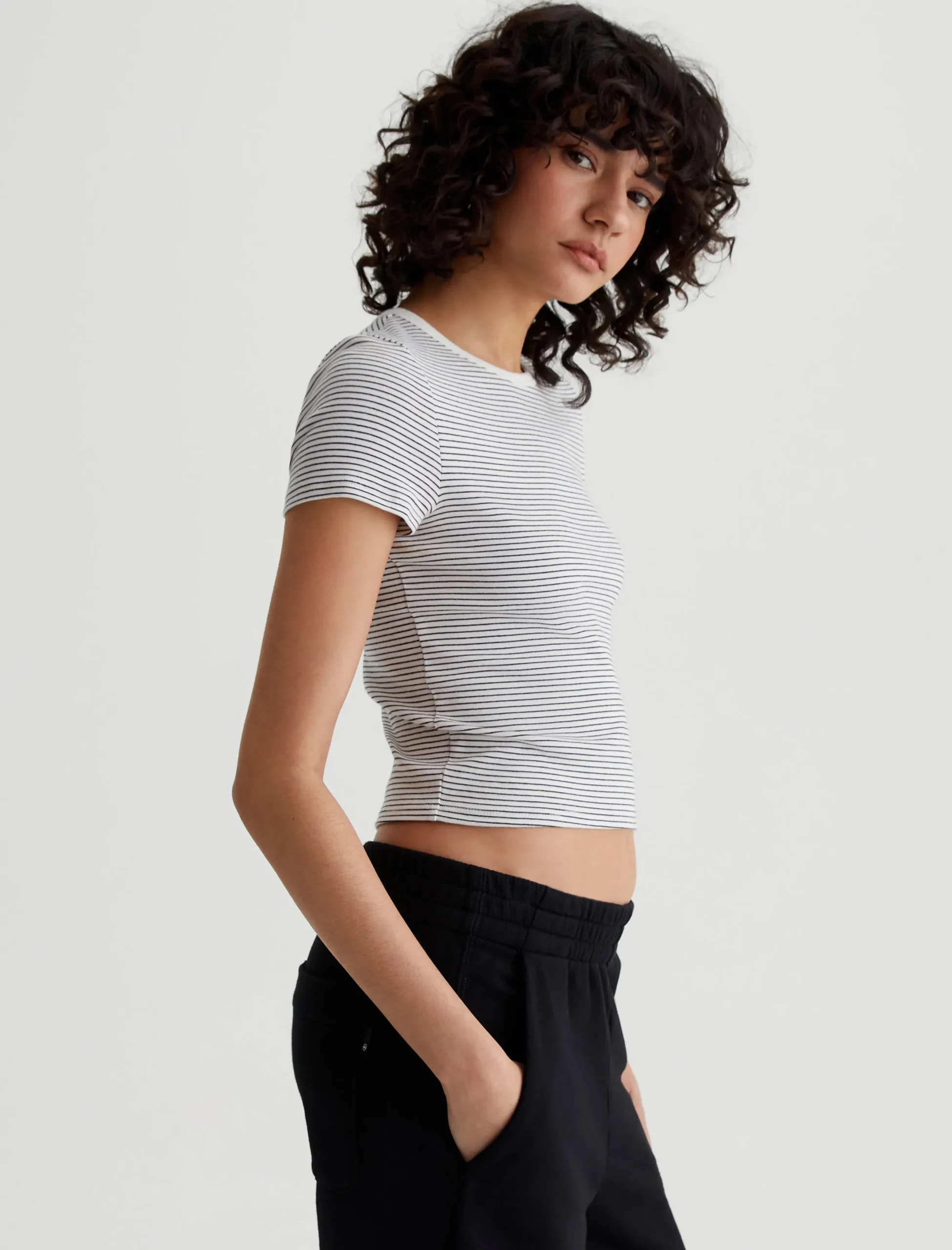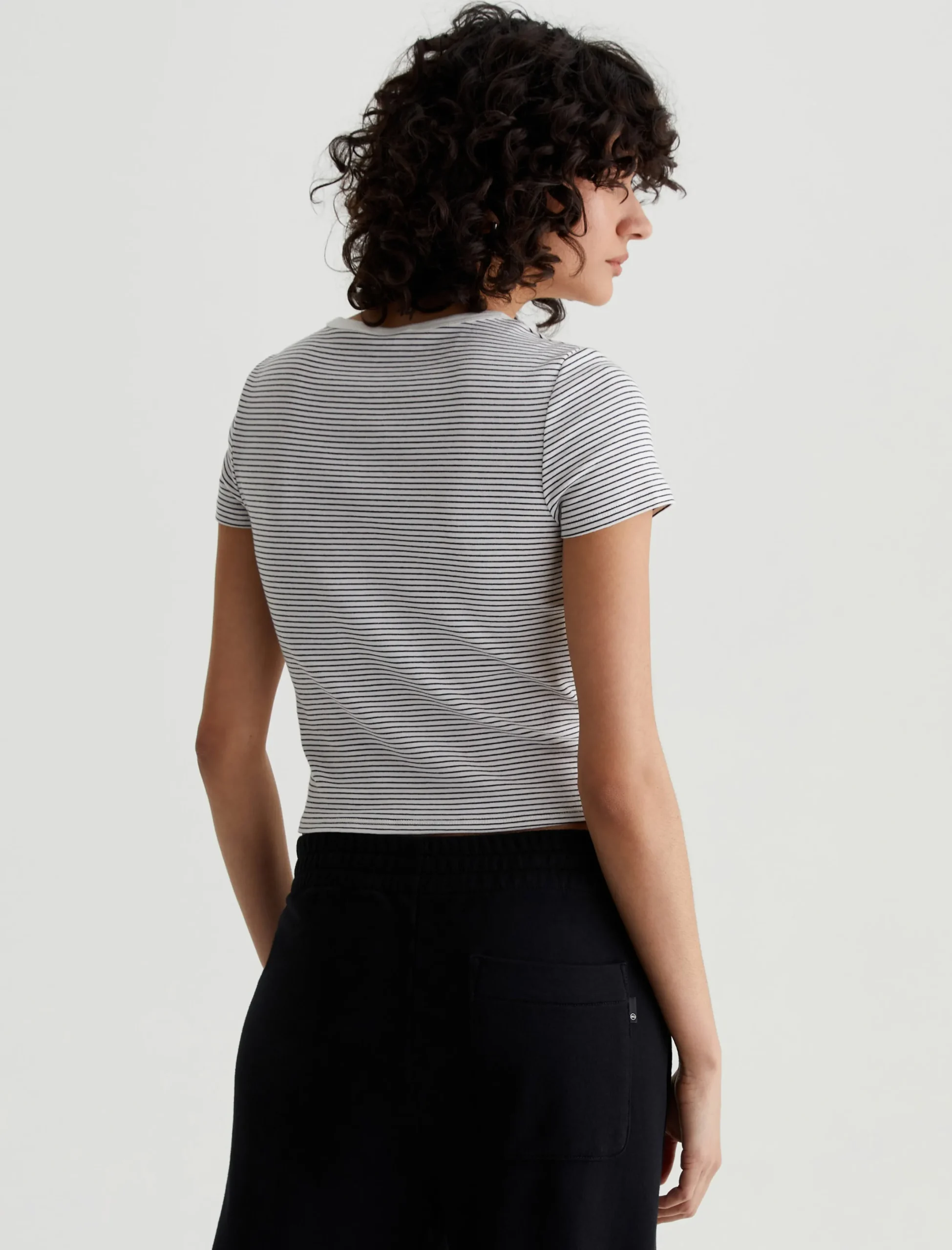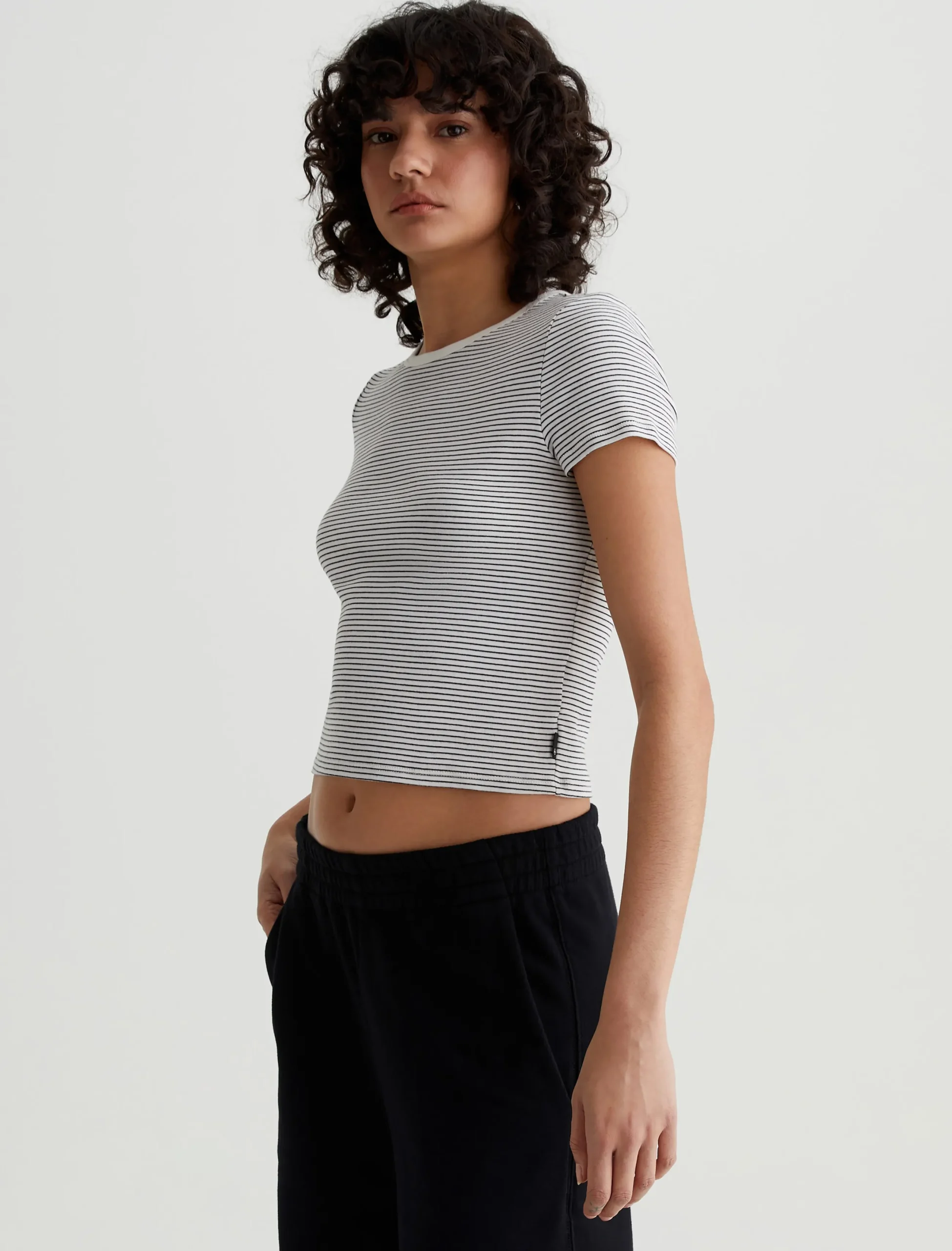 The Hutton Crew offers a throwback to ’70s style with its shrunken silhouette. Defined by a crew neckline and short sleeves, this baby tee fits close to the body and lands at the top of your high-waisted jeans. It’s soft and comfortable with the perfect amount of stretch in a white cotton-blend rib knit accented by slim, blue stripes. Solid white trim accents the neckline.