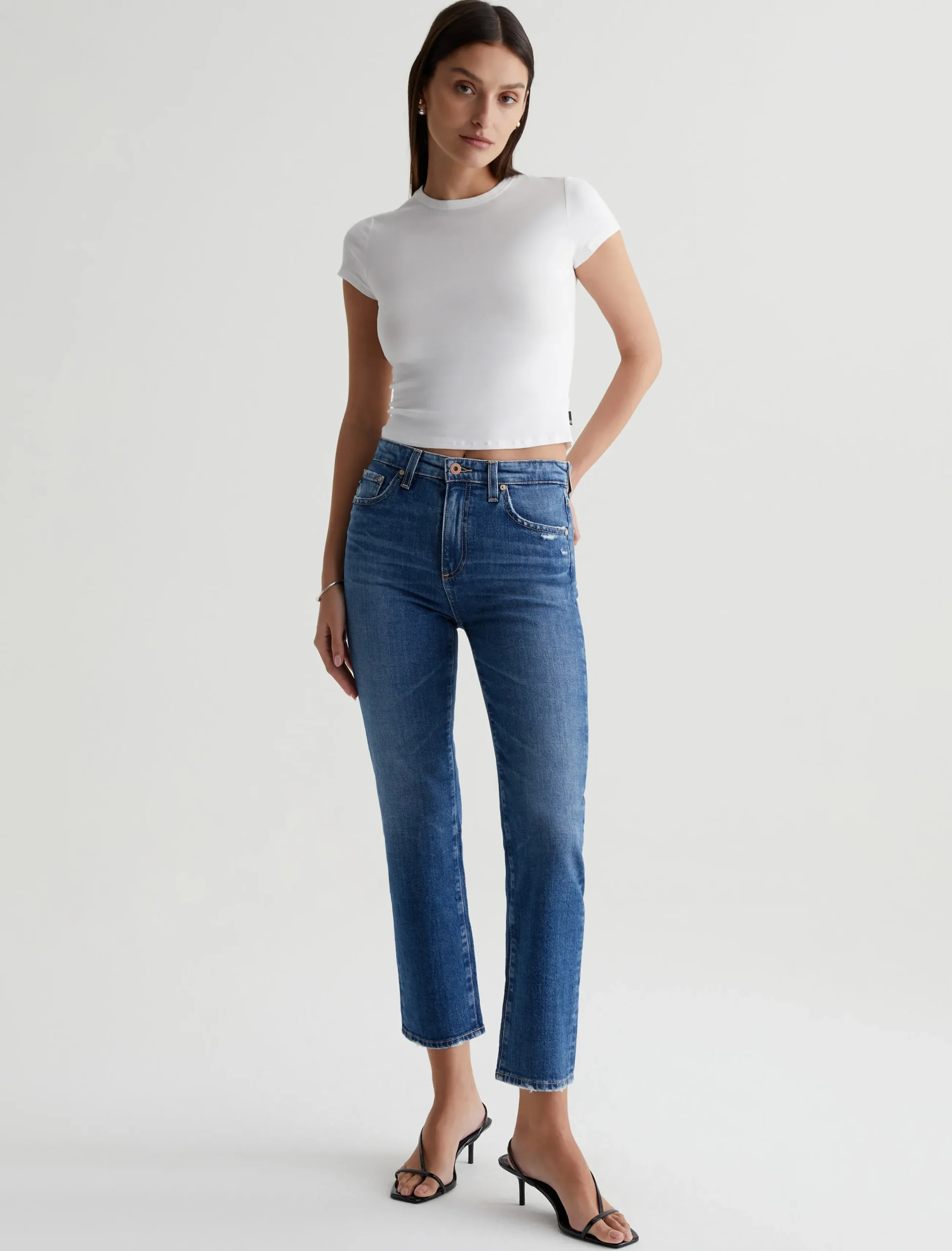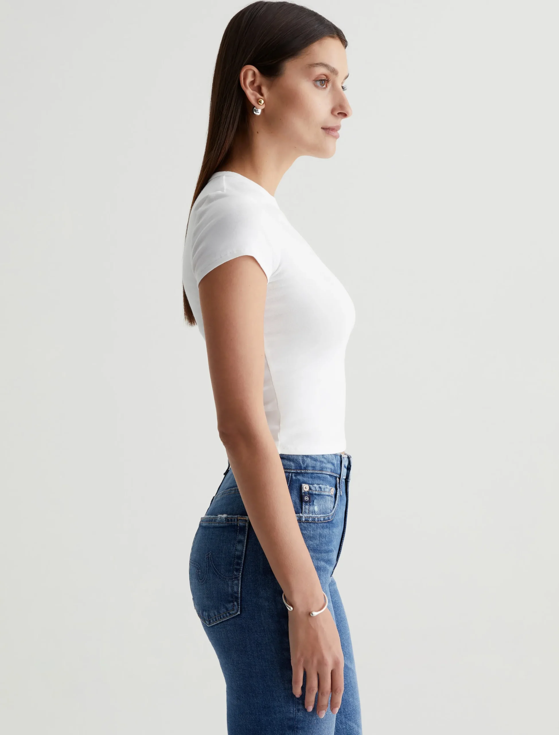 The Hutton Crew offers a throwback to ’70s style with its shrunken silhouette. Defined by a crew neckline and short sleeves, this baby tee fits close to the body and lands at the top of your high-waisted jeans. It’s soft and comfortable with the perfect amount of stretch in a white cotton-blend rib knit.