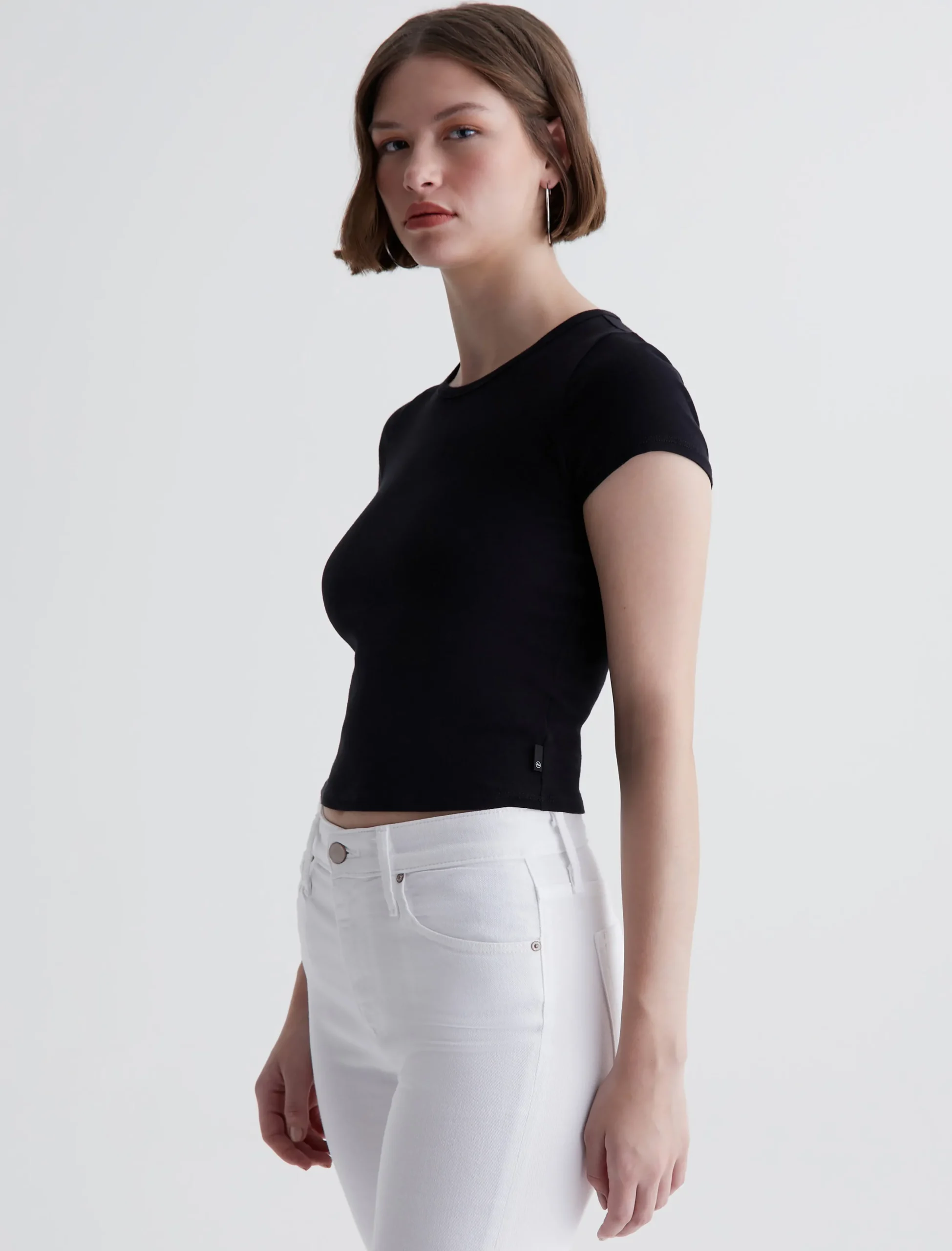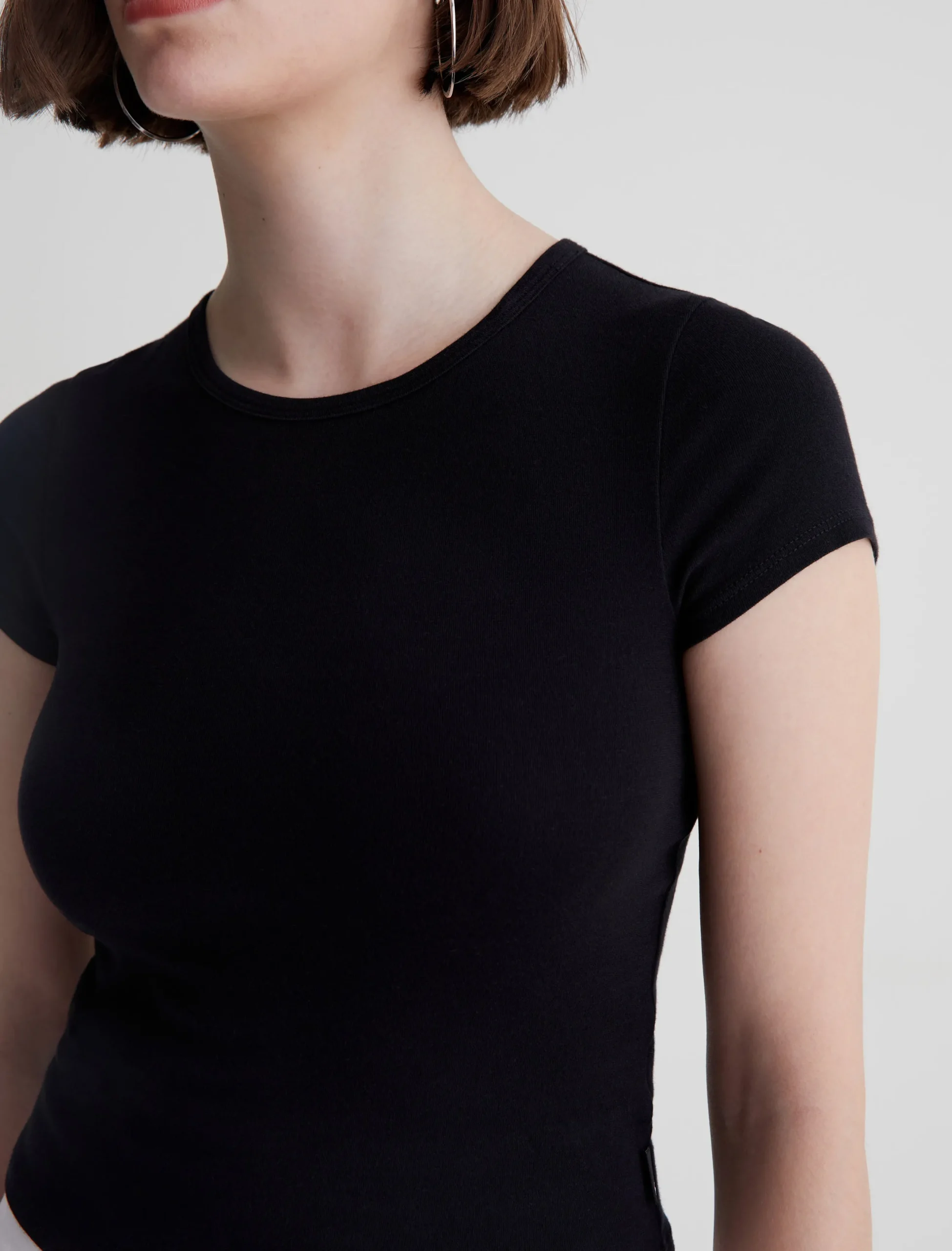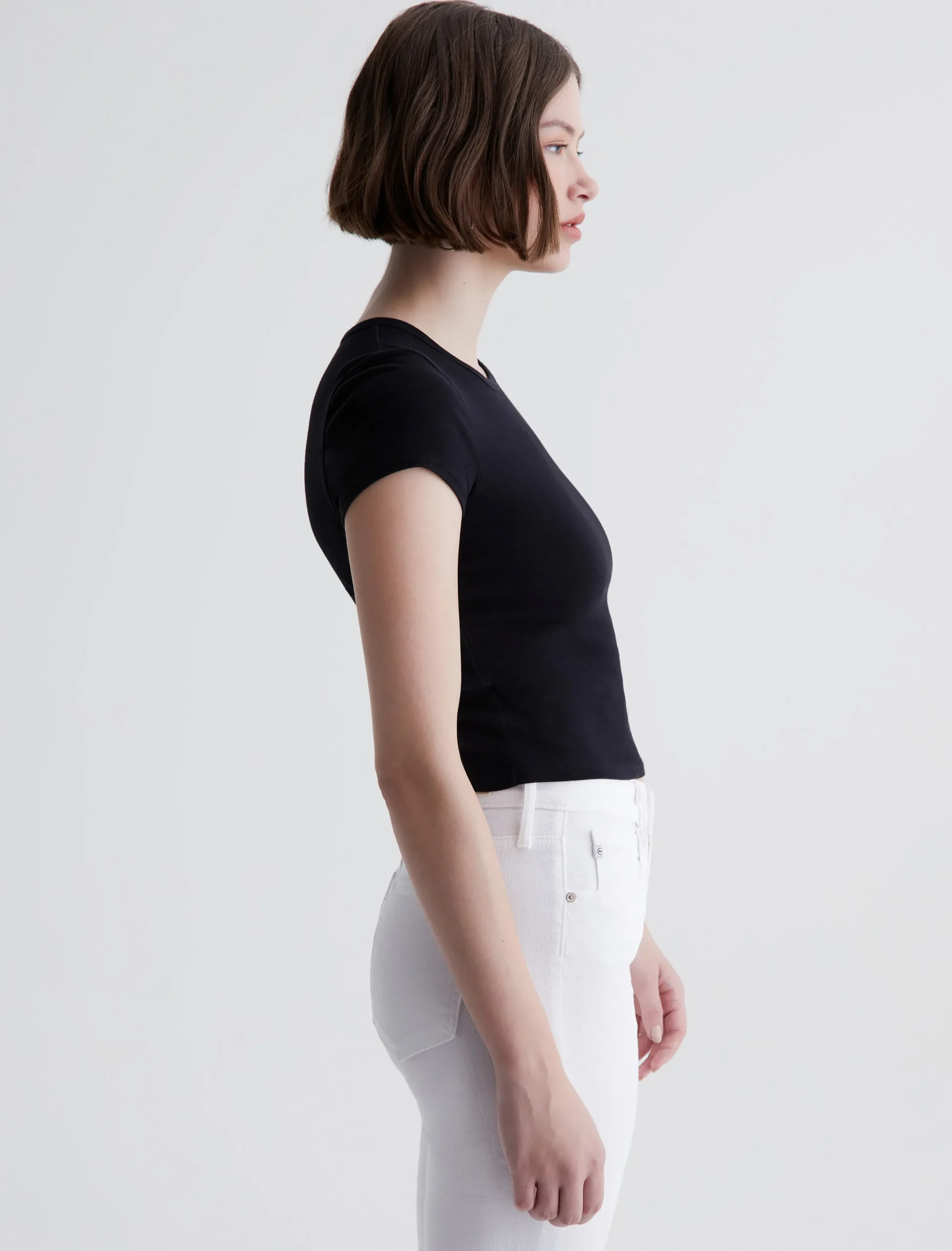 The Hutton Crew offers a throwback to ’70s style with its shrunken silhouette. Defined by a crew neckline and short sleeves, this baby tee fits close to the body and lands at the top of your high-waisted jeans. It’s soft and comfortable with the perfect amount of stretch in a black cotton-blend rib knit.