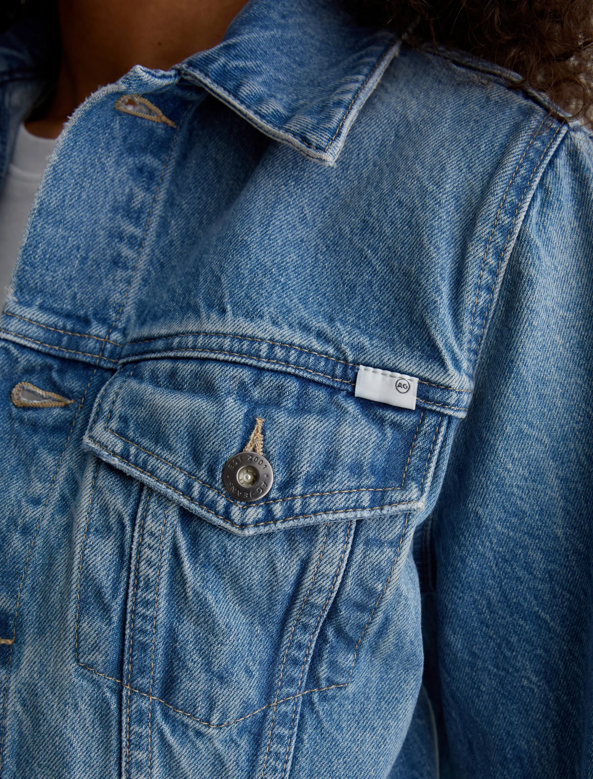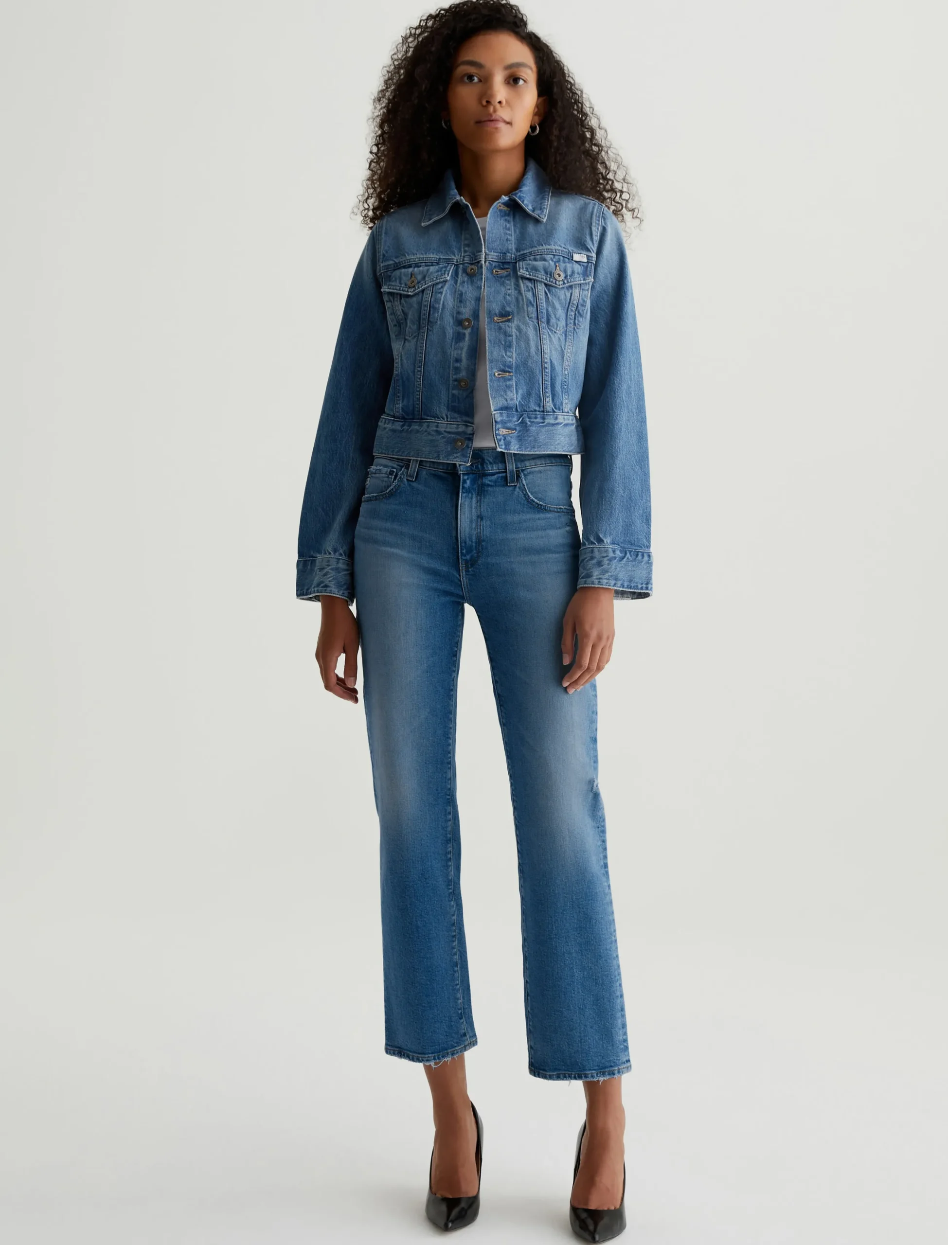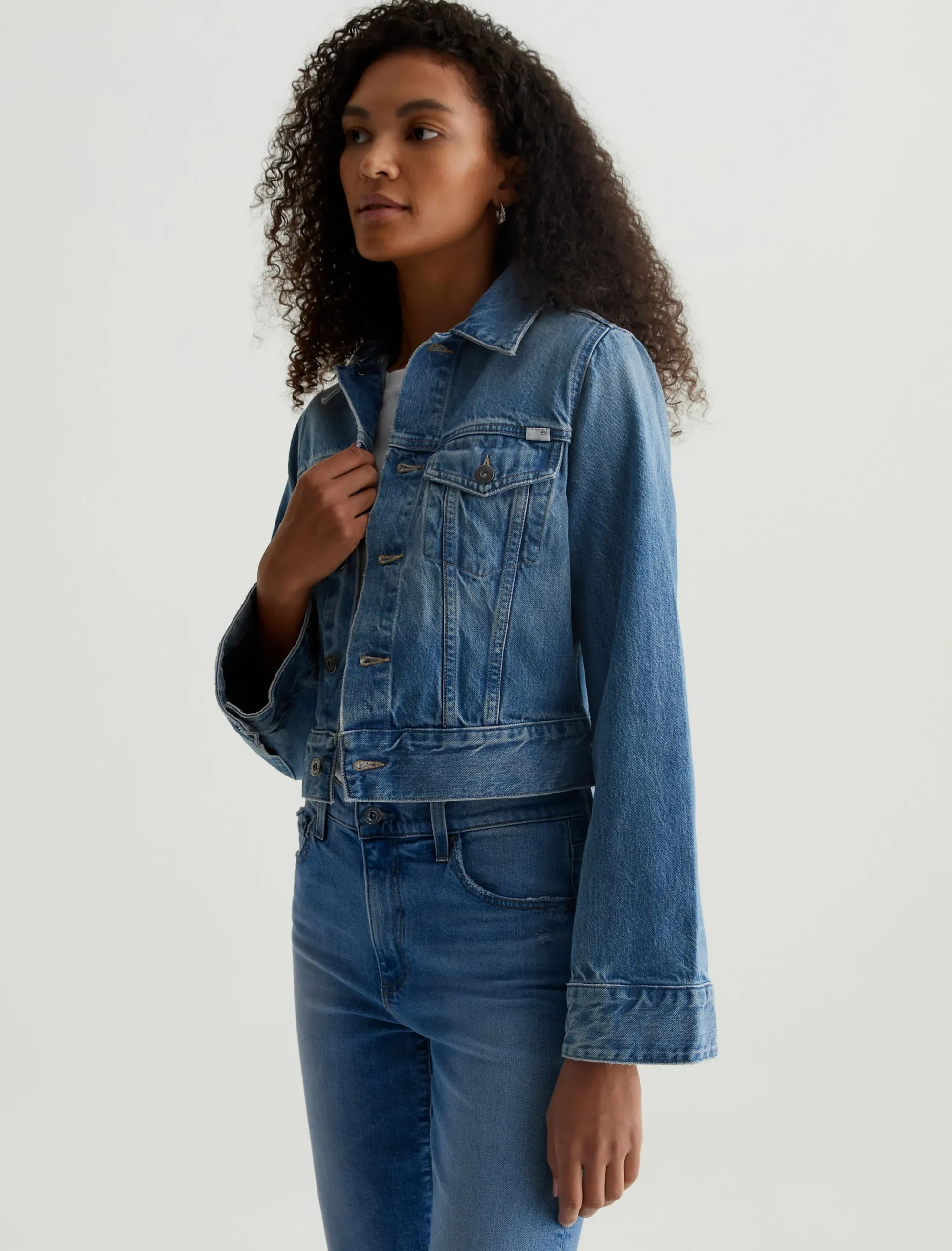 The Isa Jacket is a modern trucker cut for a straight, cropped fit with bell-shaped sleeves. Designed in hardy 13 oz. Sioux Rigid Denim in a medium indigo wash, this is the kind of piece that gets even better as it wears in. Classic details include flap pockets, front placket with metal hardware, and button tabs at the waistband.