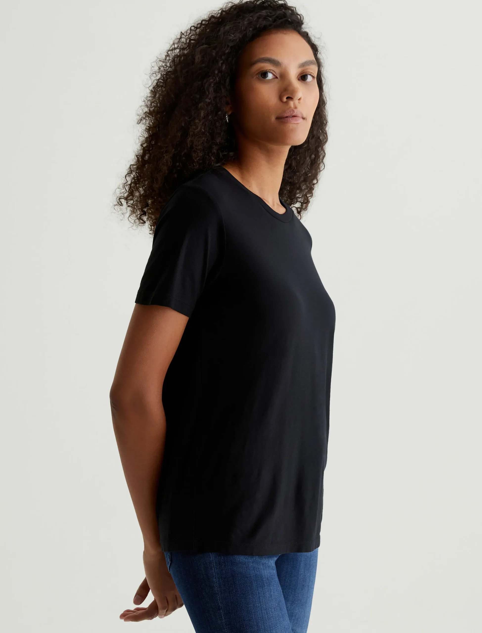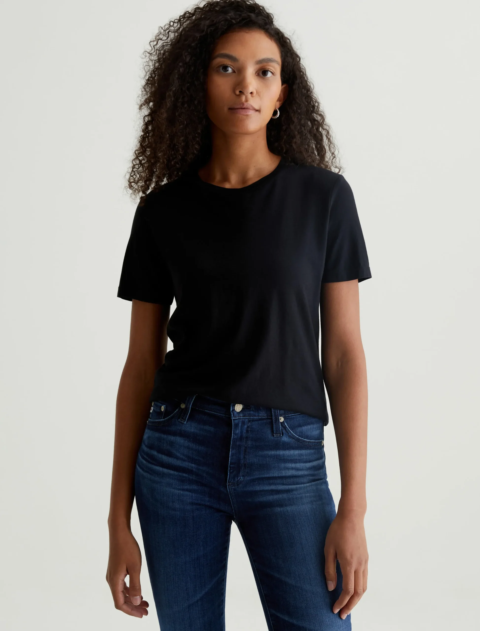 Our Jagger Crew Neck is the perfect short sleeve tee for your assortment of basic essentials. Featuring a deep black hue, this classic crew offers a 1X1 rib neckband. Seasonless, elevated, and luxurious—this fabrication and fit provides unique versatility in styling your everyday look. Our Jersey Knit offers a luxurious comfort that is unrivaled—knitted with both S-twist and Z-twist yarn to sustain longevity and stability, preventing unnecessary twisting and torquing. During the production process, the S-twist yarn is spun counter-clockwise creating a right-handed twill. The Z-twist yarn works in opposition, spinning clockwise for a left-handed twill. This opposition—when working together—yields a softer, more durable fabrication and gives strength to the yarn making it more difficult to pull apart. Designed in 100% Cotton.