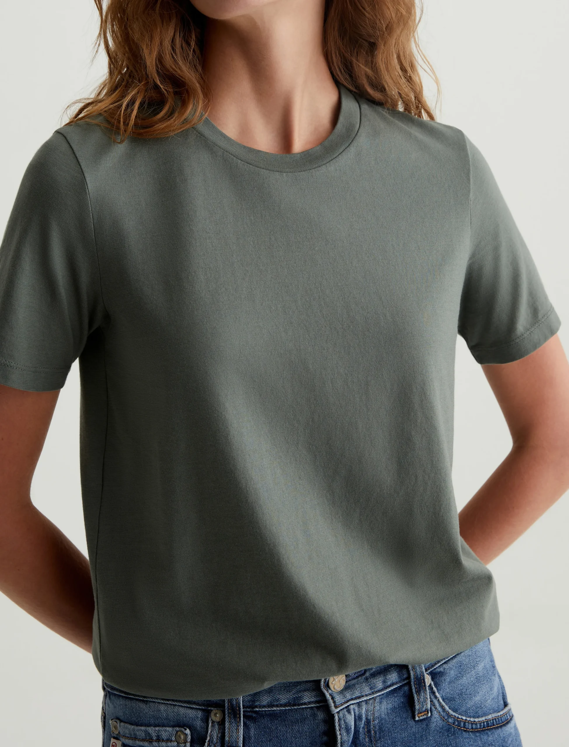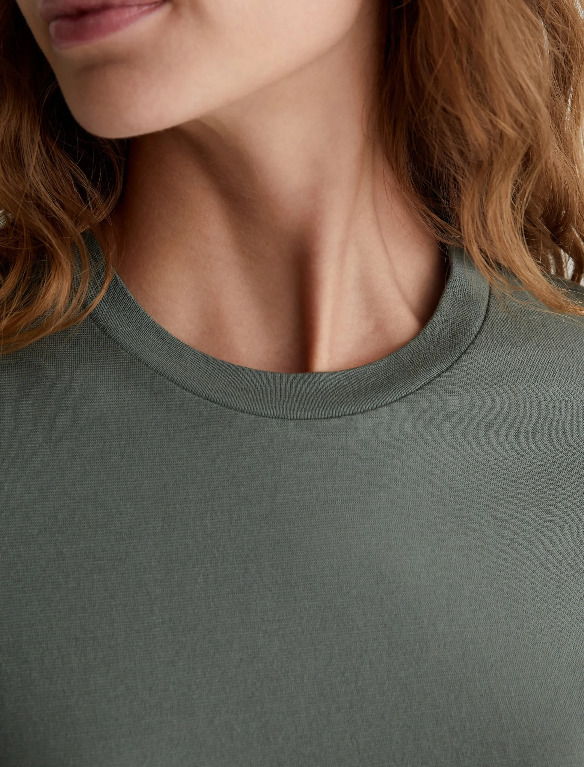 Our Jagger Crew Neck is the perfect short sleeve tee for your assortment of basic essentials. Featuring a hunter green hue, this classic crew offers a 1X1 rib neckband. Seasonless, elevated, and luxurious—this fabrication and fit provides unique versatility in styling your everyday look. Our Jersey Knit offers a luxurious comfort that is unrivaled—knitted with both S-twist and Z-twist yarn to sustain longevity and stability, preventing unnecessary twisting and torquing. During the production process, the S-twist yarn is spun counter-clockwise creating a right-handed twill. The Z-twist yarn works in opposition, spinning clockwise for a left-handed twill. This opposition—when working together—yields a softer, more durable fabrication and gives strength to the yarn making it more difficult to pull apart. Designed in 100% Cotton.