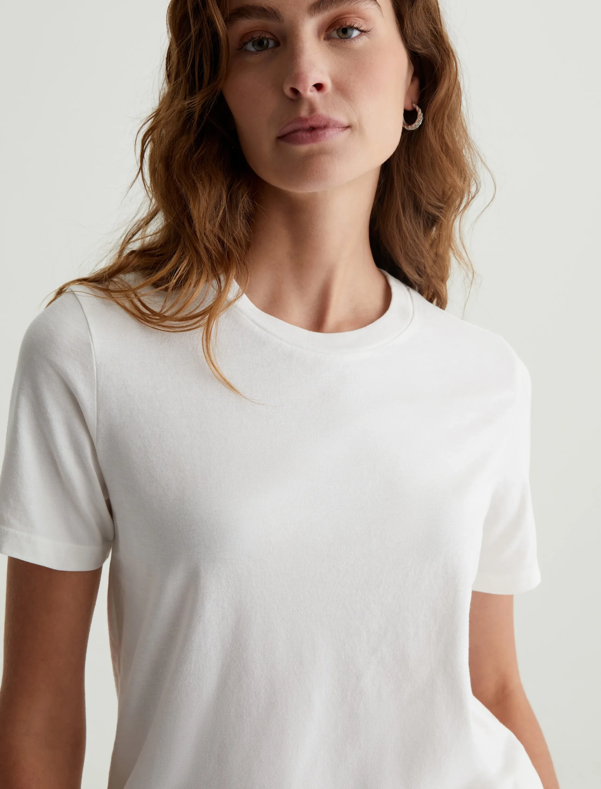 Our Jagger Crew Neck is the perfect short sleeve tee for your assortment of basic essentials. Featuring an ivory hue, this classic crew offers a 1X1 rib neckband. Seasonless, elevated, and luxurious—this fabrication and fit provides unique versatility in styling your everyday look. Our Jersey Knit offers a luxurious comfort that is unrivaled—knitted with both S-twist and Z-twist yarn to sustain longevity and stability, preventing unnecessary twisting and torquing. During the production process, the S-twist yarn is spun counter-clockwise creating a right-handed twill. The Z-twist yarn works in opposition, spinning clockwise for a left-handed twill. This opposition—when working together—yields a softer, more durable fabrication and gives strength to the yarn making it more difficult to pull apart. Designed in 100% Cotton.