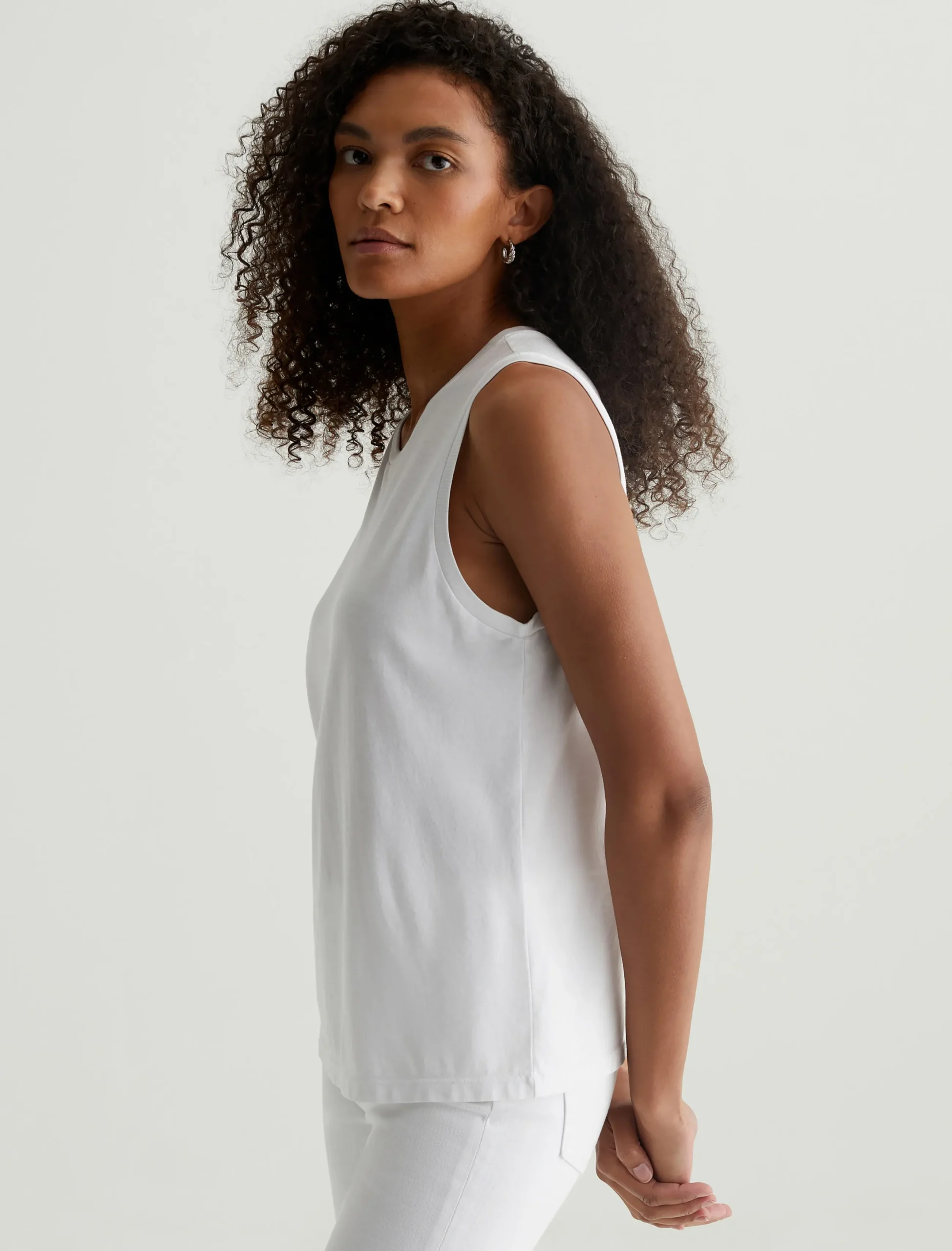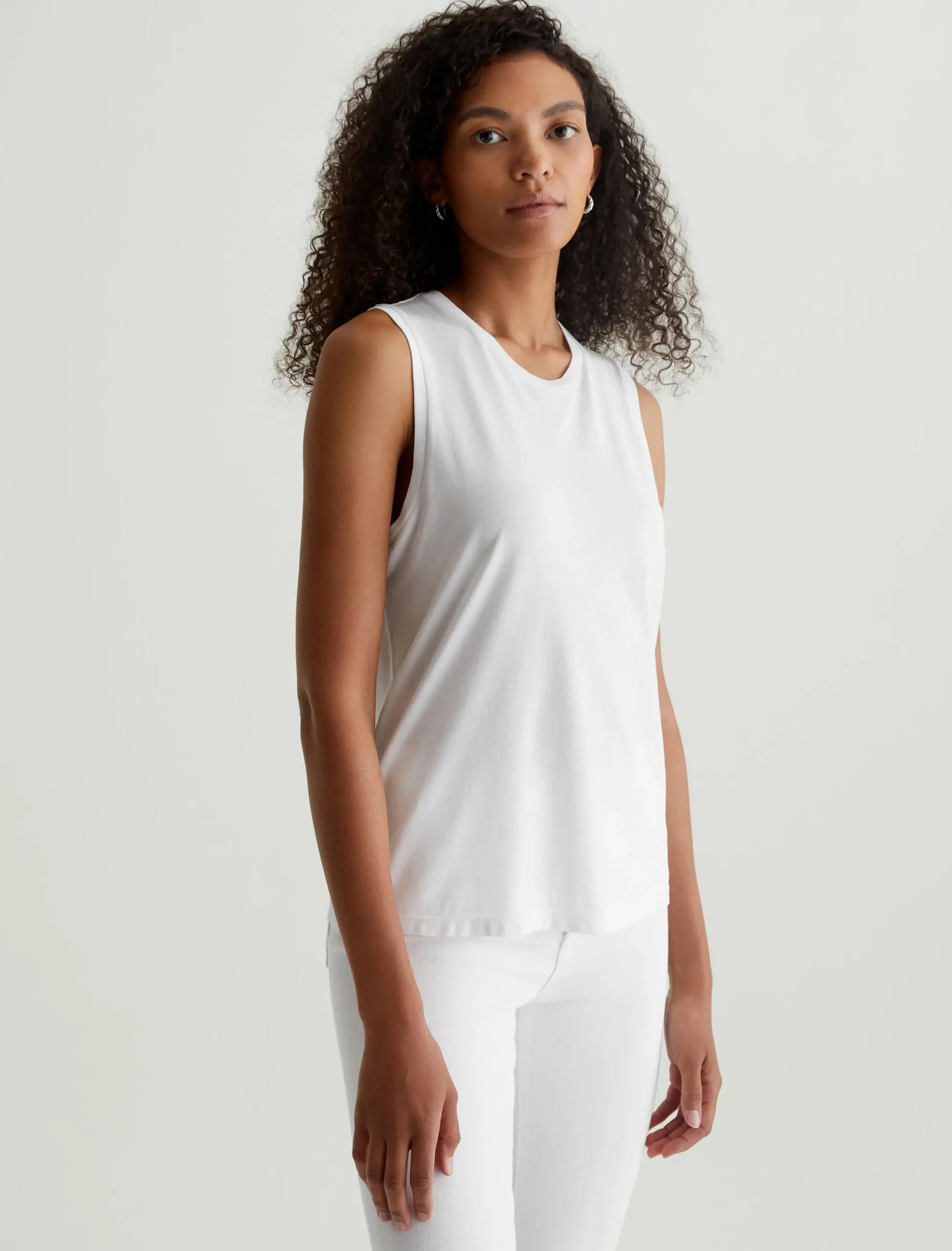 Our Jagger Muscle Tank in white is the perfect sleeveless muscle tank for all year round, cut with a higher arm hole to be worn alone or under jackets and blazers. The 1X1 rib neckband makes this a classic—yet it still feels modern, casual, and cool in its silhouette. Our Jersey Knit offers a luxurious comfort that is unrivaled—knitted with both S-twist and Z-twist yarn to sustain longevity and stability, preventing unnecessary twisting and torquing. During the production process, the S-twist yarn is spun counter-clockwise creating a right-handed twill. The Z-twist yarn works in opposition, spinning clockwise for a left-handed twill. This opposition—when working together—yields a softer, more durable fabrication and gives strength to the yarn making it more difficult to pull apart. Designed in 100% Cotton