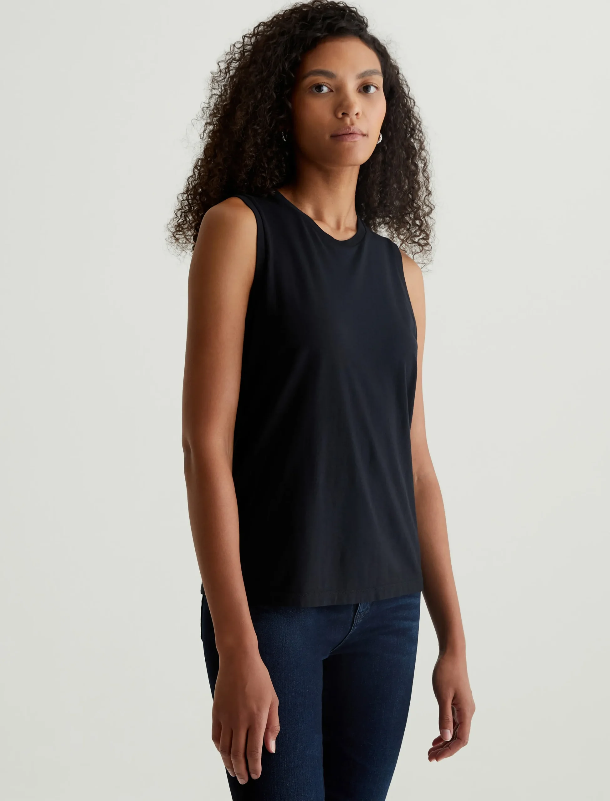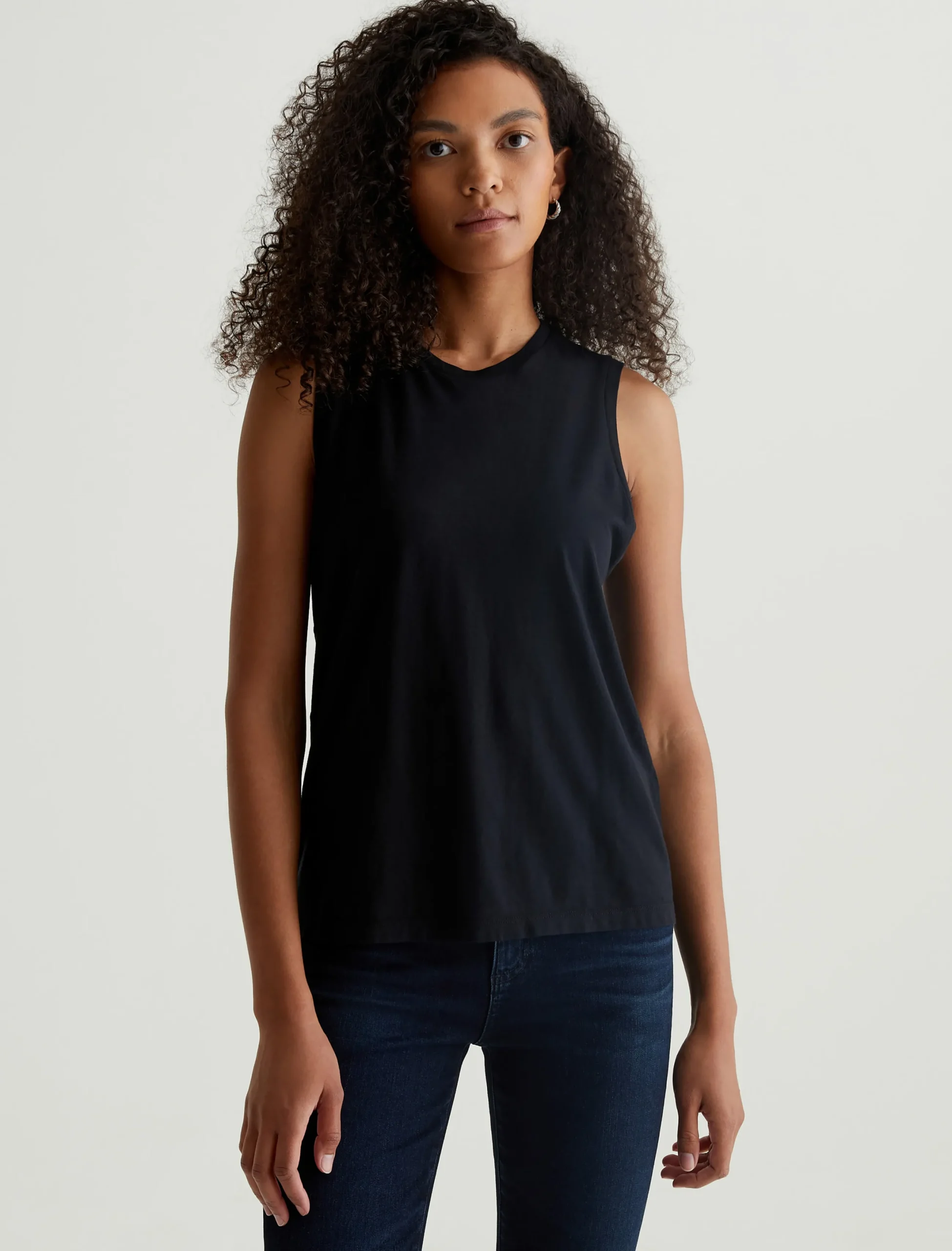 Our Jagger Muscle Tank in black is the perfect sleeveless muscle tank for all year round, cut with a higher arm hole to be worn alone or under jackets and blazers. The 1X1 rib neckband makes this a classic—yet it still feels modern, casual, and cool in its silhouette. Our Jersey Knit offers a luxurious comfort that is unrivaled—knitted with both S-twist and Z-twist yarn to sustain longevity and stability, preventing unnecessary twisting and torquing. During the production process, the S-twist yarn is spun counter-clockwise creating a right-handed twill. The Z-twist yarn works in opposition, spinning clockwise for a left-handed twill. This opposition—when working together—yields a softer, more durable fabrication and gives strength to the yarn making it more difficult to pull apart. Designed in 100% Cotton