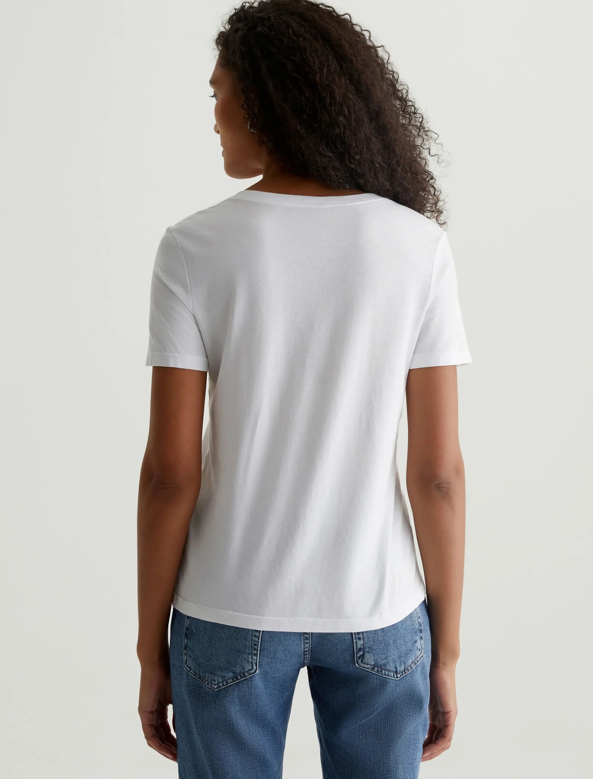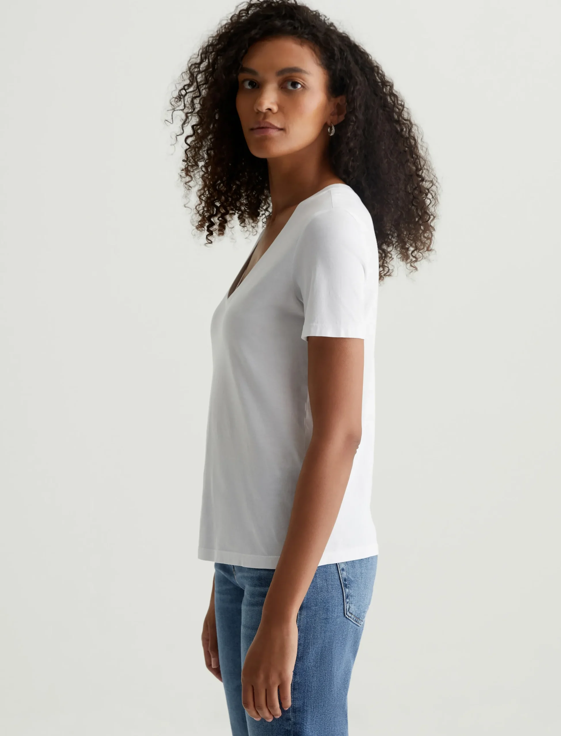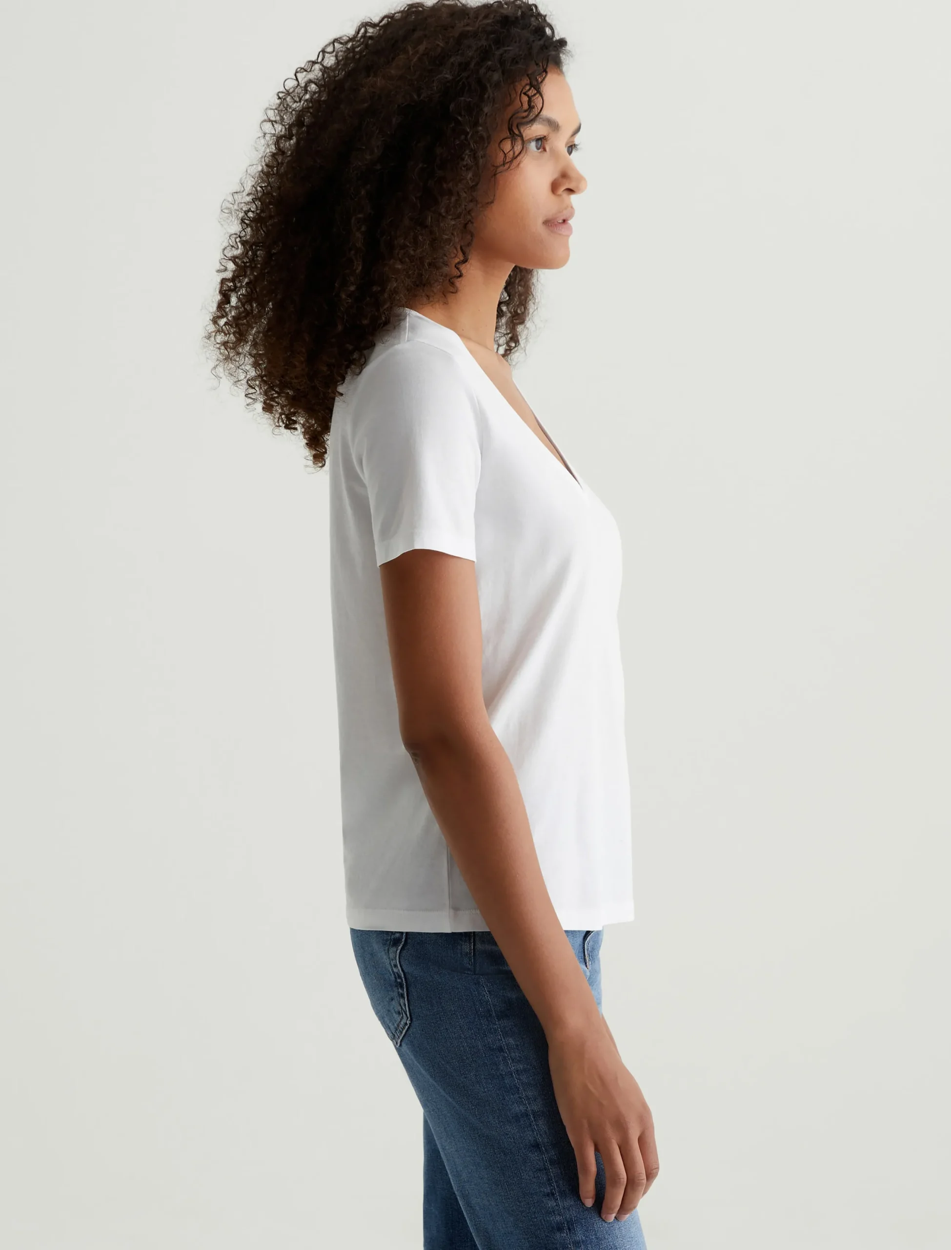 The Jagger V-Neck tee in white is a classic, added to our Basic Essentials collection to offer effortless styling options for your wardrobe. The thinner rib neckband gives imparts a modern feel to a classic neckline. Our Jersey Knit offers a luxurious comfort that is unrivaled—knitted with both S-twist and Z-twist yarn to sustain longevity and stability, preventing unnecessary twisting and torquing. During the production process, the S-twist yarn is spun counter-clockwise creating a right-handed twill. The Z-twist yarn works in opposition, spinning clockwise for a left-handed twill. This opposition—when working together—yields a softer, more durable fabrication and gives strength to the yarn making it more difficult to pull apart. Designed in 100% Cotton.