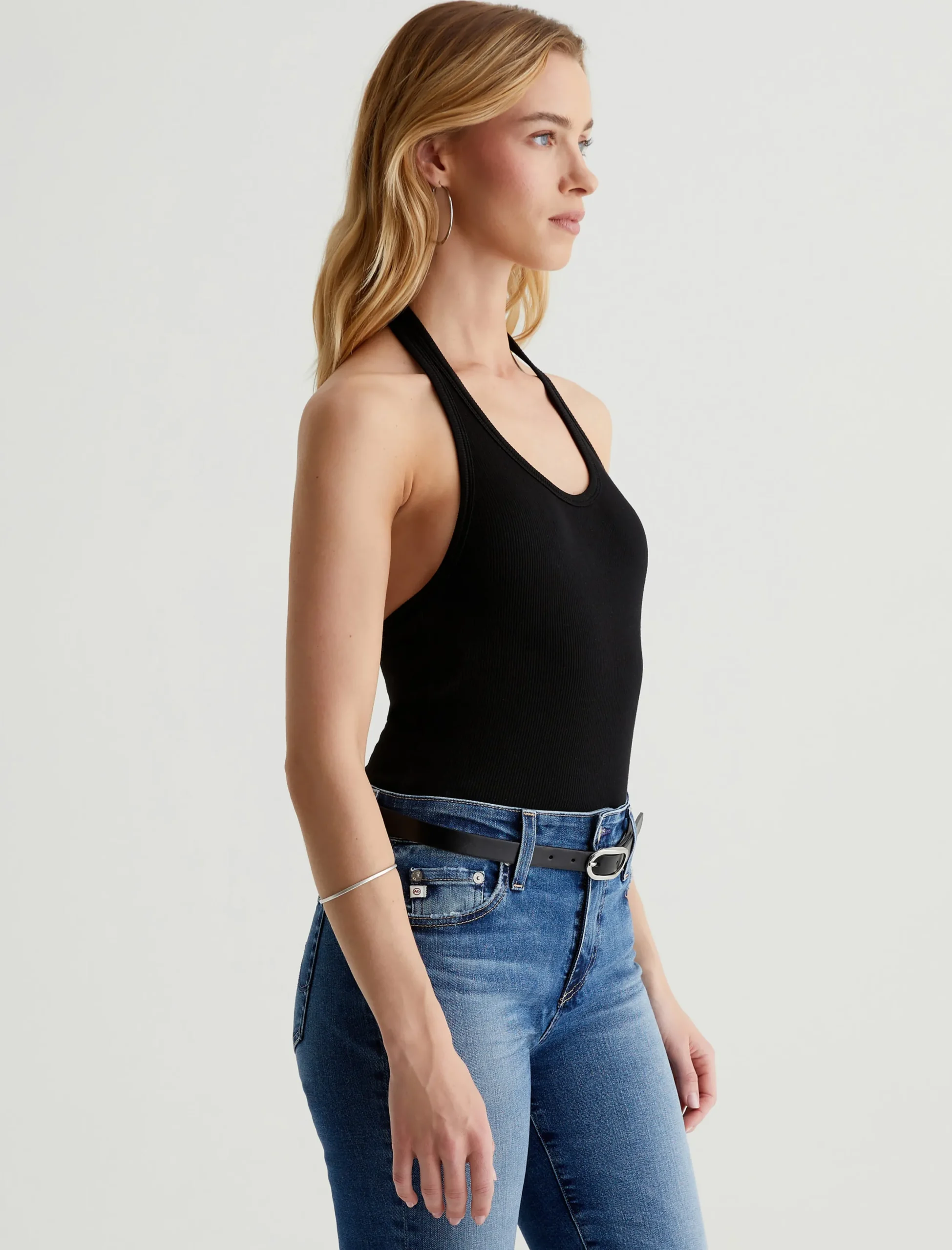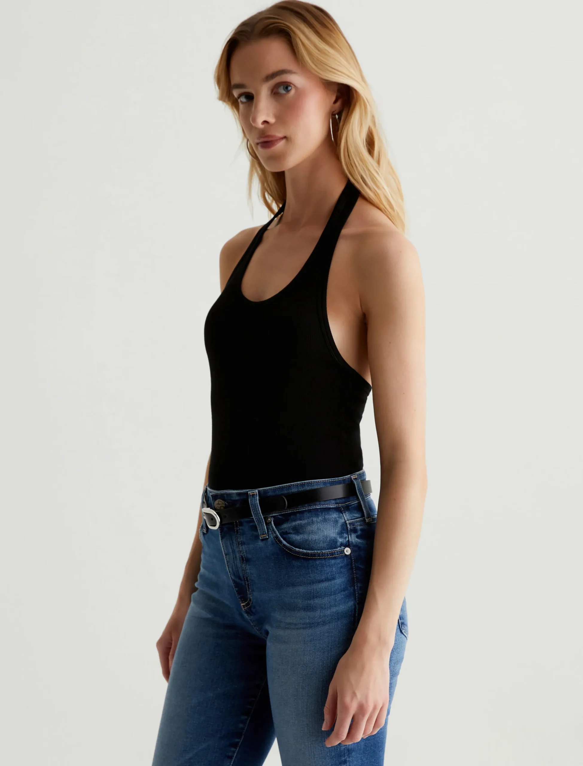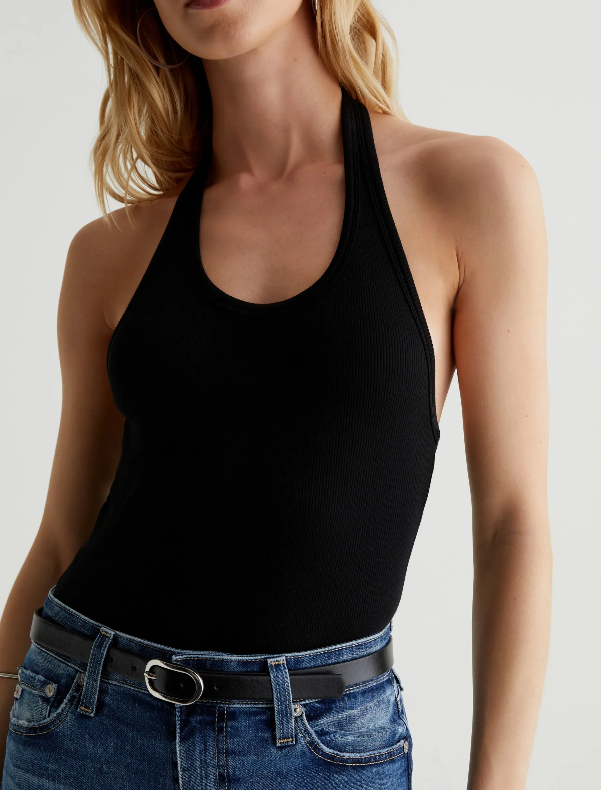 The Jay tank is a slim-fit halter top with an open back. Simple and chic in classic black, it’s designed in a soft, cotton-blend stretch rib knit that clings to the figure.