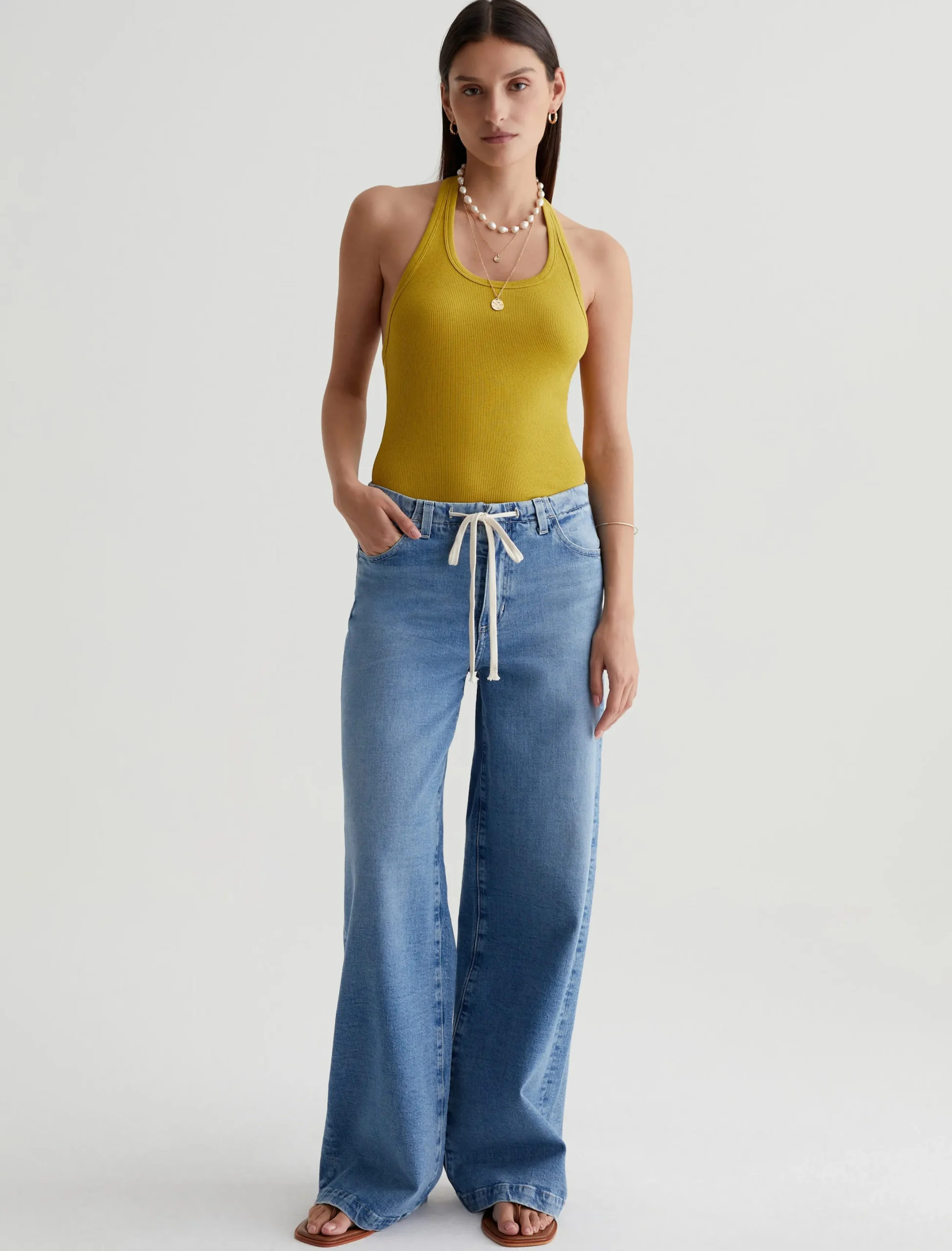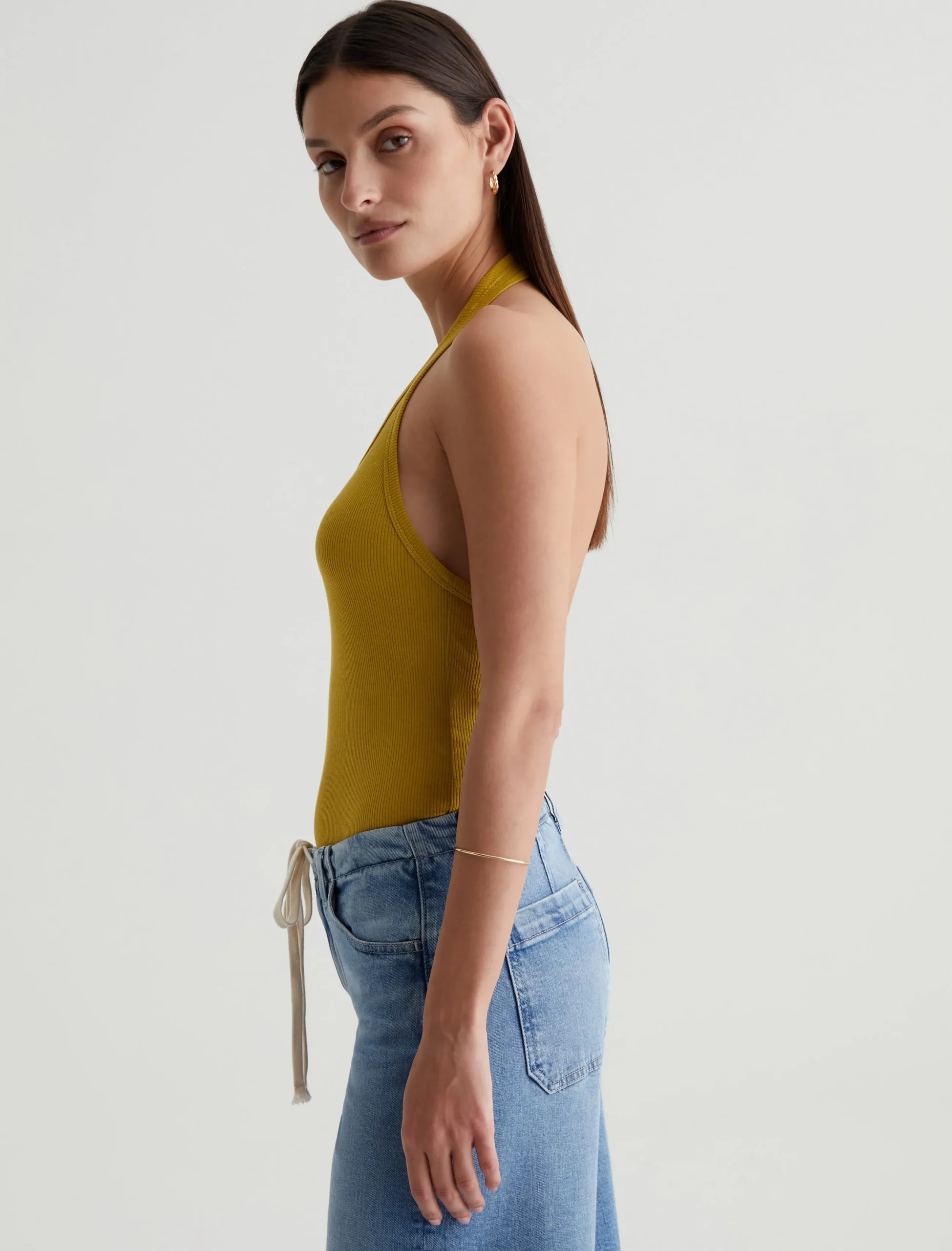 The Jay tank is a slim-fit halter top with an open back. Featuring a attention-grabbing yellow-green shade, it’s designed in a soft, cotton-blend stretch rib knit that clings to the figure.