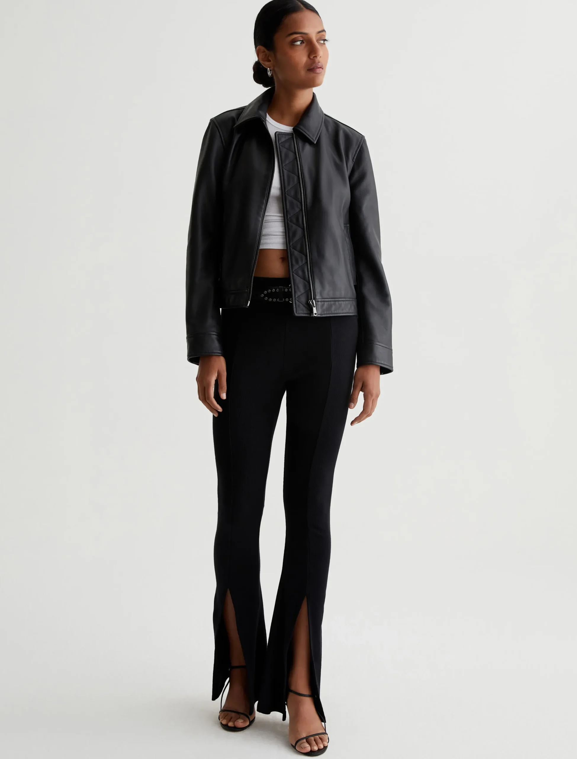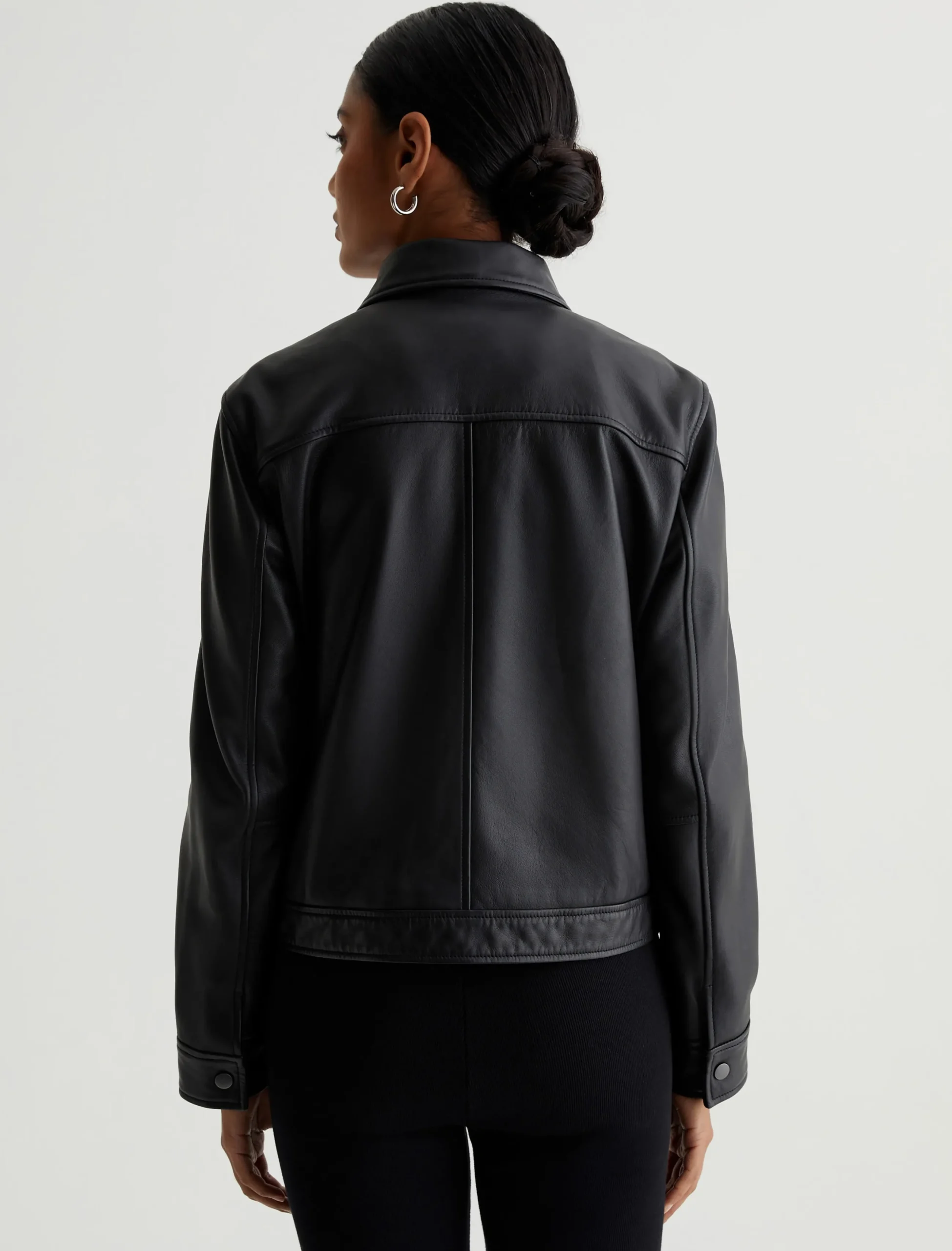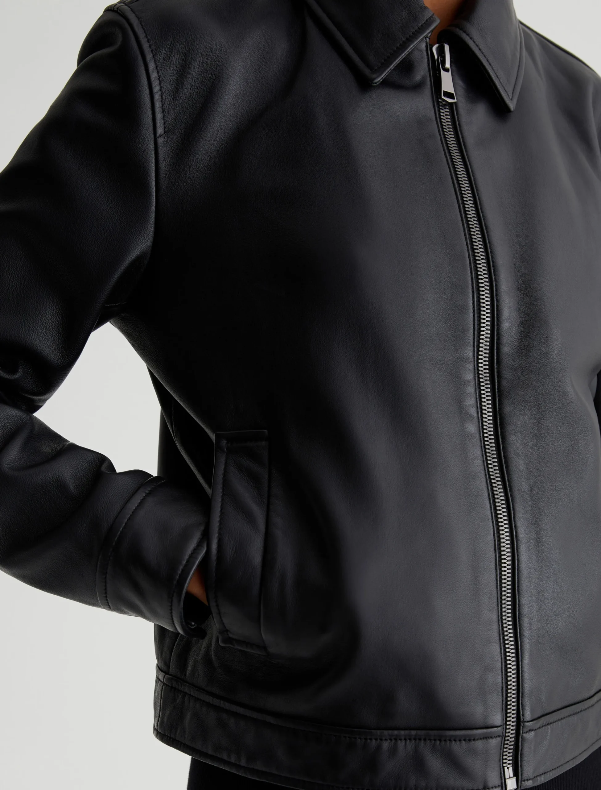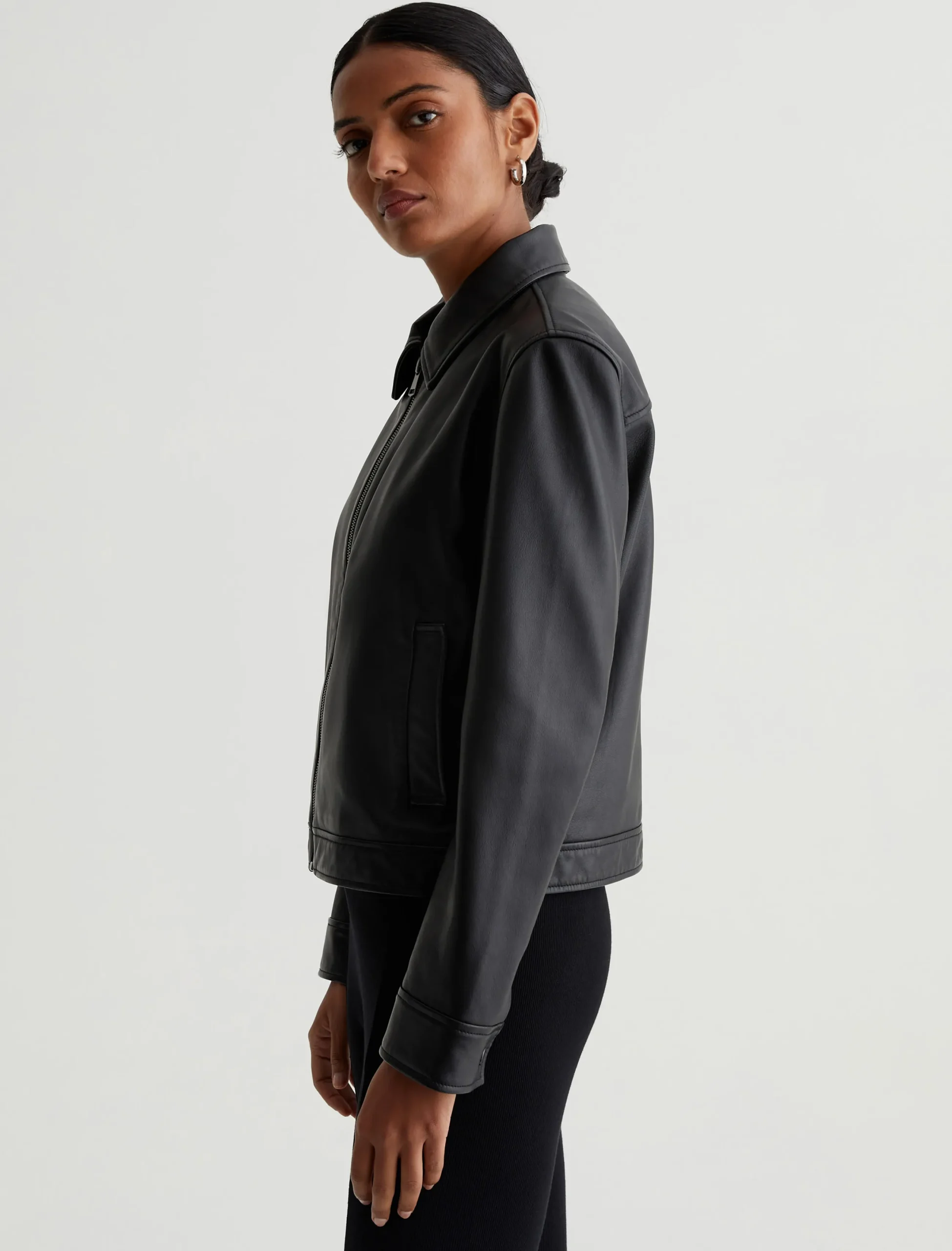 Designed in supple black lambskin leather, our Jayen Jacket is a classic bomber style that you’ll wear now and years from now. It’s got a slightly shrunken silhouette with a pointed collar, zip placket, and welt pockets at the front. Snap cuffs finish the look.