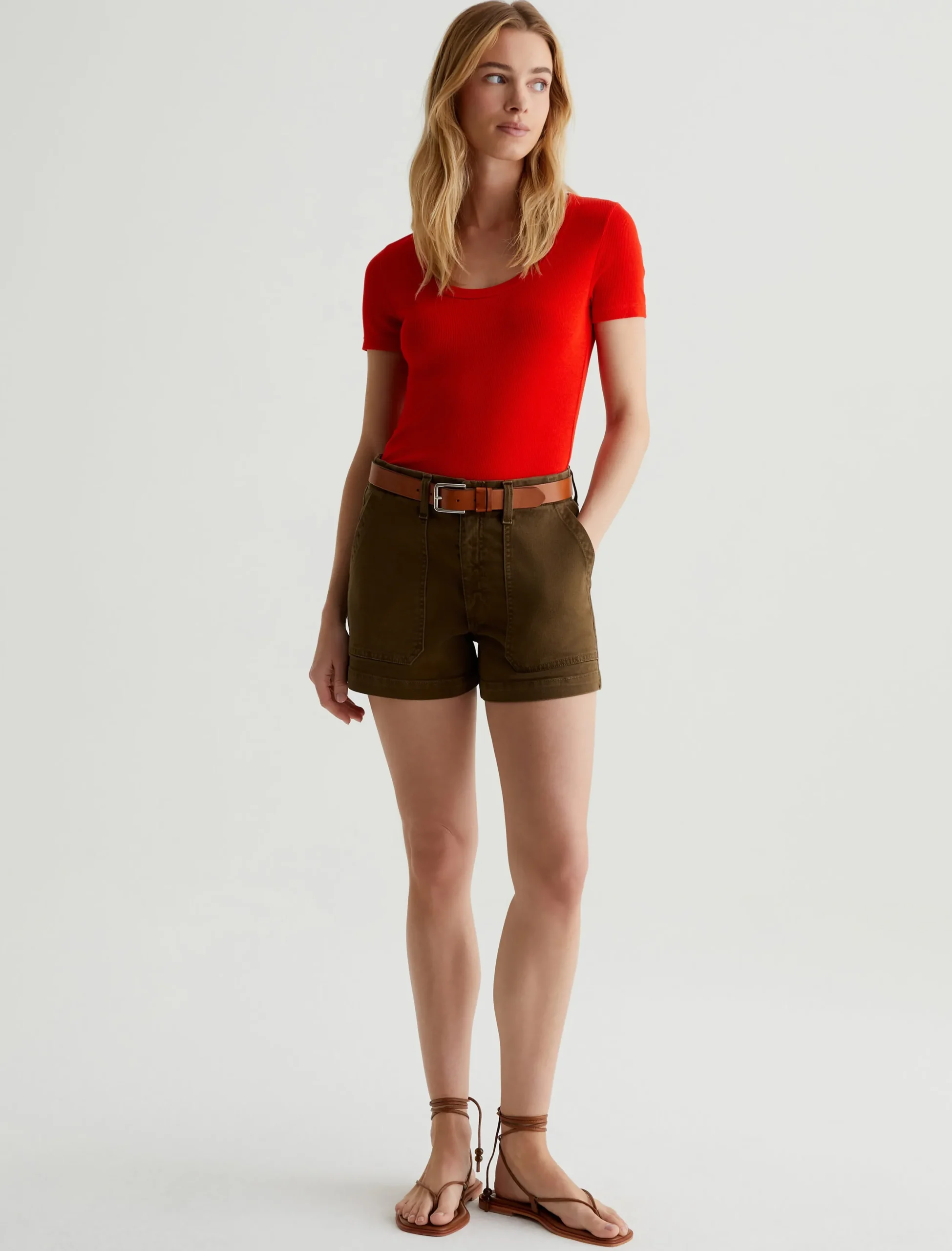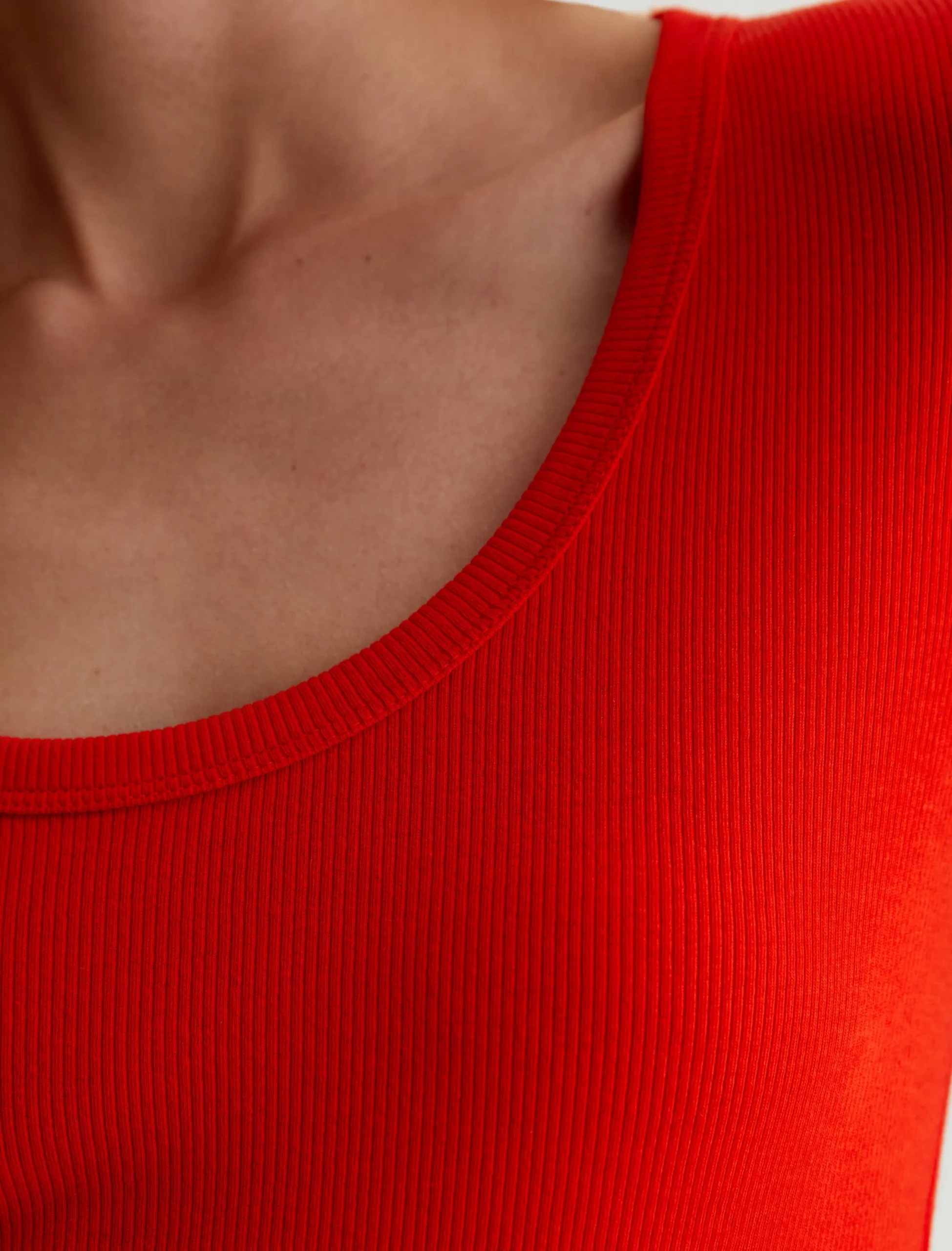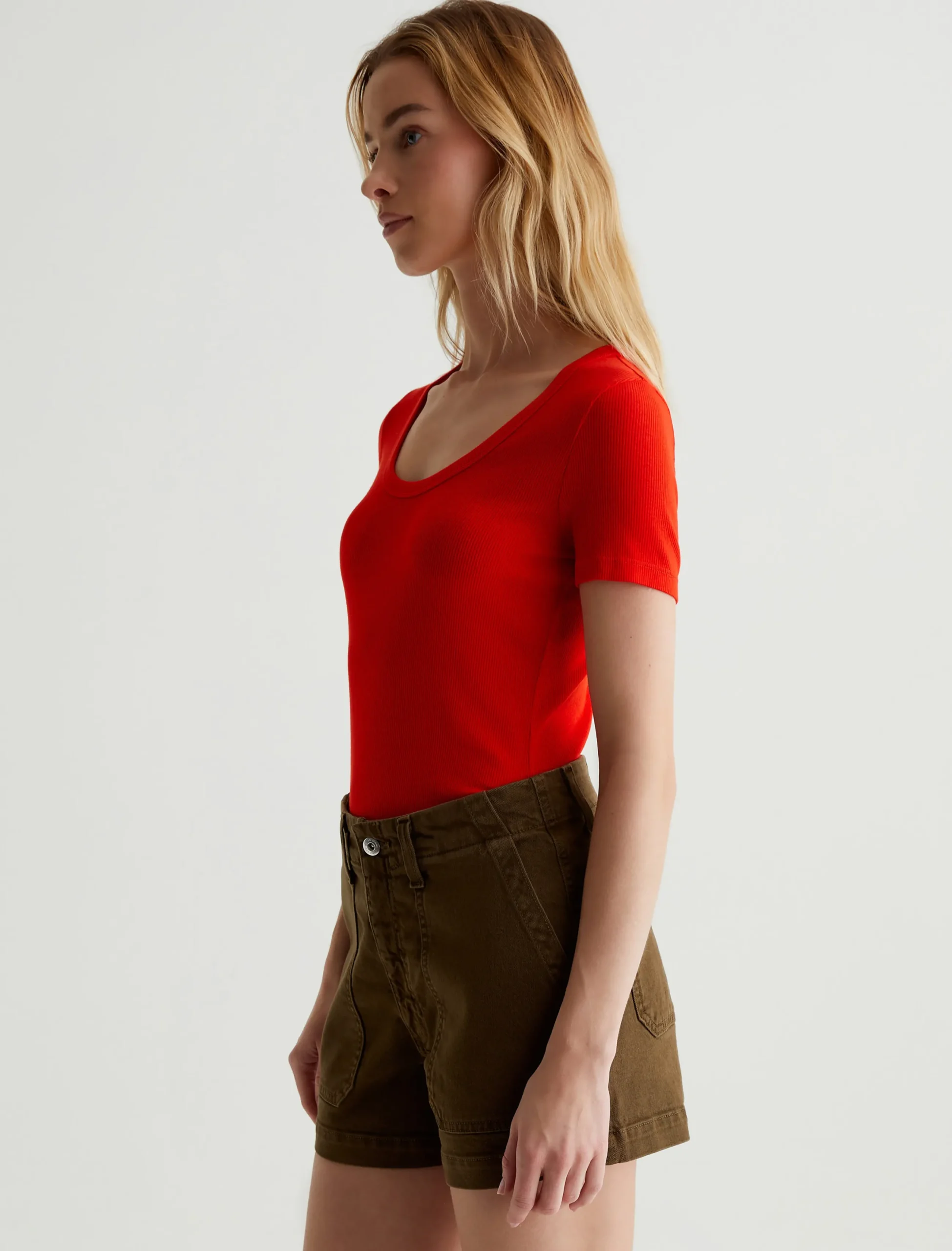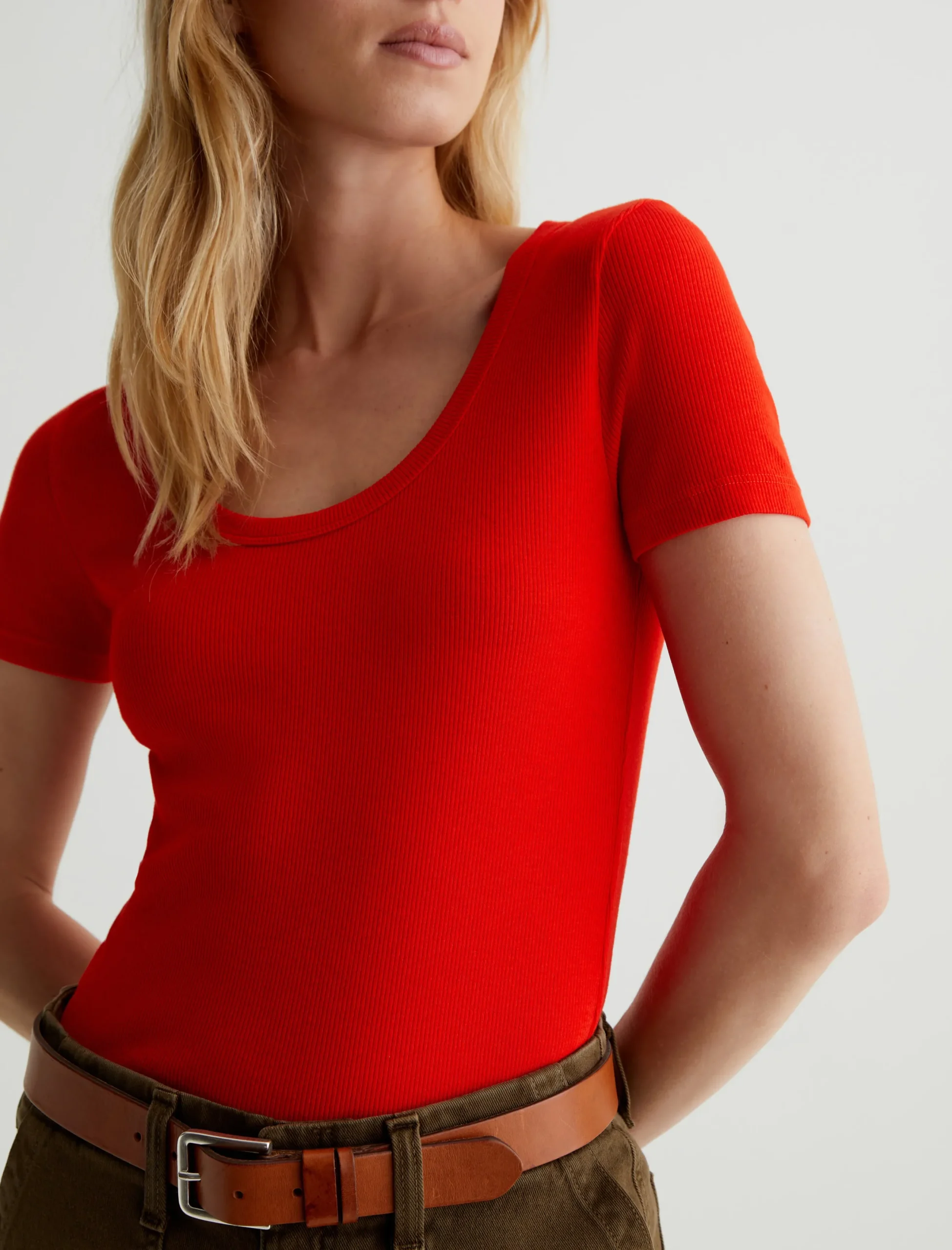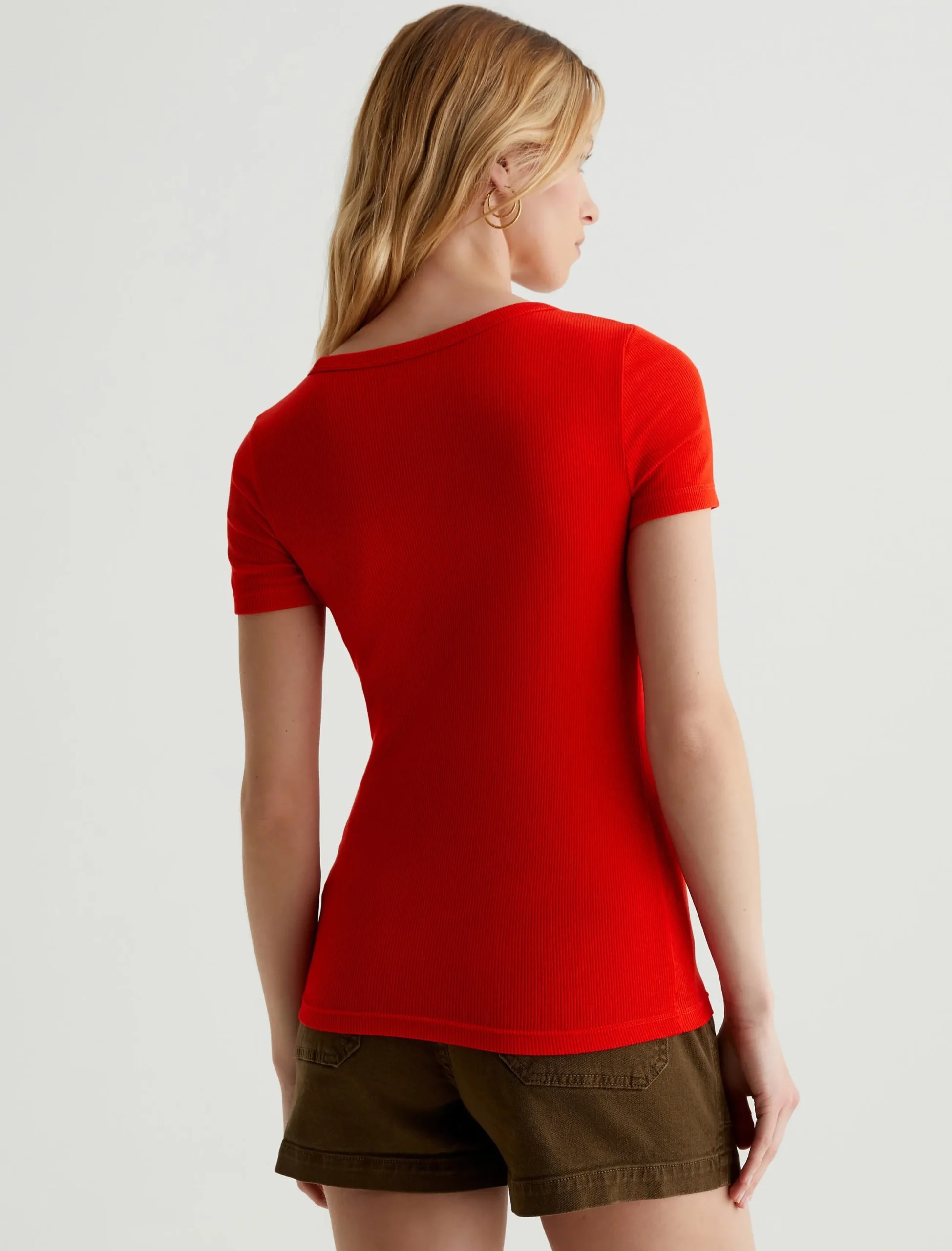The Jessie Top in red adds a punch of color to any ensemble. Cut from a soft stretch-blend rib knit, this short-sleeve T-shirt has a slim, body-tracing fit and a scoop neckline with thick binding. Perfect for layering, it’s an effortless way to elevate your everyday wardrobe.