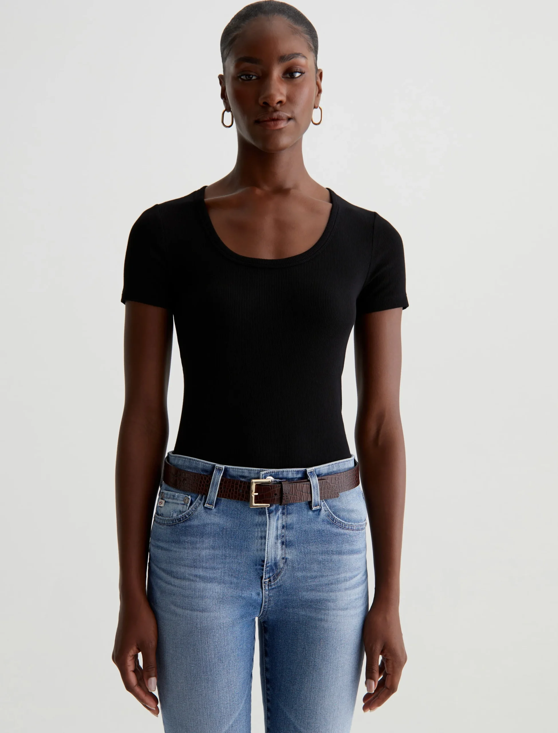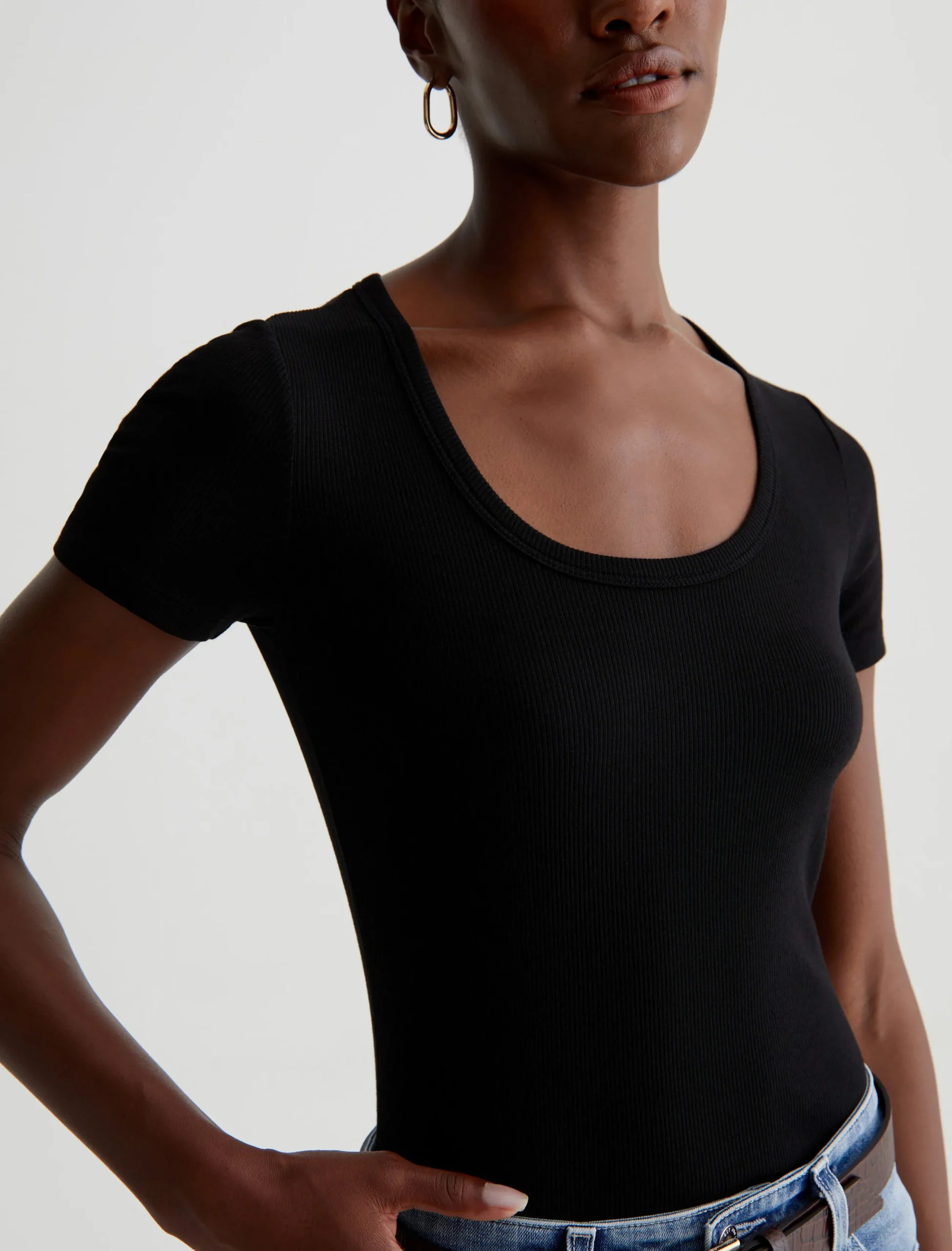 An effortless addition to your everyday wardrobe. Cut from a soft stretch-blend rib knit, our Jessie Top features a slim, body-tracing fit and a scoop neckline with thick binding. Done here in black, this short-sleeve T-shirt is perfect for layering from season to season.