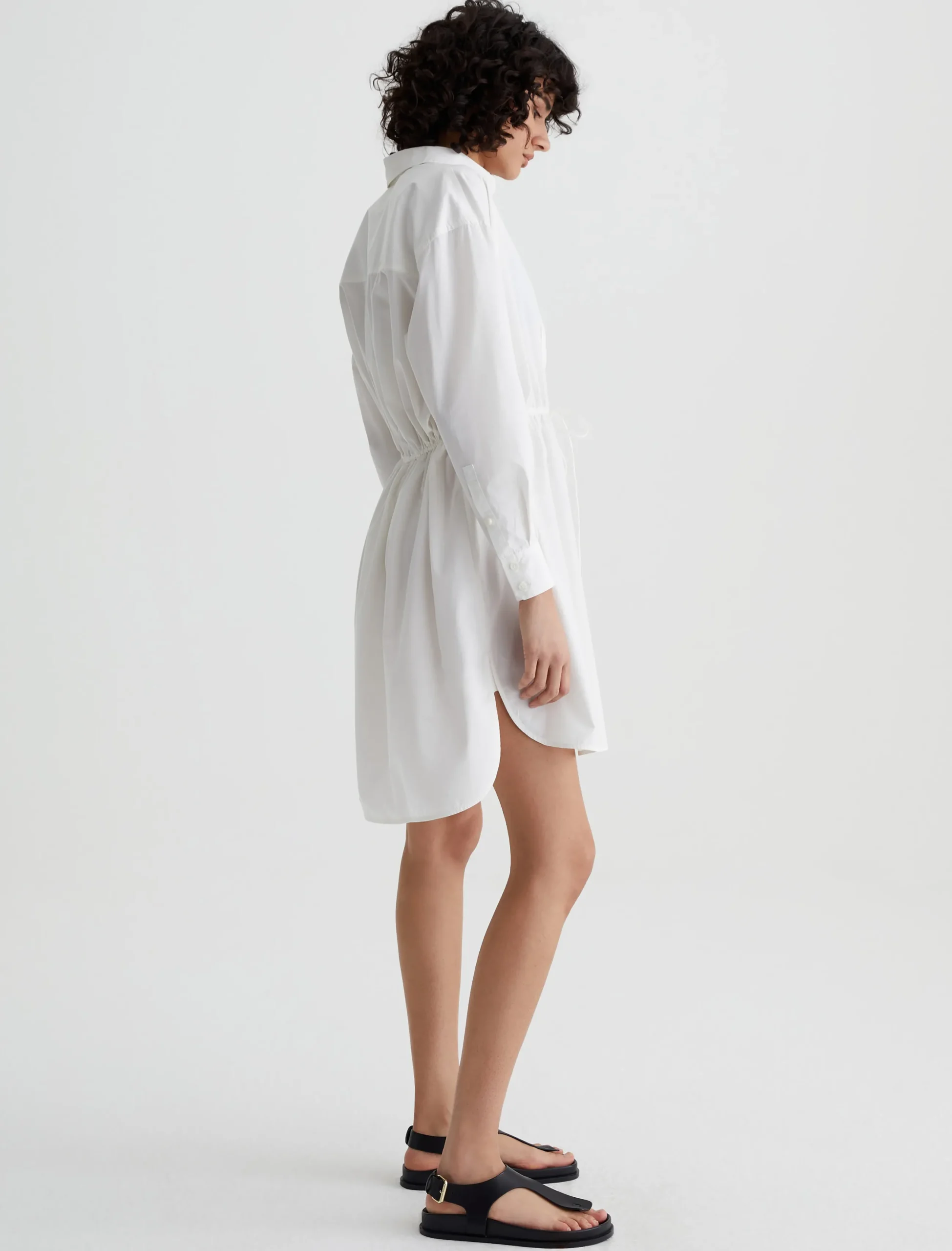 The Jolie Shirt Dress in white has a relaxed fit with pleated long sleeves, a button-up front placket, and a dainty drawstring that lets you adjust the shape. Made from 100% cotton poplin, it’s got a crisp, cool feel and a refined look.