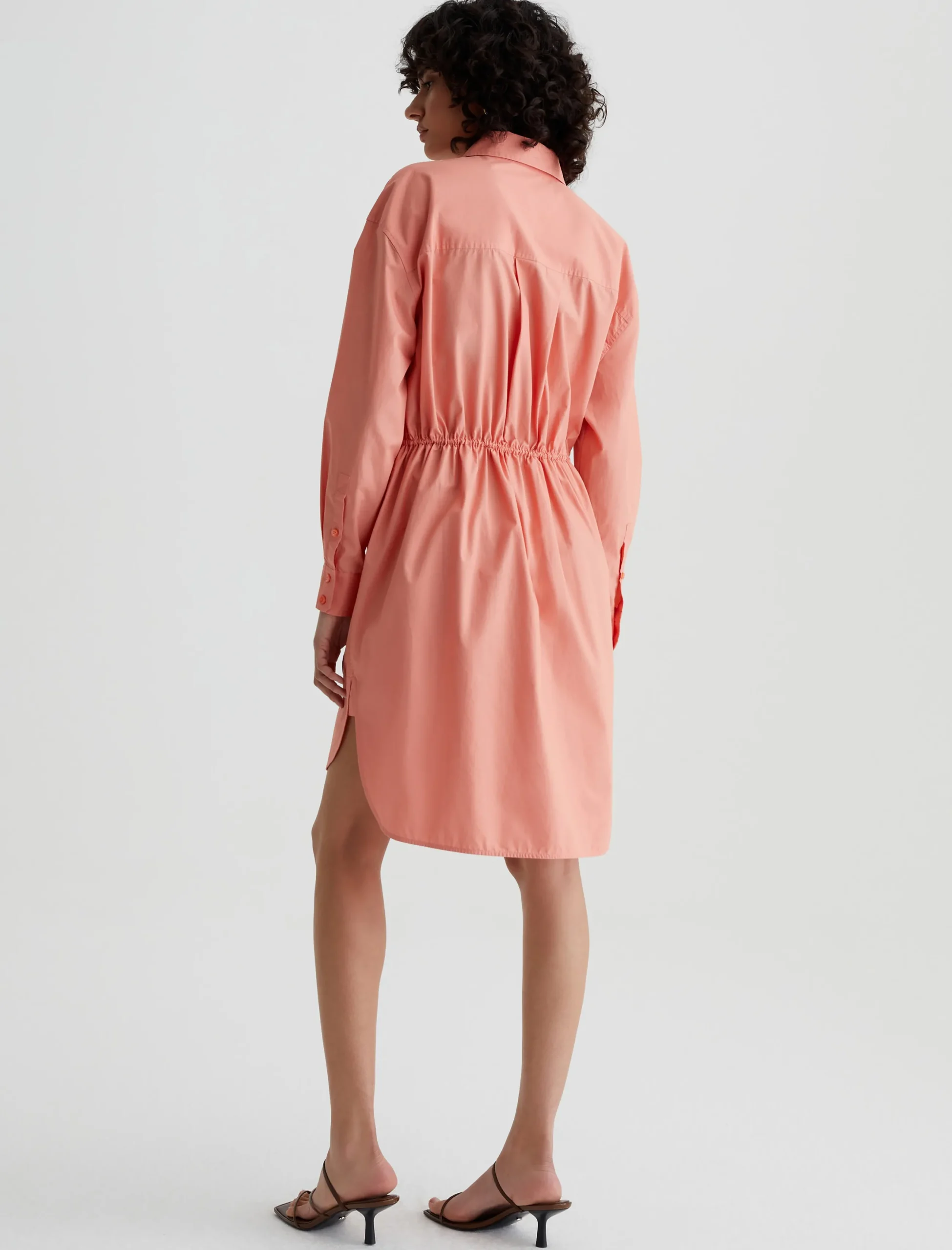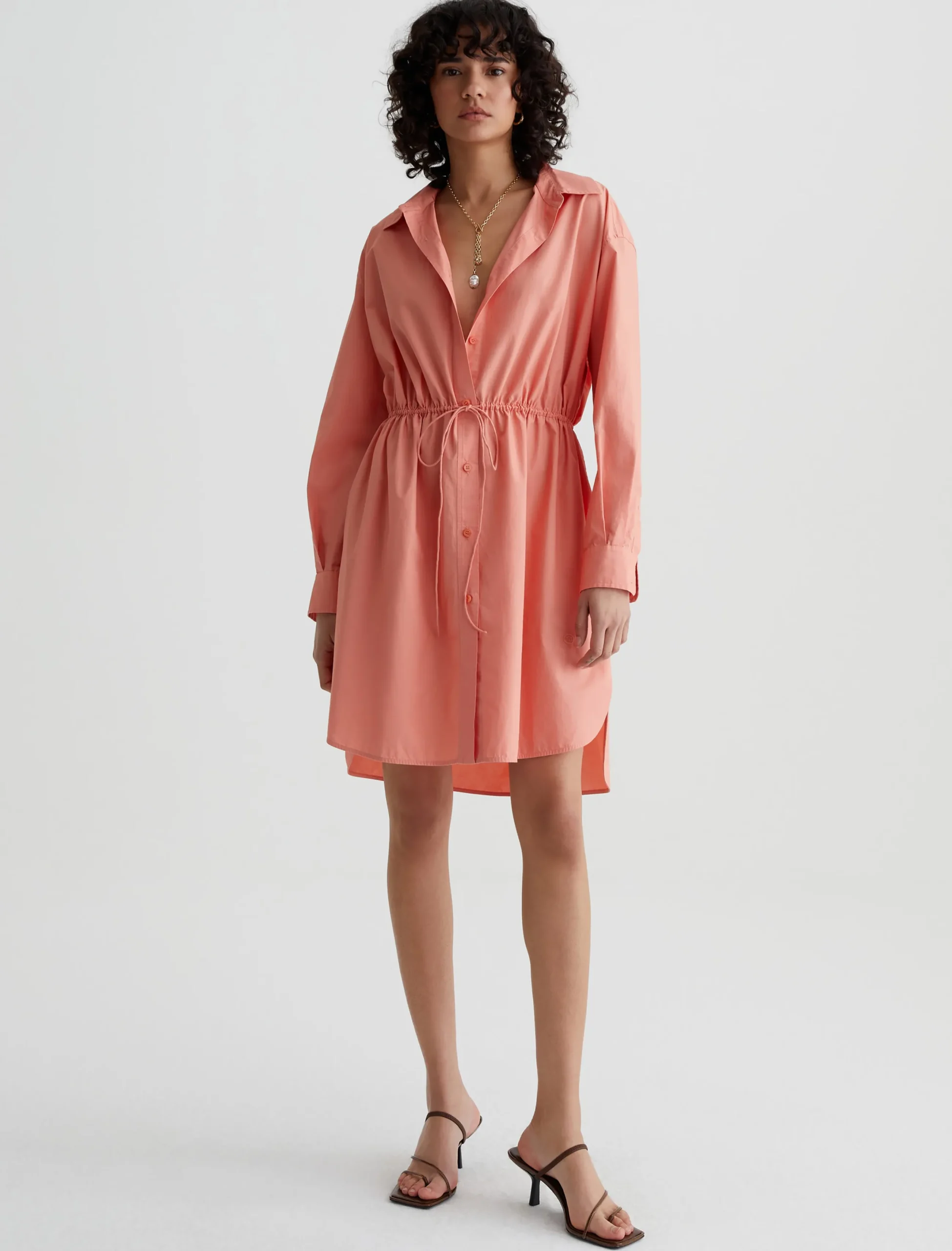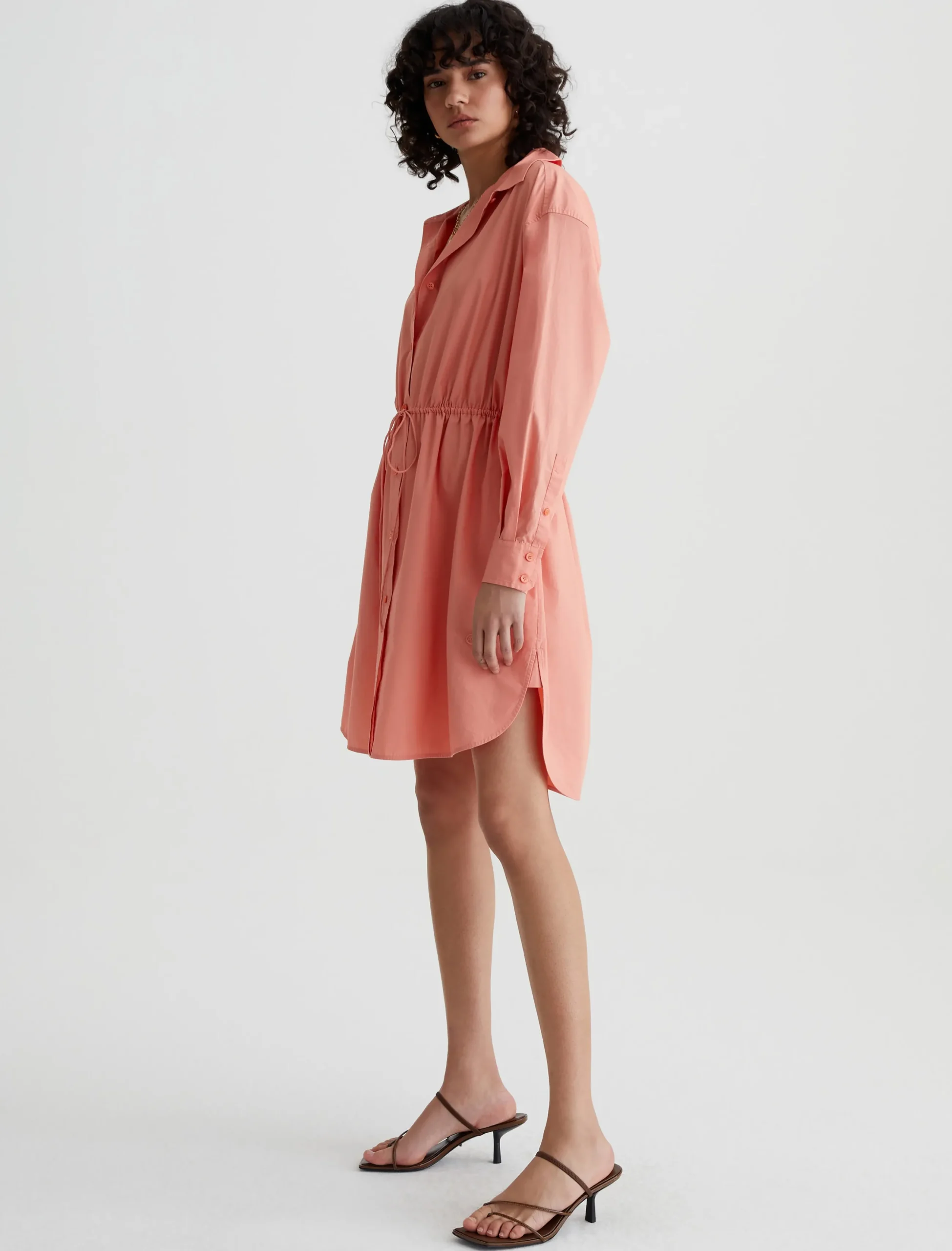 The Jolie Shirt Dress in Pink Peach has a relaxed fit with pleated long sleeves, a button-up front placket, and a dainty drawstring that lets you adjust the shape. Made from 100% cotton poplin, it’s got a crisp, cool feel and a refined look.