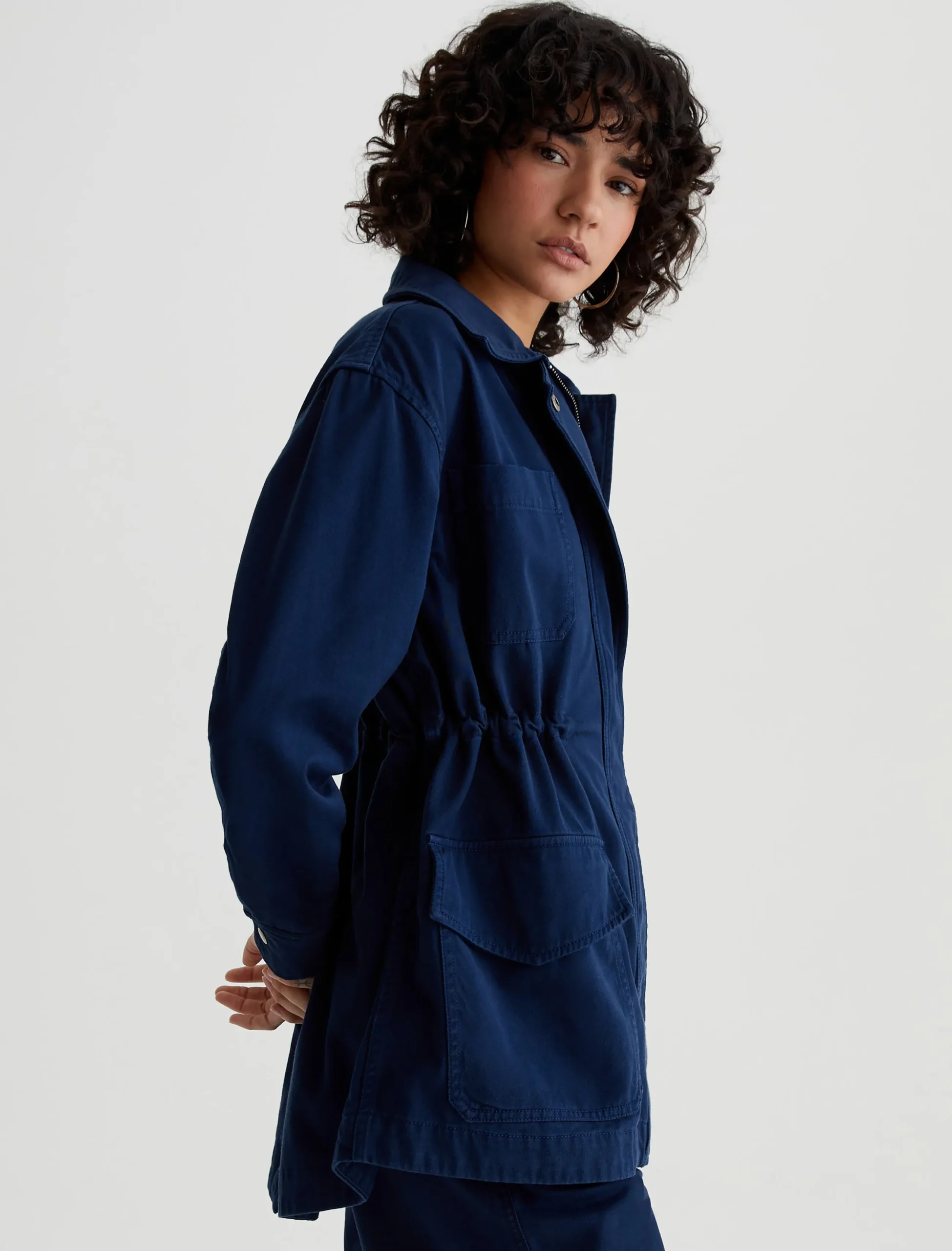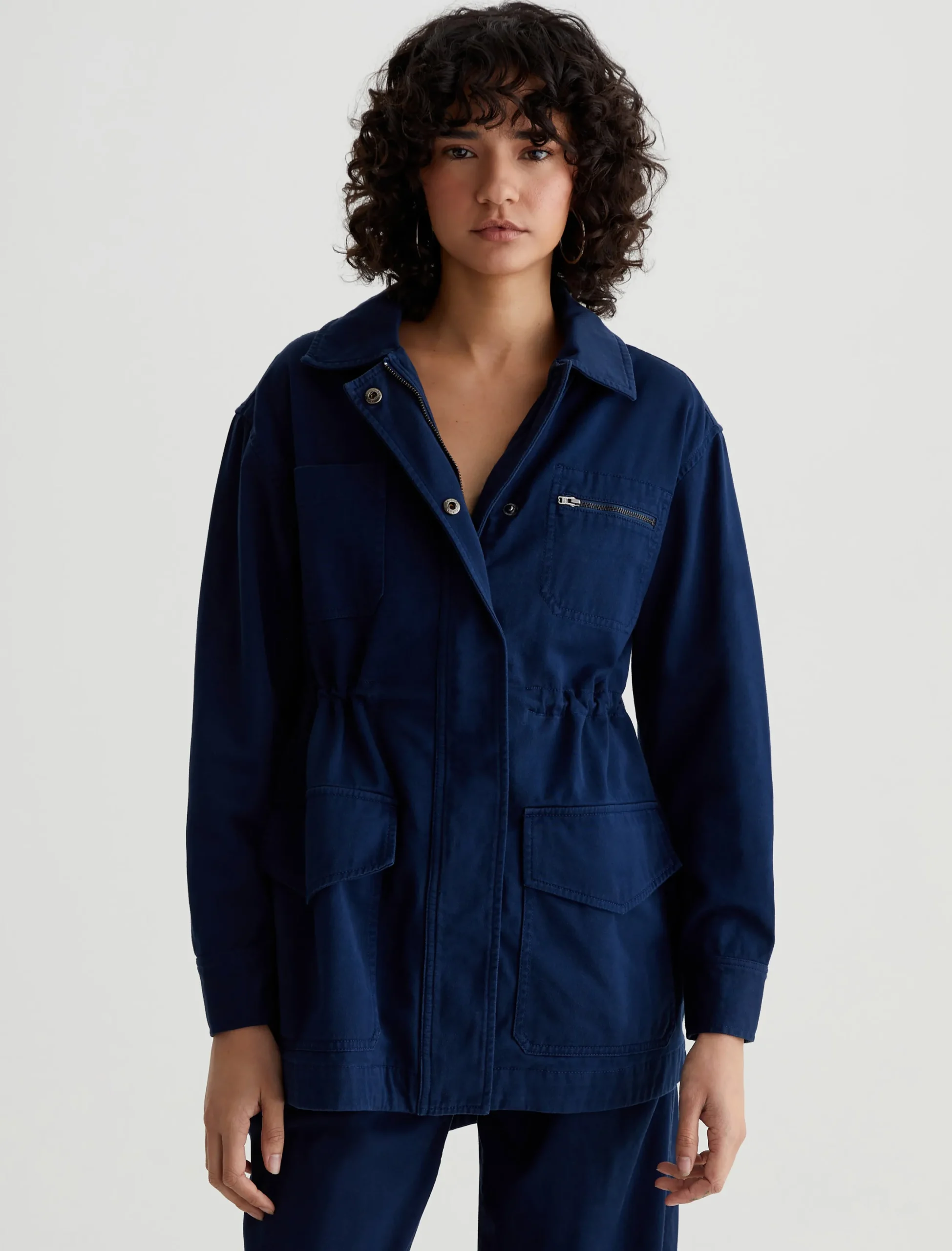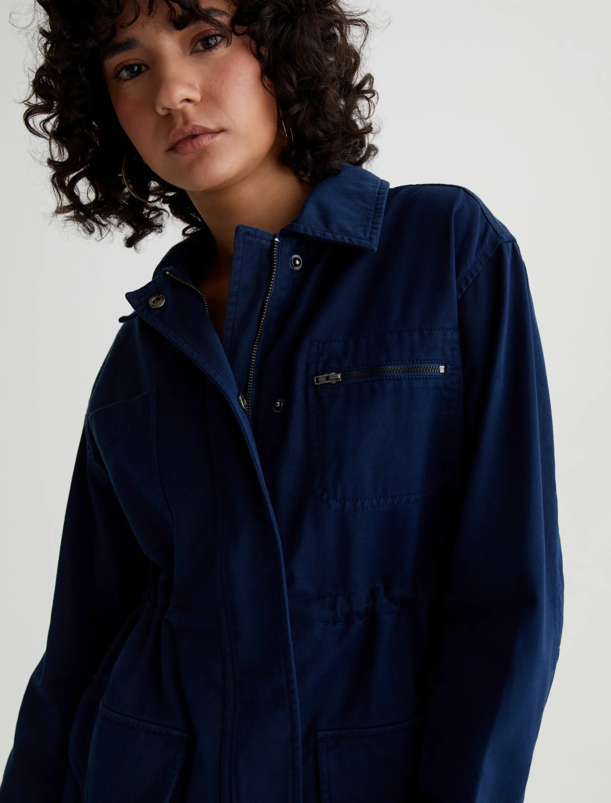 The Josephine Jacket offers a modern interpretation on classic utility styling. Cut from 100% cotton sateen in a deep navy shade, it’s cut for a relaxed fit and shaped by an adjustable interior drawcord. Complete with patch pockets, exposed zipper detailing, and a zip front concealed by a storm placket with metal snaps.