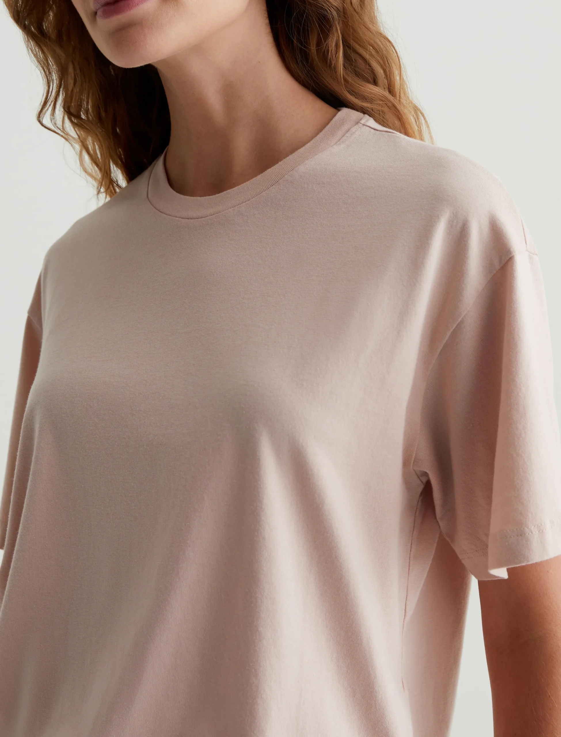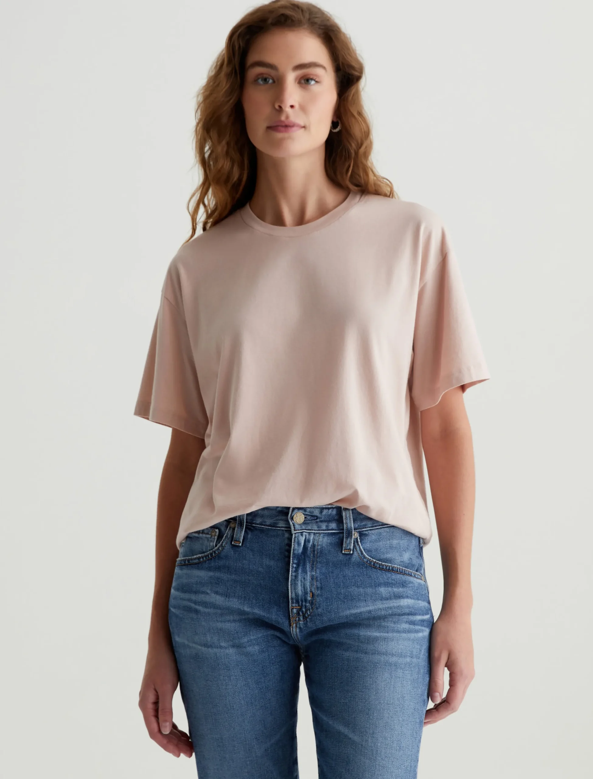 The Karter Ex-Boyfriend S/S Crew in vintage pink is our first introduction to a relaxed fit short sleeve crew. Drop shoulders creates a modern, oversized take on the “borrowed from your boyfriend” look. Our Jersey Knit offers a luxurious comfort that is unrivaled—knitted with both S-twist and Z-twist yarn to sustain longevity and stability, preventing unnecessary twisting and torquing. During the production process, the S-twist yarn is spun counter-clockwise creating a right-handed twill. The Z-twist yarn works in opposition, spinning clockwise for a left-handed twill. This opposition—when working together—yields a softer, more durable fabrication and gives strength to the yarn making it more difficult to pull apart. Designed in 100% Cotton.