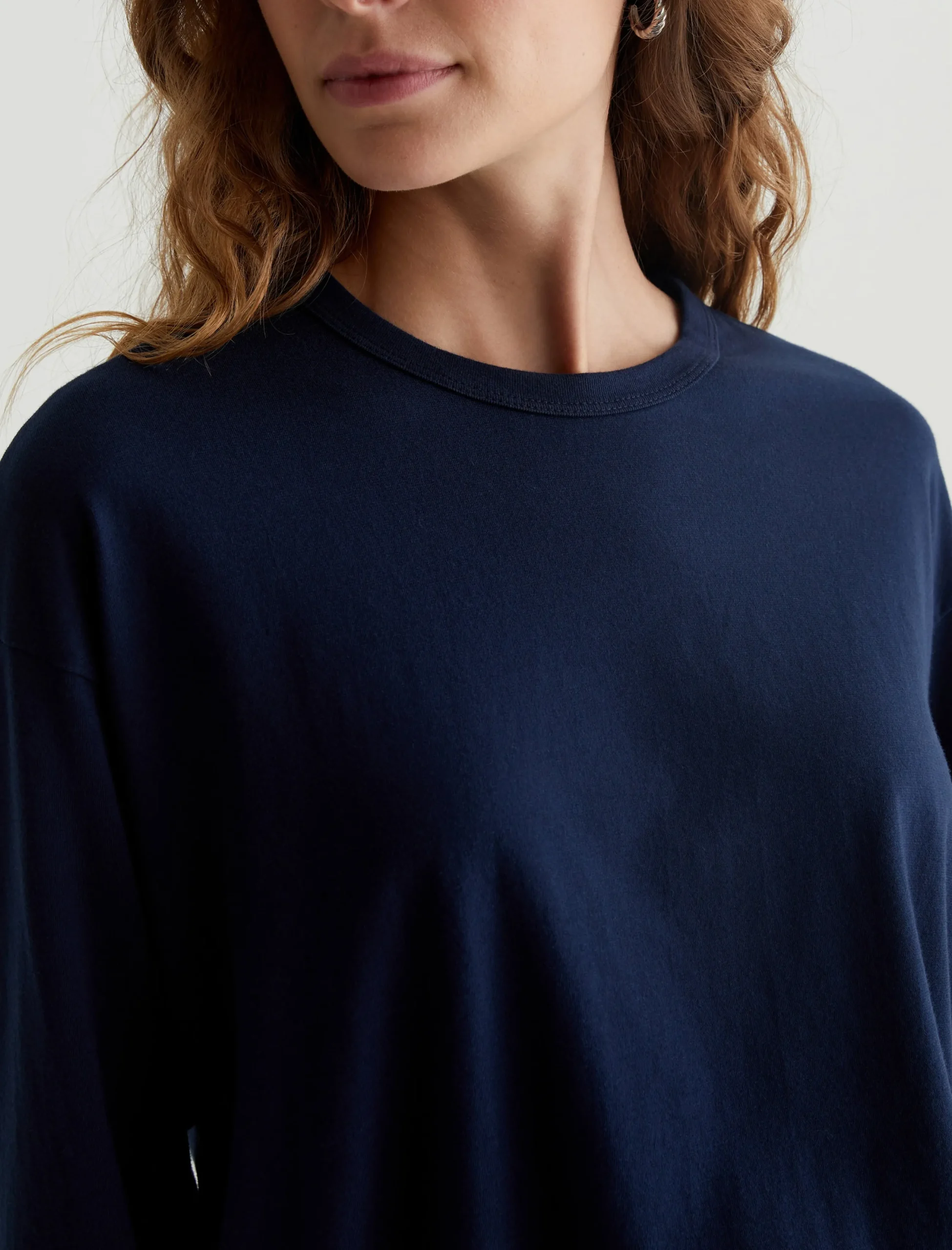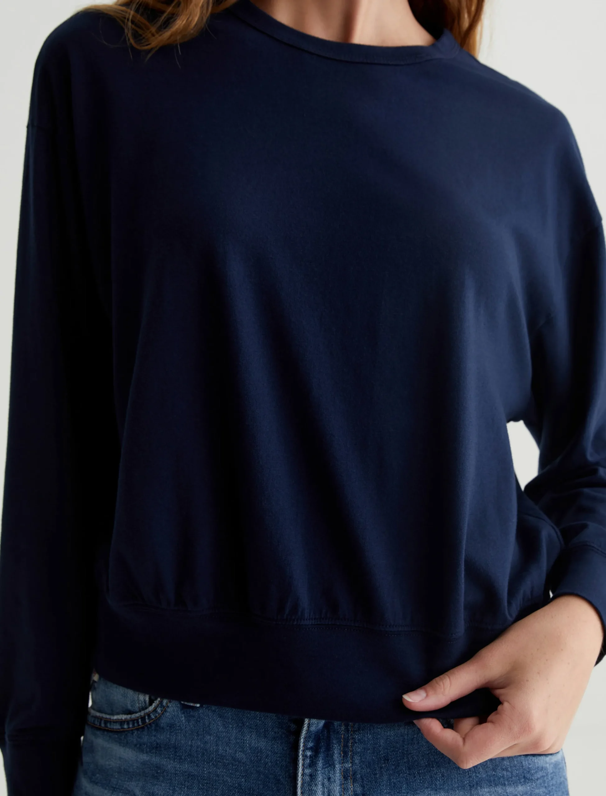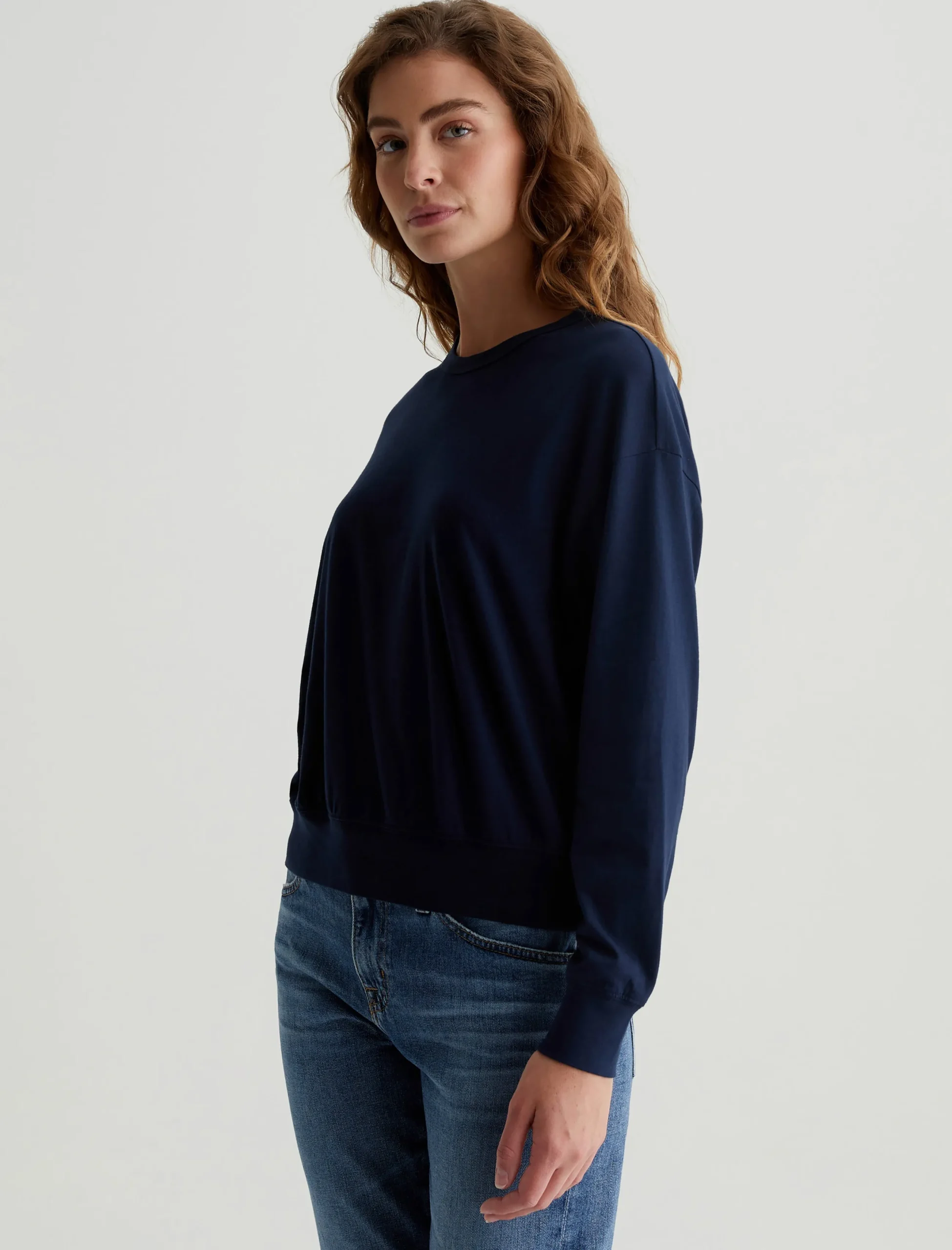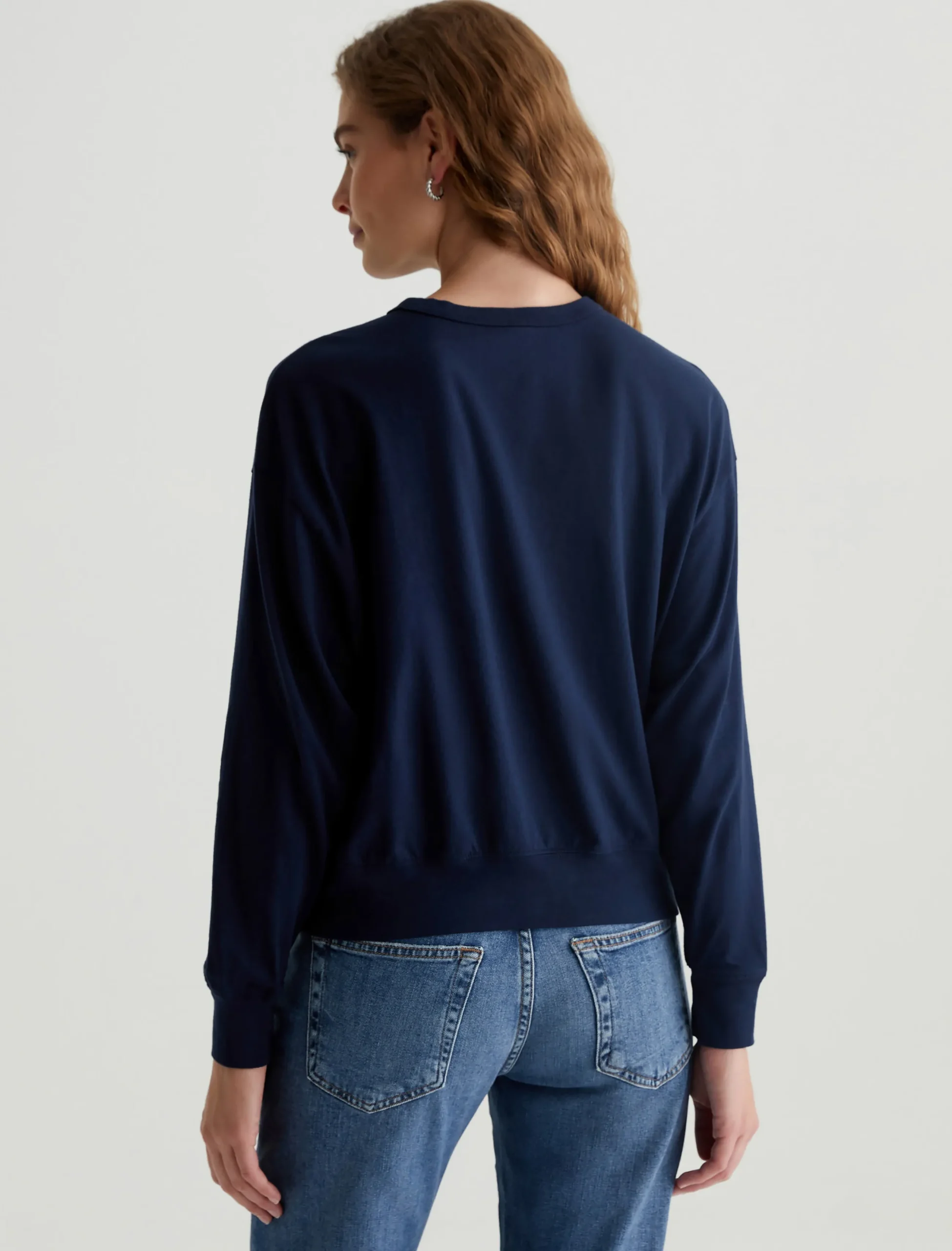 The Karter Pullover in deep navy is a new silhouette in our Basic Essentials collection. We borrowed the details of a sweatshirt including the rib binding, cuff, and bottom hem to make a great lightweight pullover. Our Jersey Knit offers a luxurious comfort that is unrivaled—knitted with both S-twist and Z-twist yarn to sustain longevity and stability, preventing unnecessary twisting and torquing. During the production process, the S-twist yarn is spun counter-clockwise creating a right-handed twill. The Z-twist yarn works in opposition, spinning clockwise for a left-handed twill. This opposition—when working together—yields a softer, more durable fabrication and gives strength to the yarn making it more difficult to pull apart. Designed in 100% Cotton.