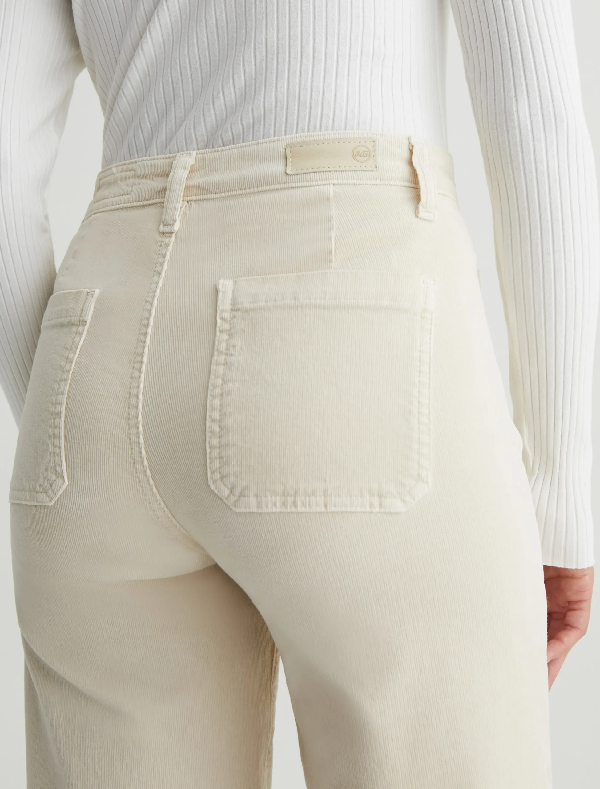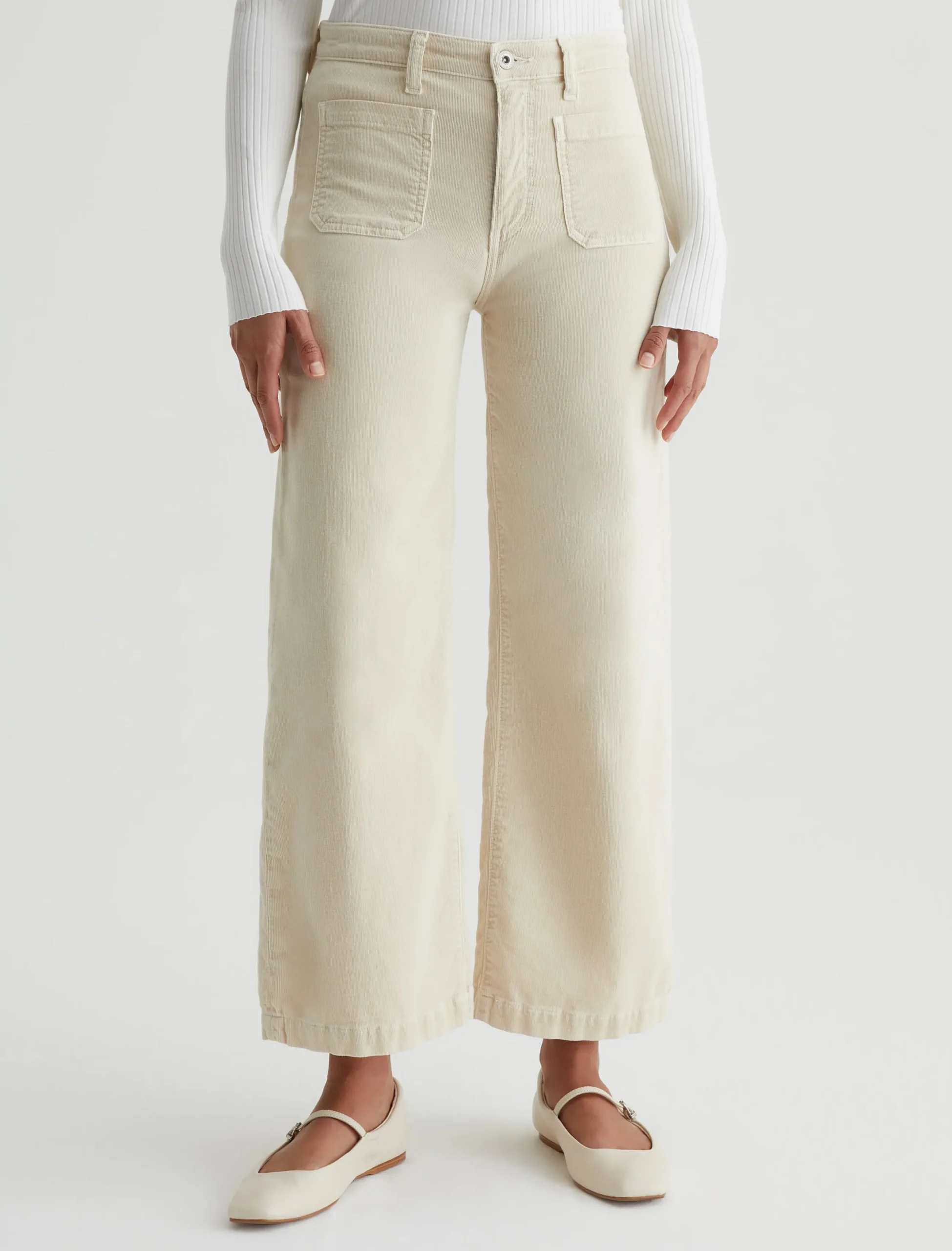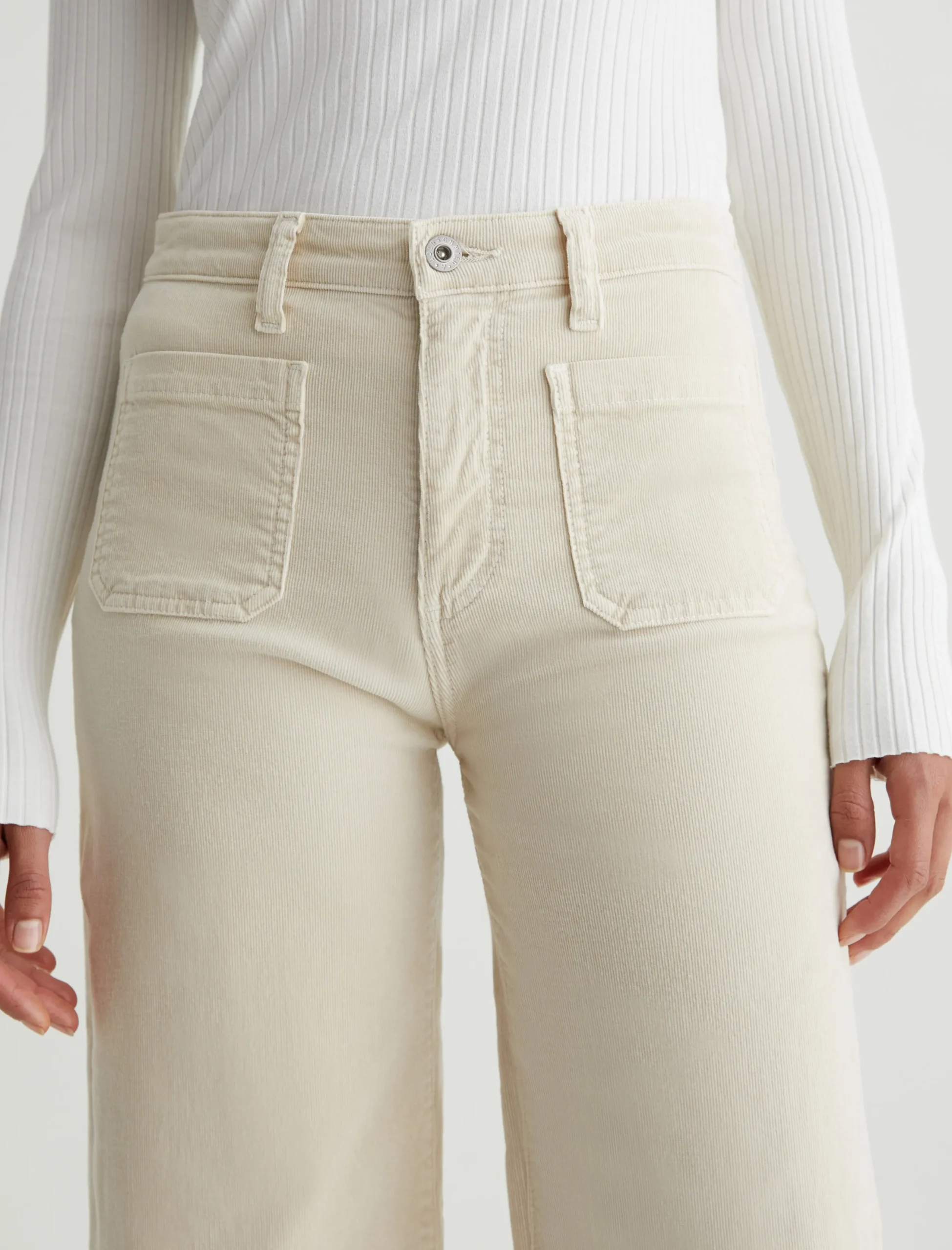 Kassie is a high-rise wide leg crop with utility-inspired patch pockets. This pair has a soft, velvety feel in a sulfur-dyed cream color.