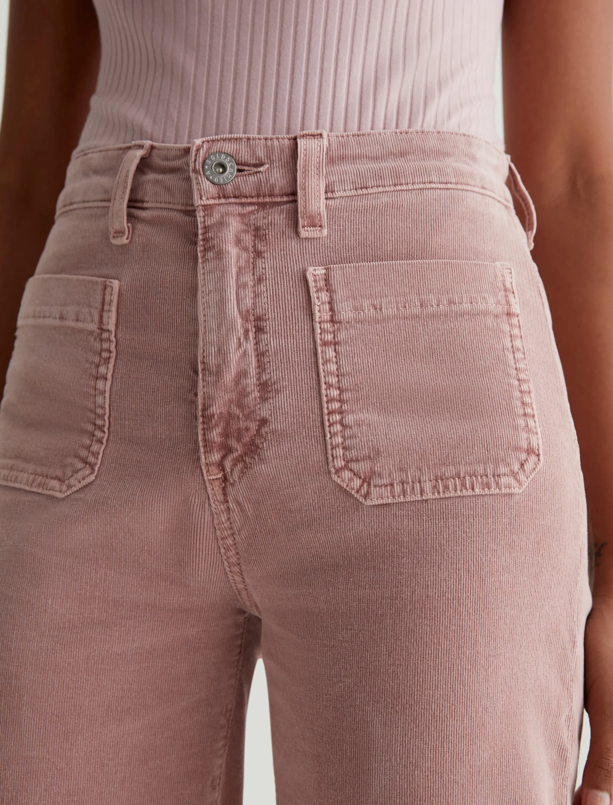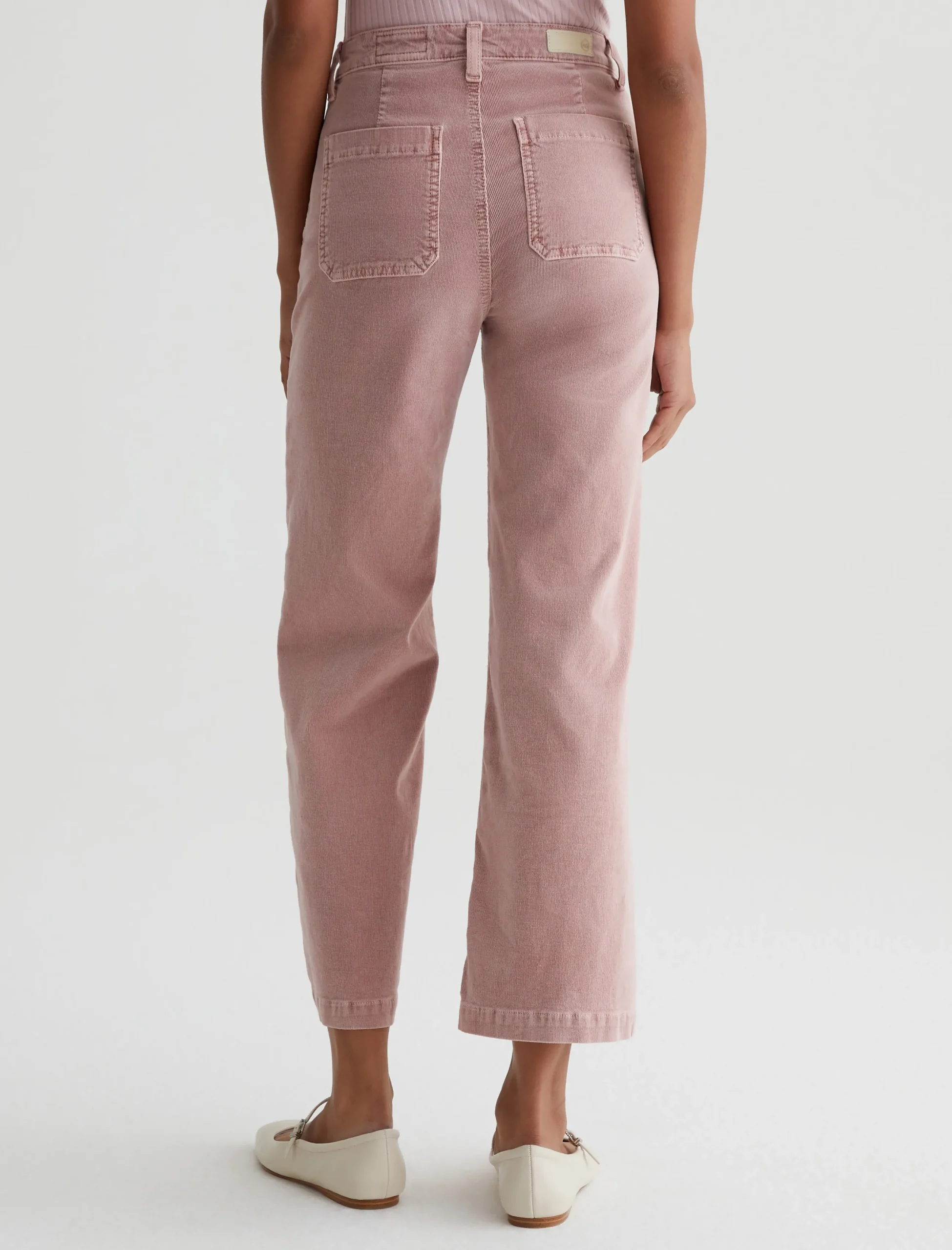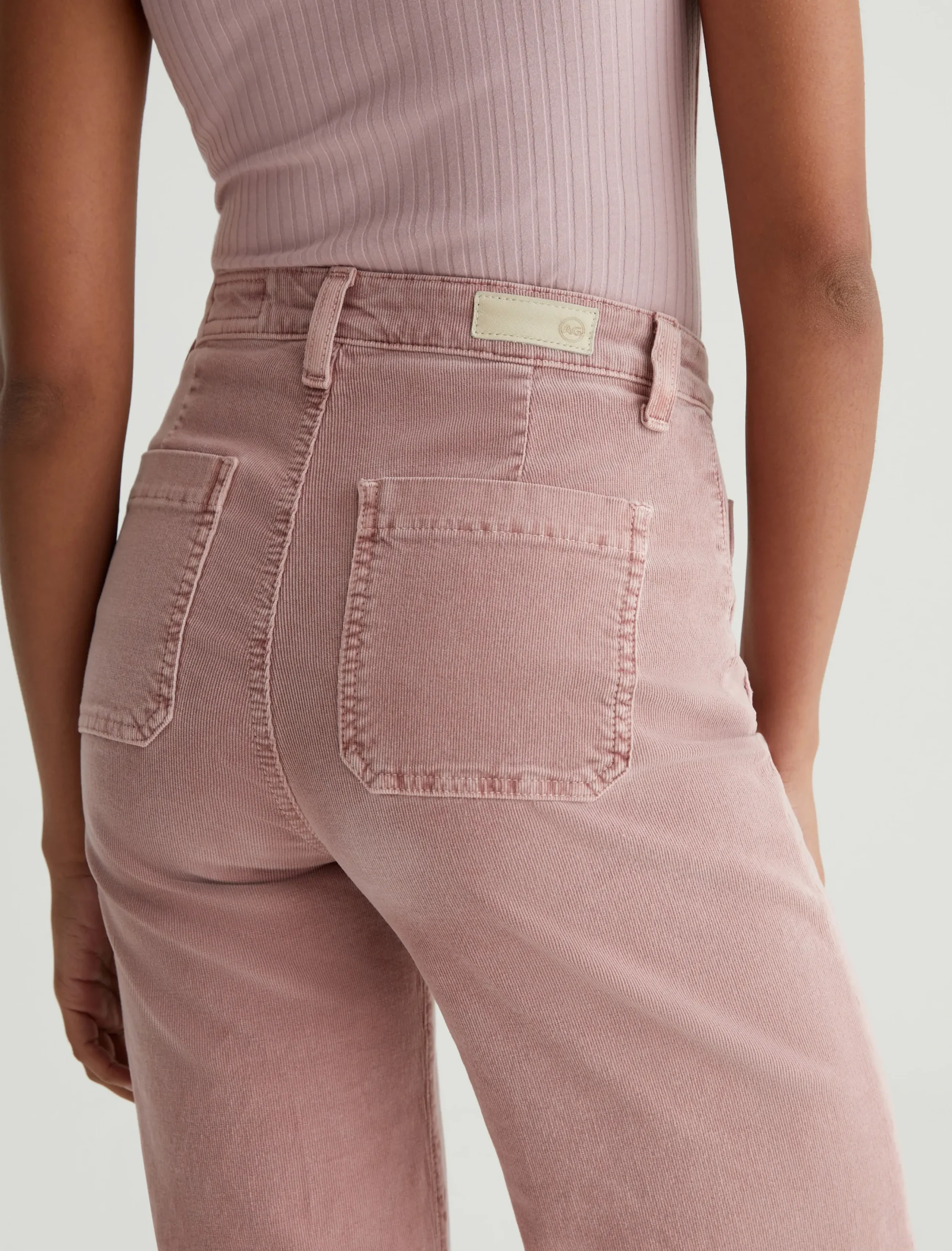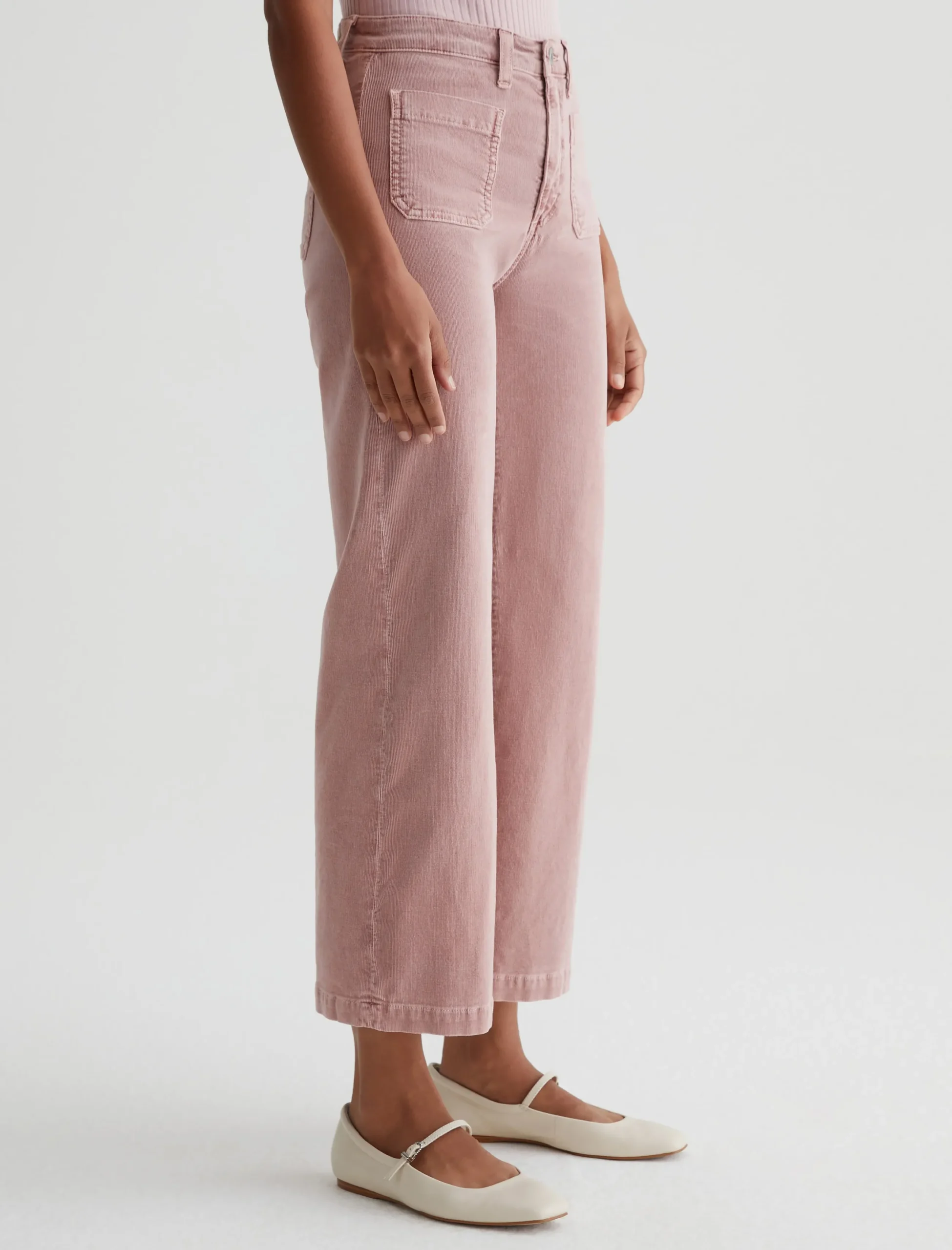 Kassie is a high-rise wide leg crop with utility-inspired patch pockets. This pair has a soft, velvety feel in blush-pink corduroy.